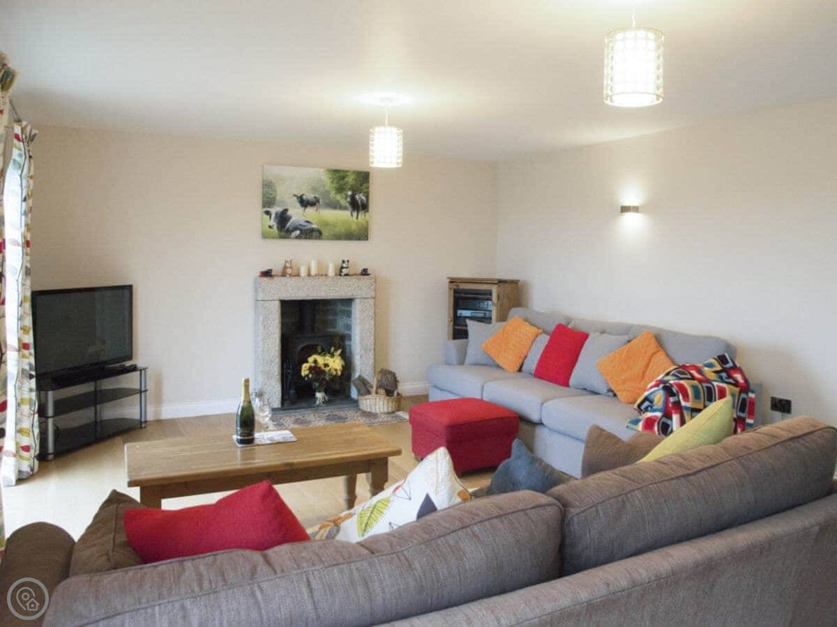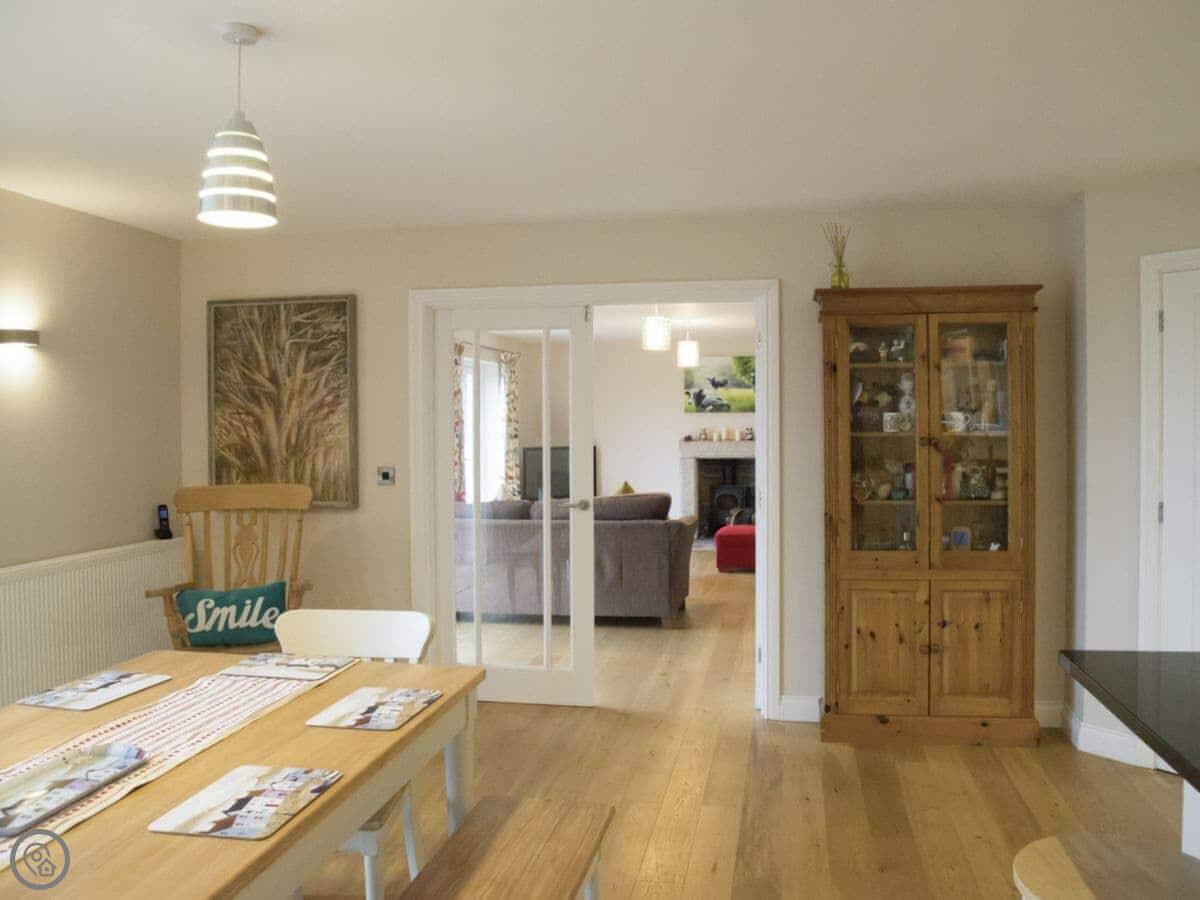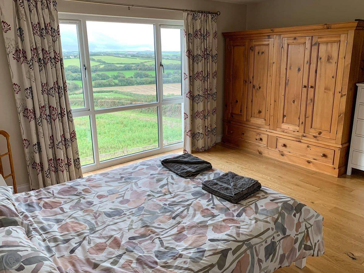 It sleeps eight. Four bedrooms and two bathrooms. It's got a 5 Star rating, which means it's well-equipped and kept to a high standard. The living room has a wood burner and big doors that open onto the patio. The view from there is over fields and you can see a bit of the sea in the distance.