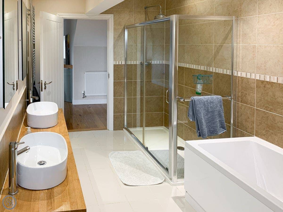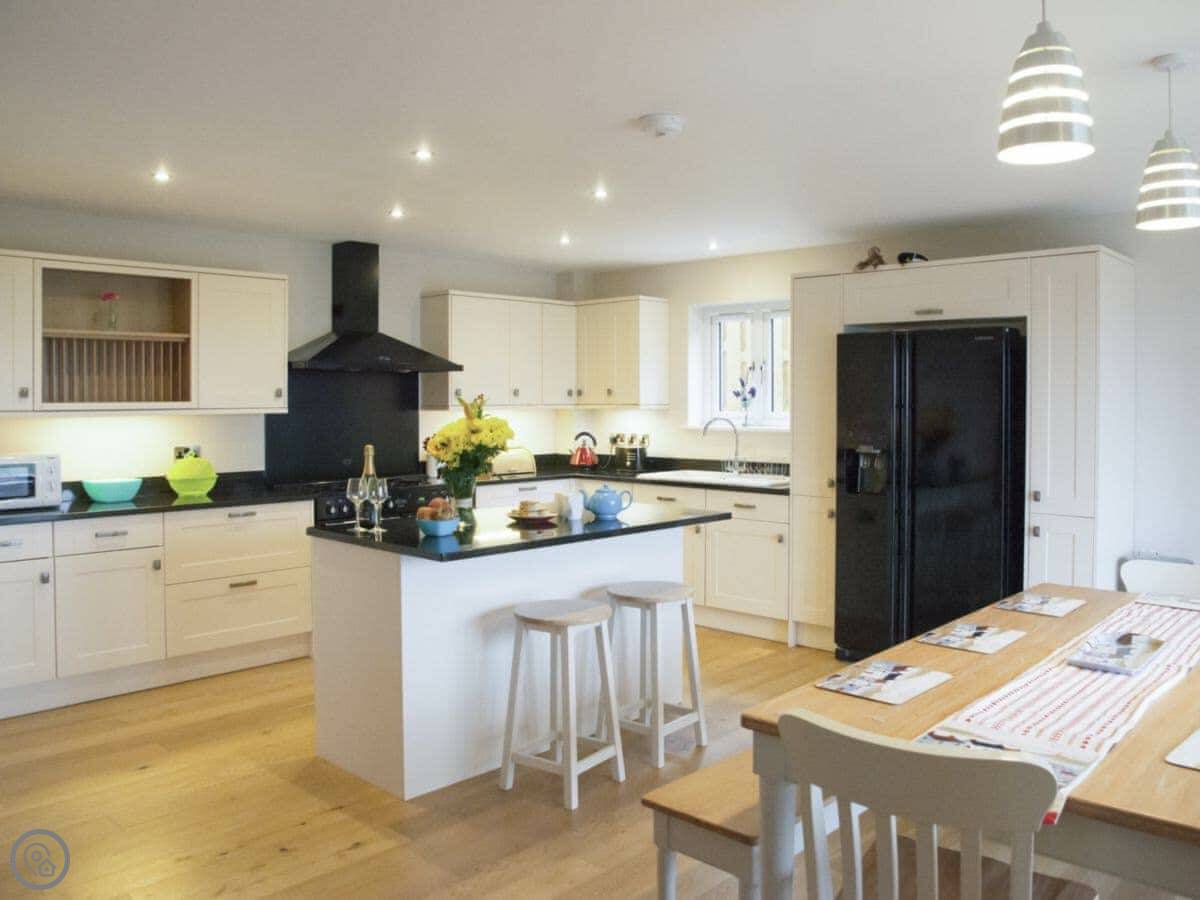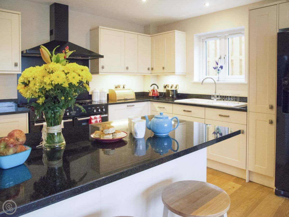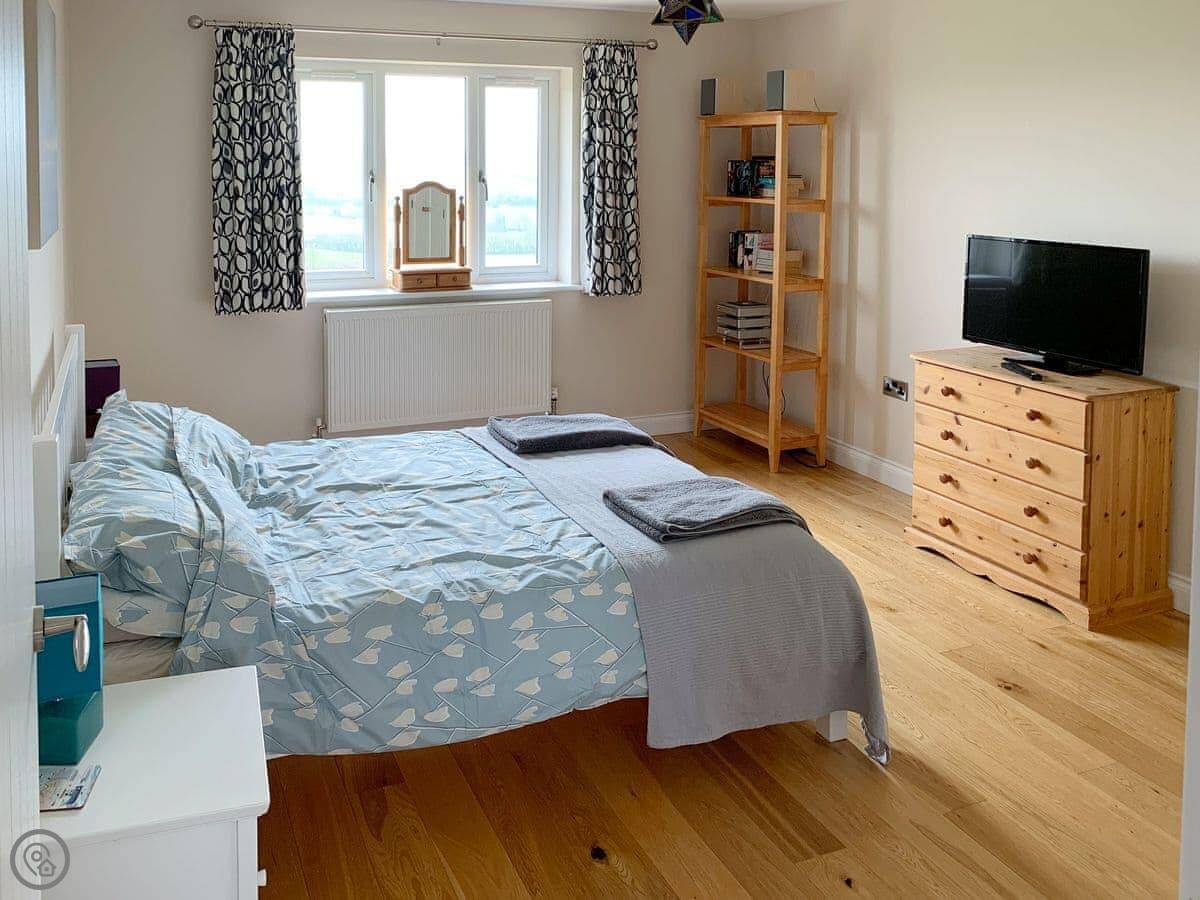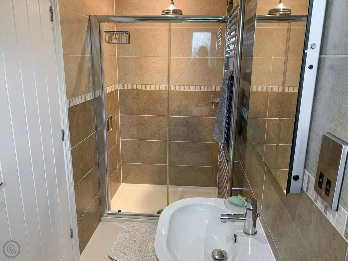 For facilities, it's got what you'd expect: a washing machine, dishwasher, WiFi, TV. Bedding and towels are included. There's parking on the drive. It's wheelchair friendly at the entrance and has a walk-in shower. You can bring up to two dogs.