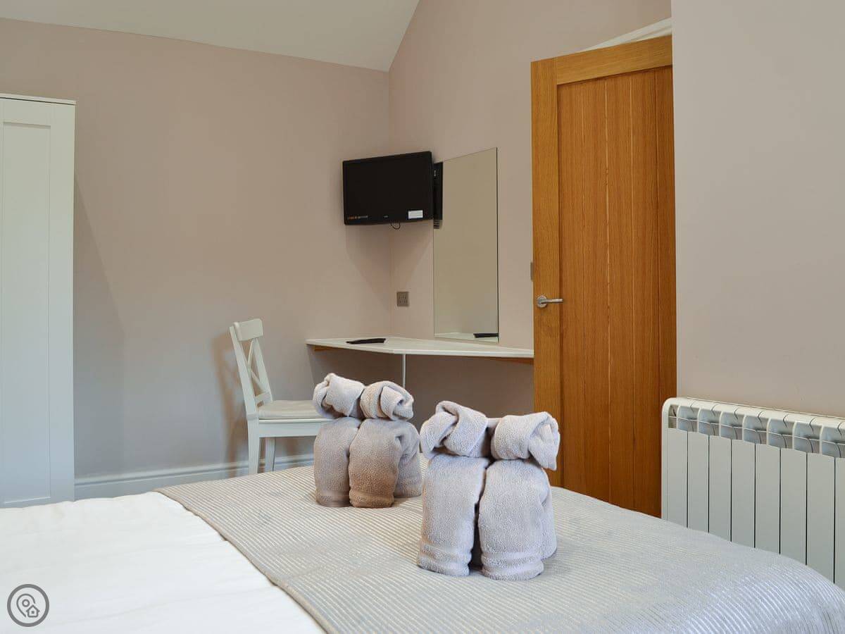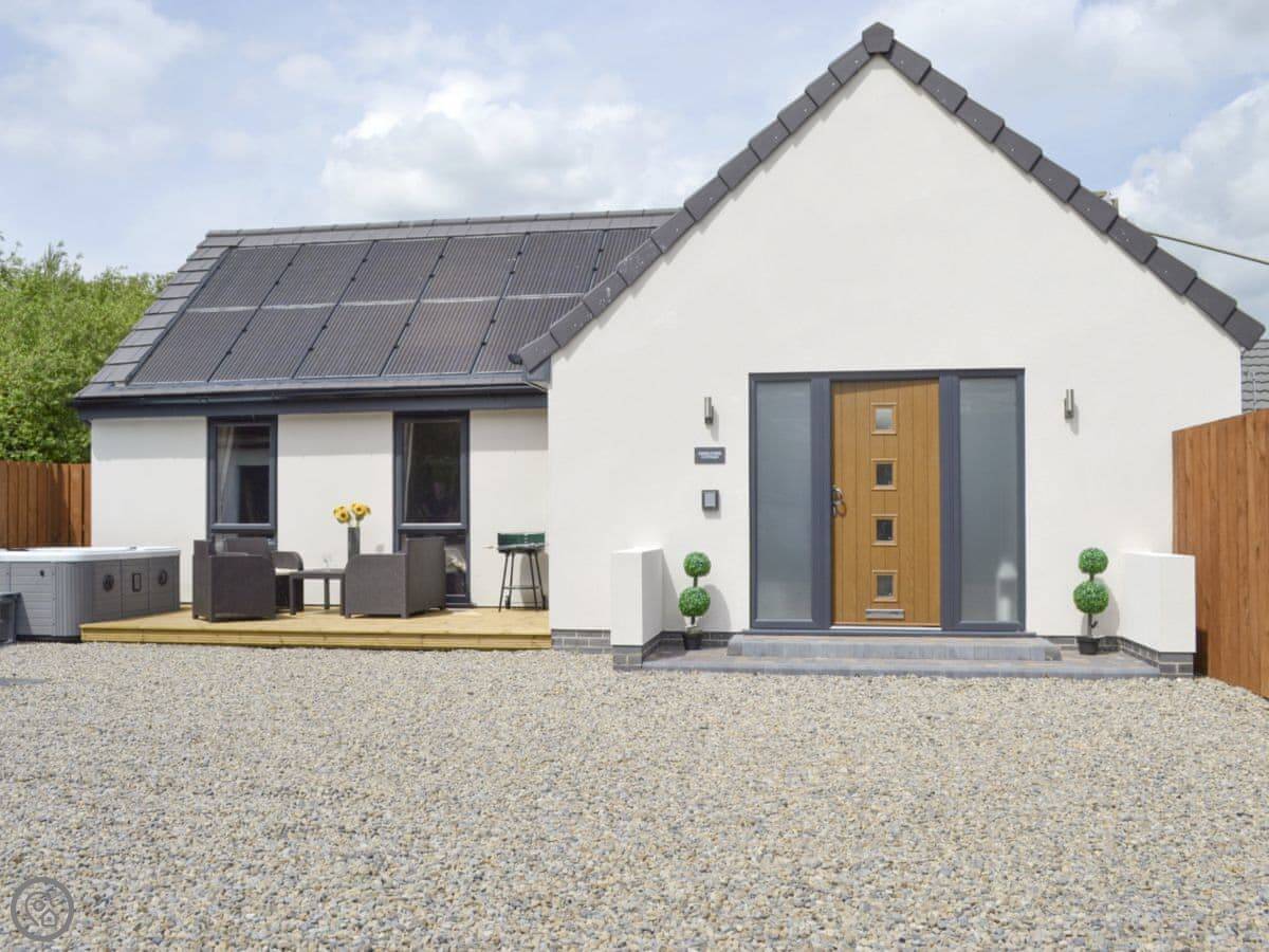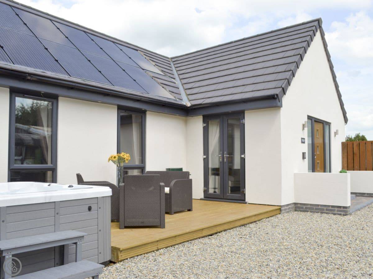 It sleeps four. Two bedrooms, one is a king size bed and the other has twin beds. One bathroom with a shower. The hot tub is on the decking outside and seats five. There's an enclosed garden that's just for you.