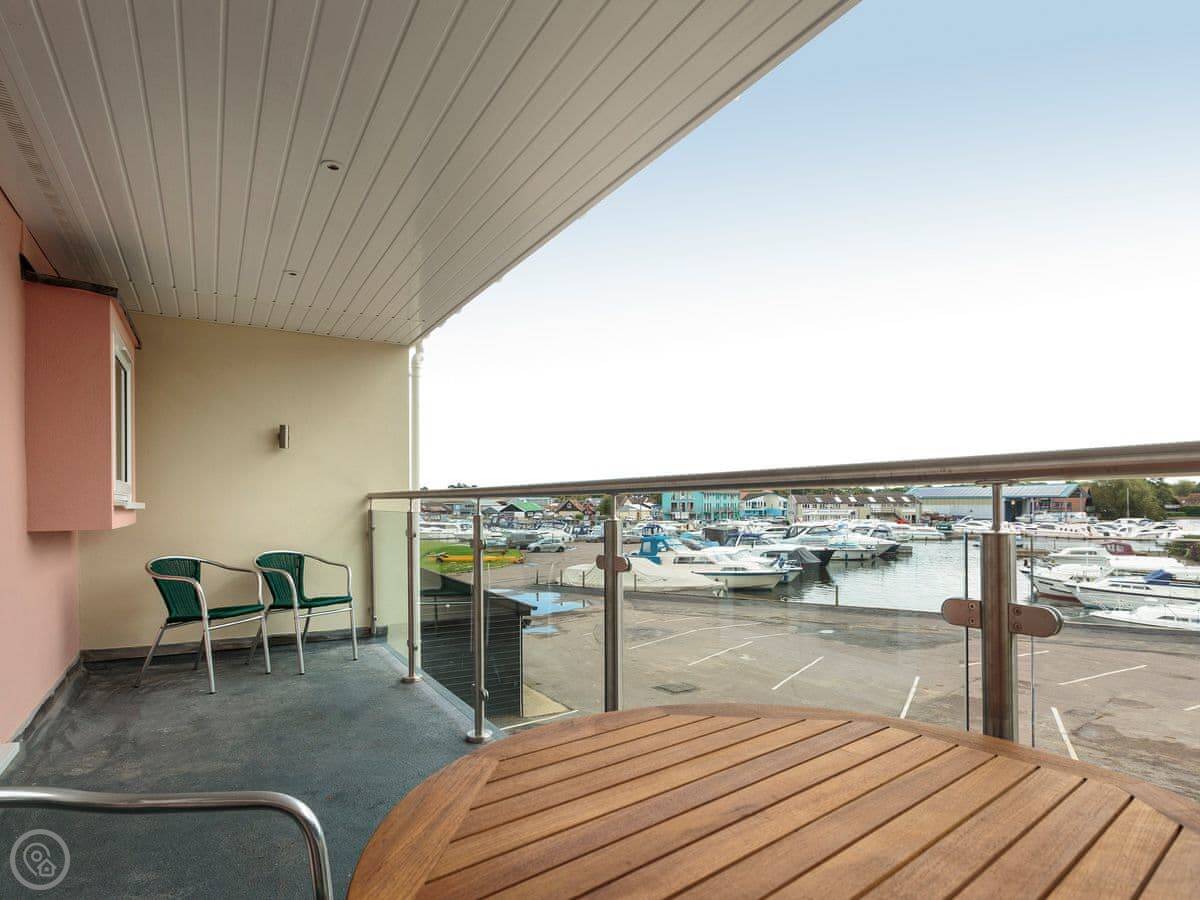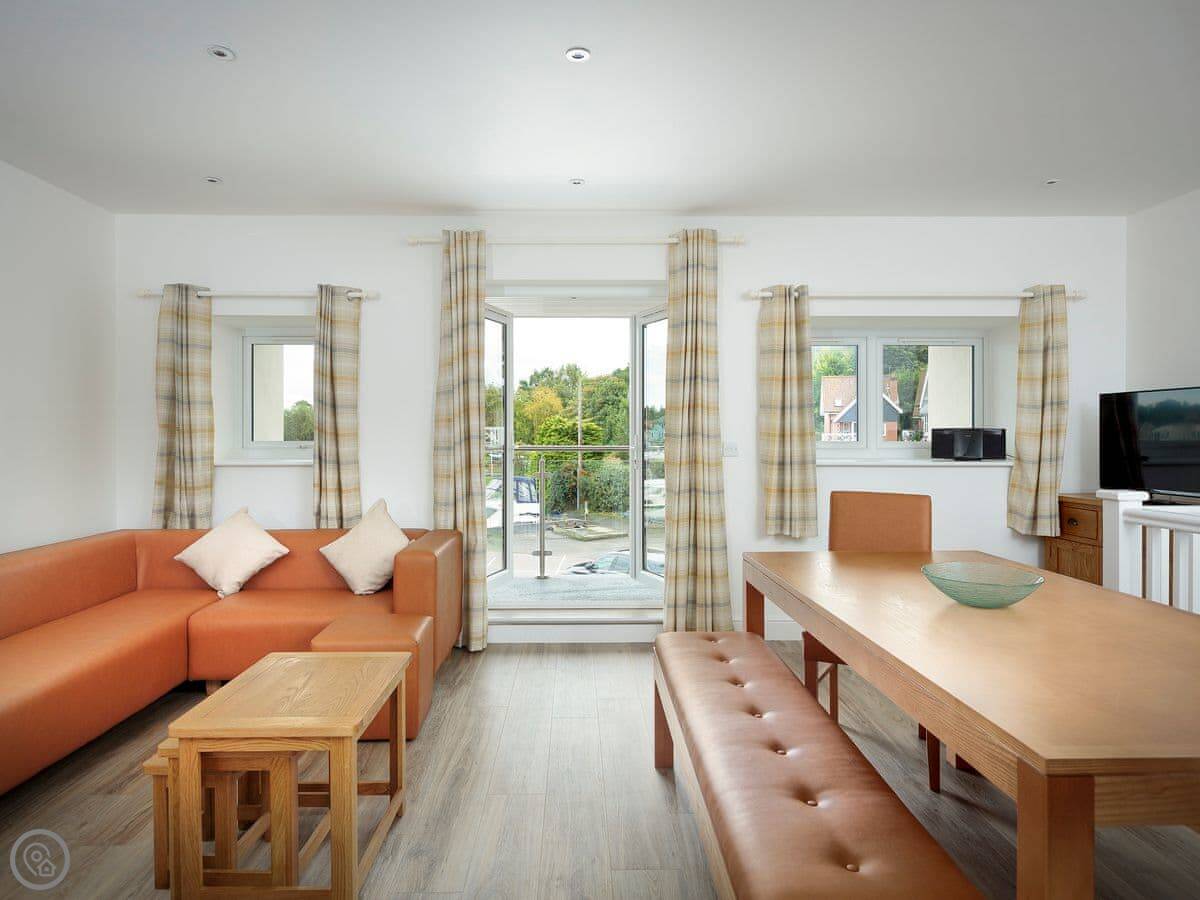 The main living area is upstairs to get the view. You've got a balcony looking out over the river. It's a proper view of the Bure, boats coming and going. The stairs are fine, just a normal staircase.
