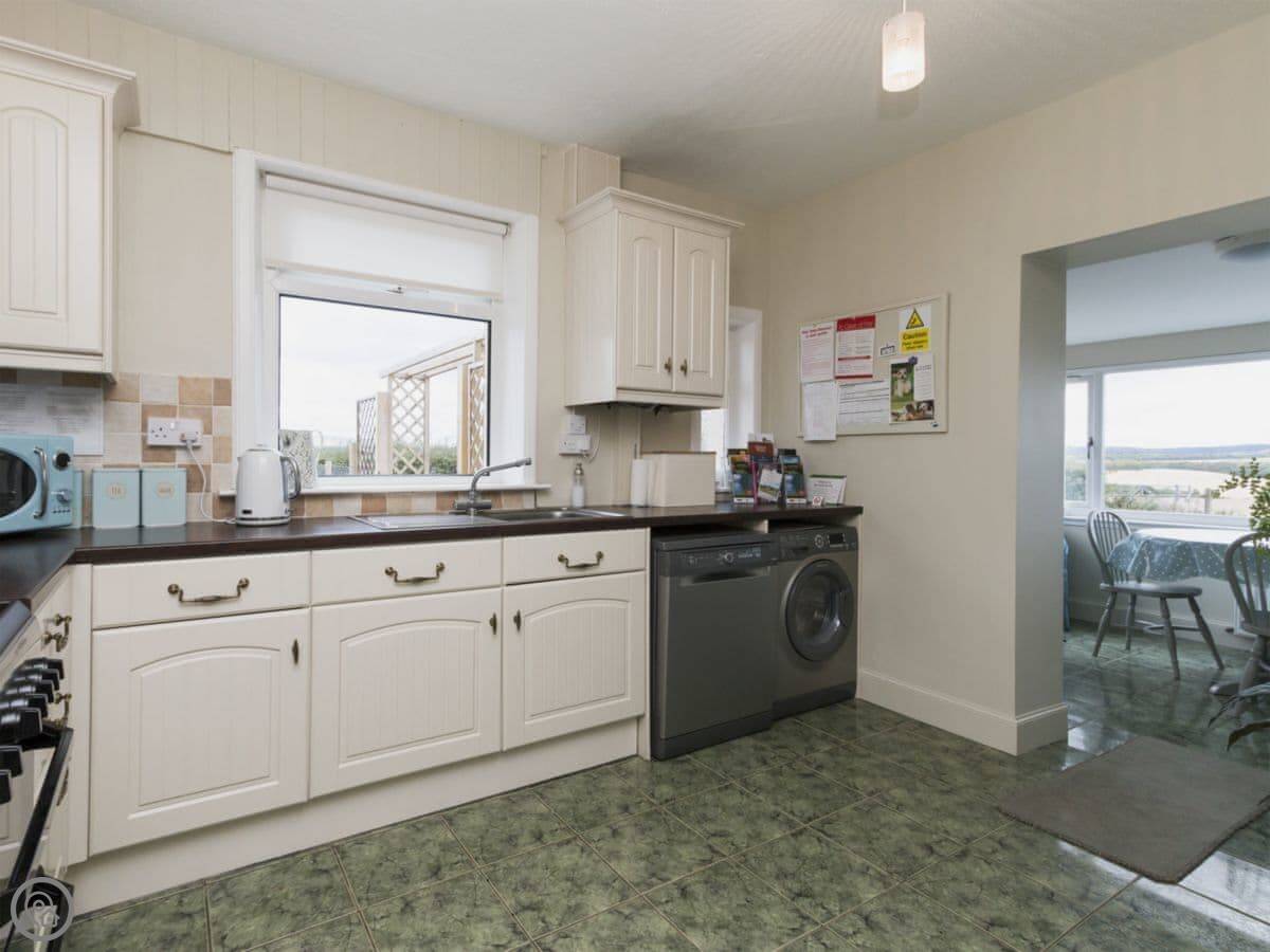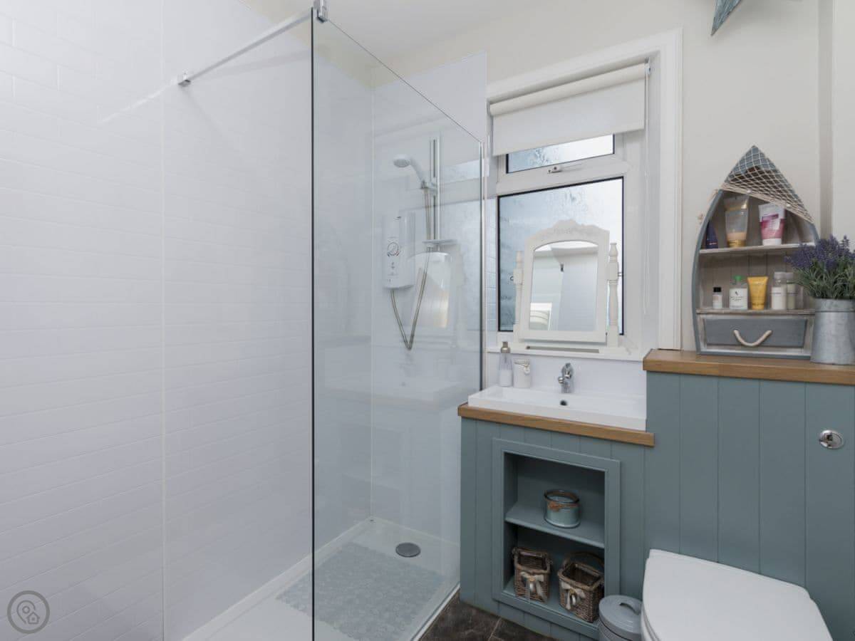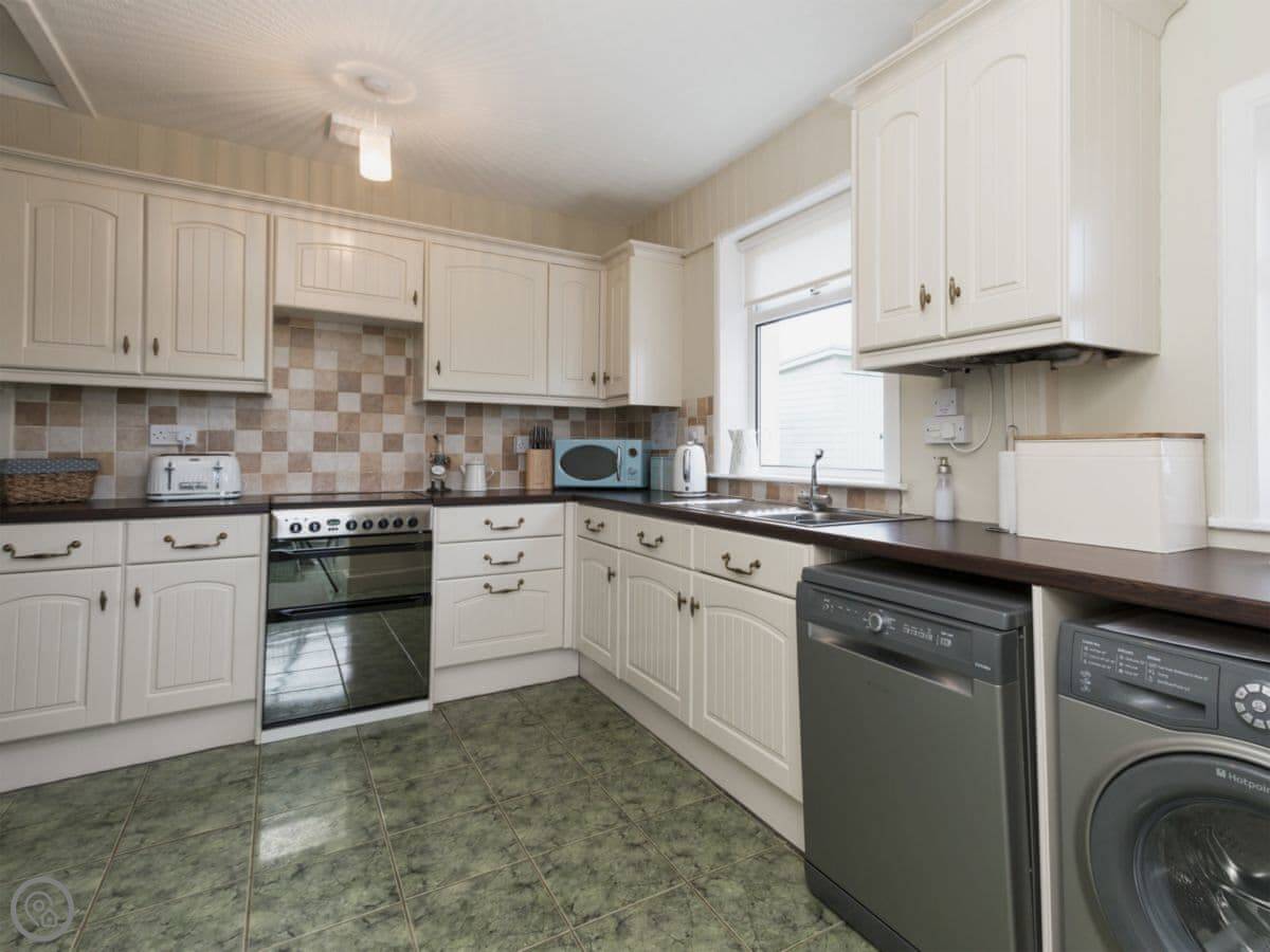 Inside, there's a washing machine, dishwasher, WiFi. Bedding and towels are included. There's a cot and highchair if you need them. The shower is a walk-in type. Parking is right outside.