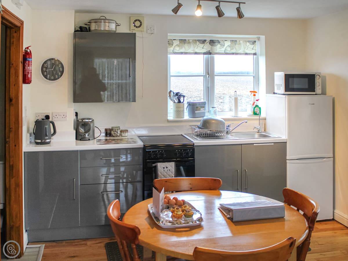 Daisy Apartment is one of a few places here on the farm, near Stalham. You get your own bit of patio out the front, and it's quiet, just fields. The track up to it is a proper farm track, so it's a bit bumpy.