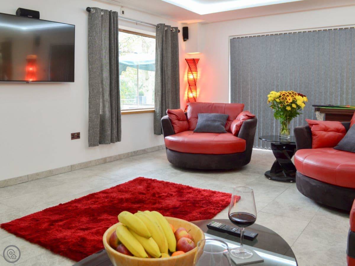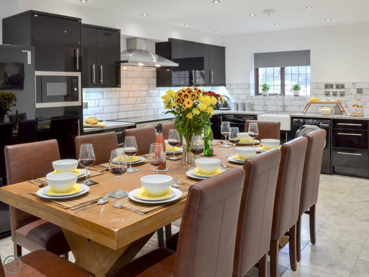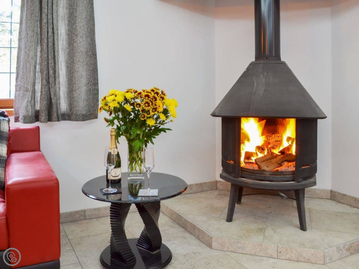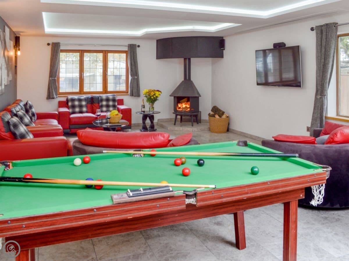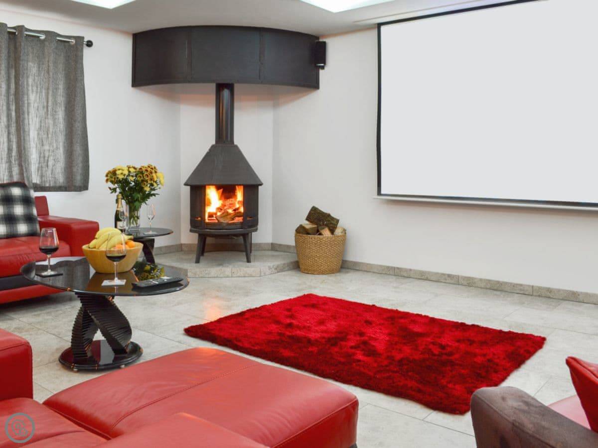 It sleeps nine. Five bedrooms and three bathrooms. It's got a 5 Star rating. That means it's well-equipped and comfortable. There's a cinema room with a wood burner for evenings in.