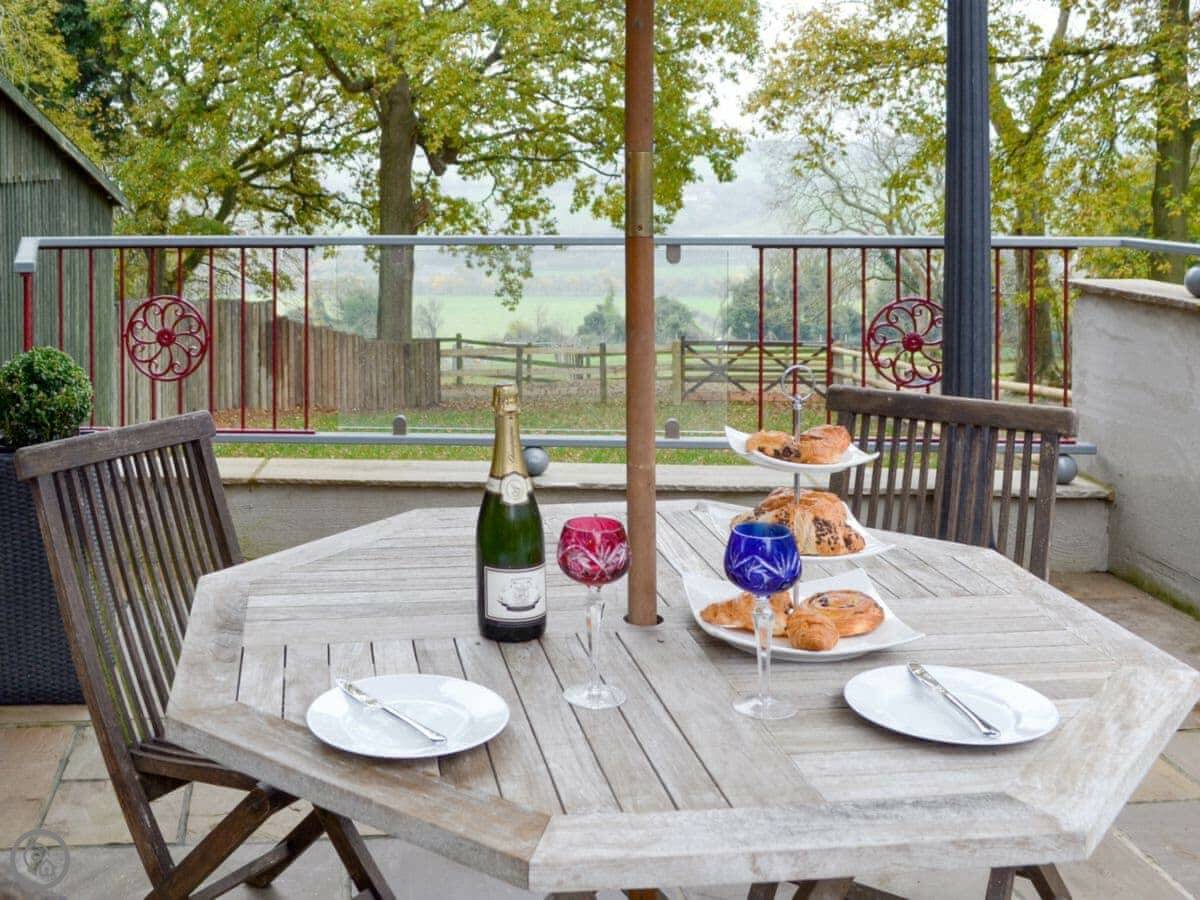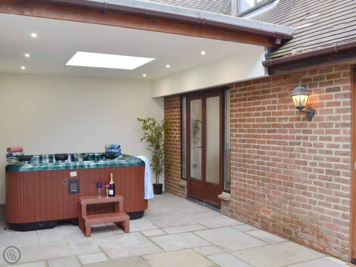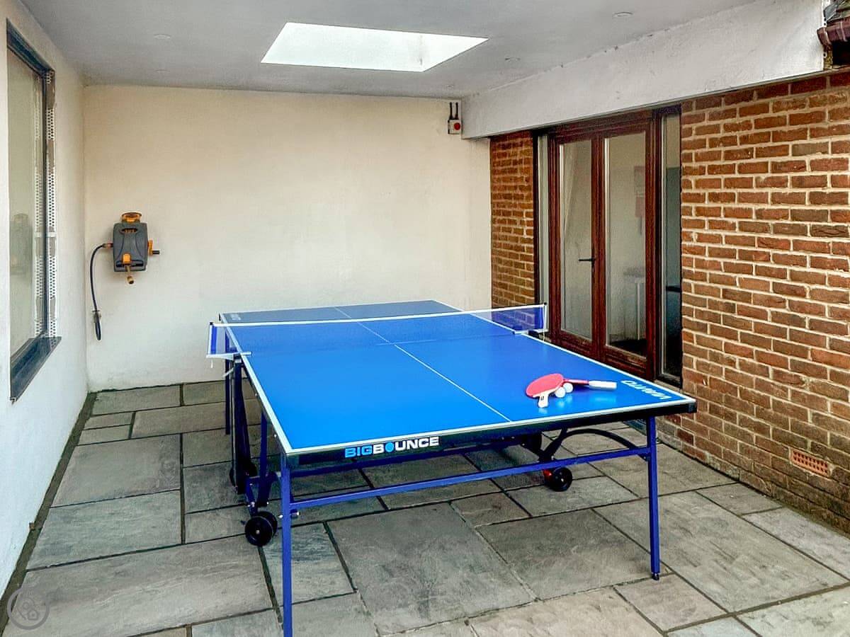 Outside, there's a terrace with a hot tub. Steps lead down from it into a paddock, which is good for a picnic. The paddock backs onto woodland. There's also a ping pong table under cover.