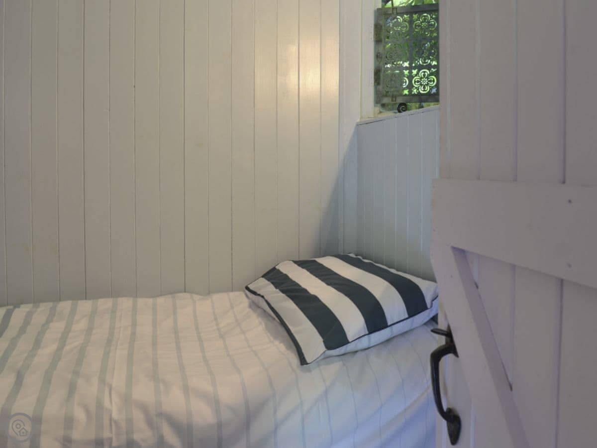 It sleeps two people. Two small bedrooms and one bathroom. It's all on one level, so no stairs. There's a big wooden beam that runs right through the middle of the living space.