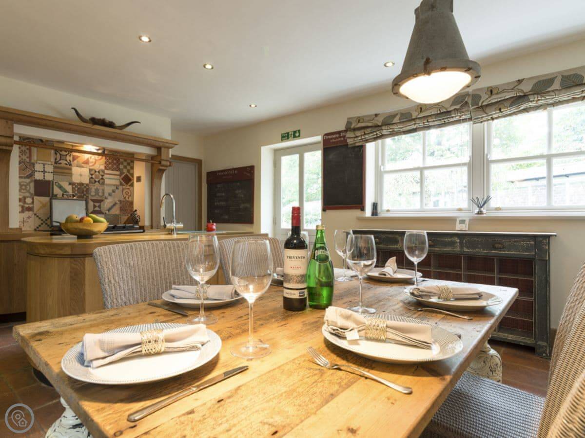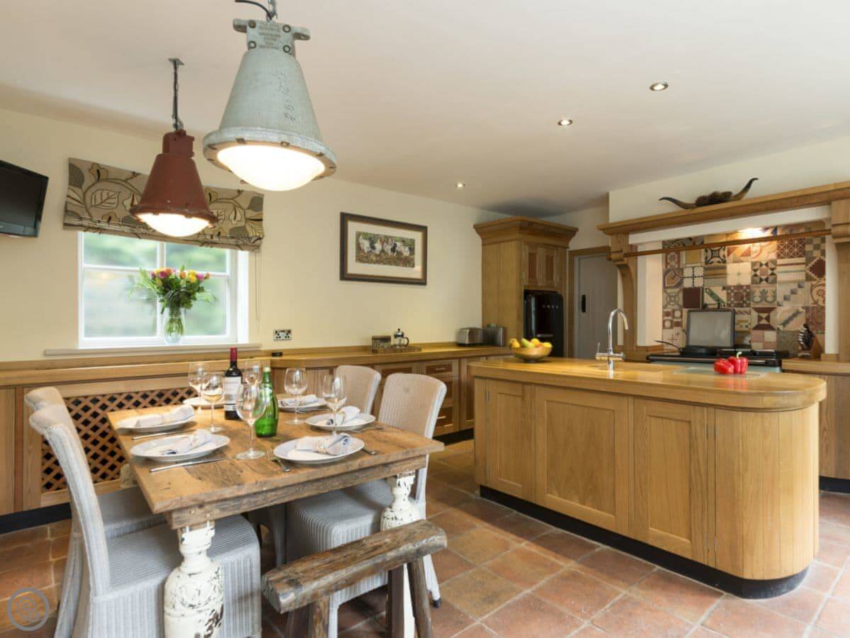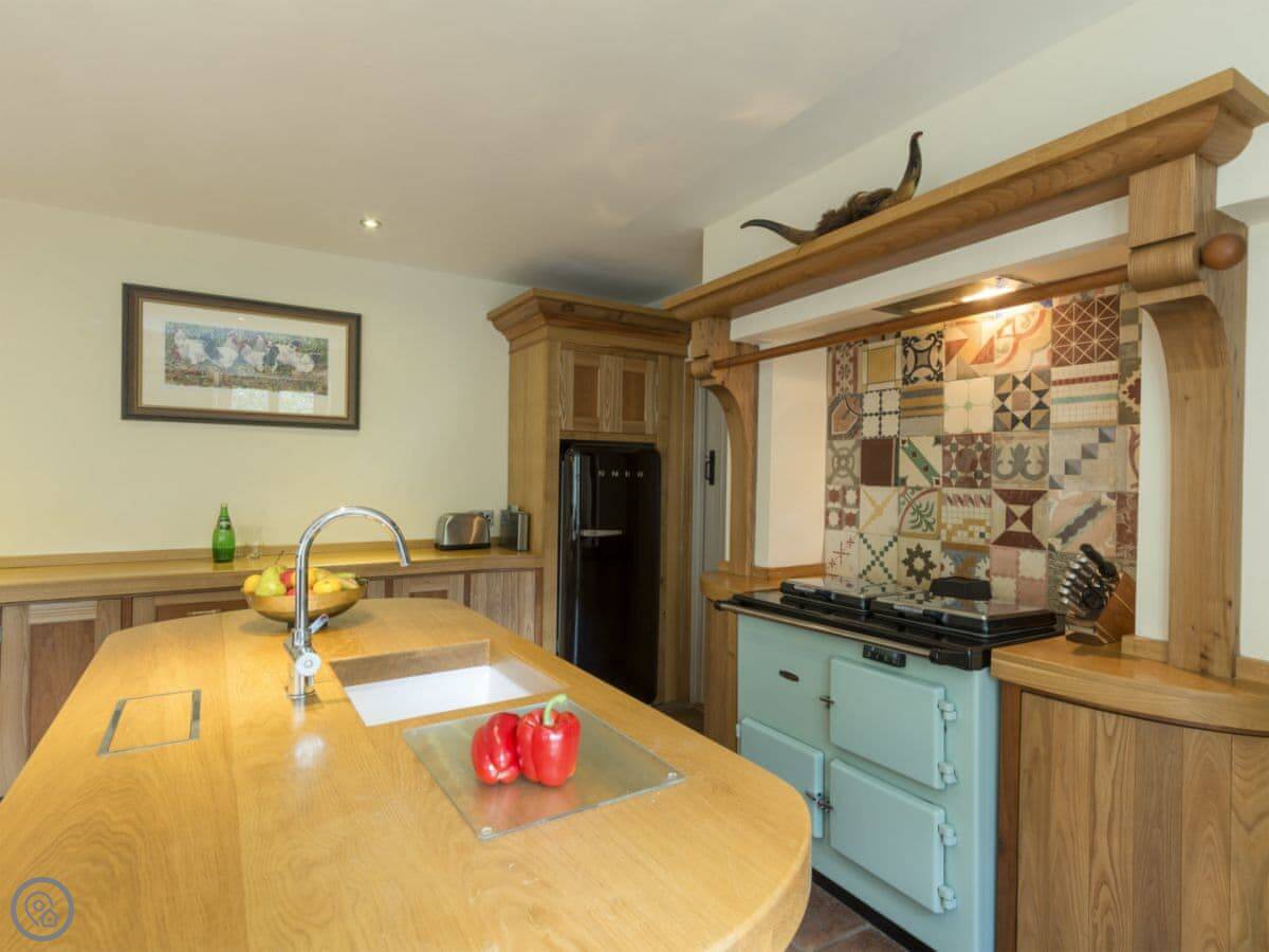 There's a separate garden room with another wood burner and a big table. Good if some people want a bit of space. The main living room has a wood burner too. Kitchen's got a range cooker and a dishwasher.