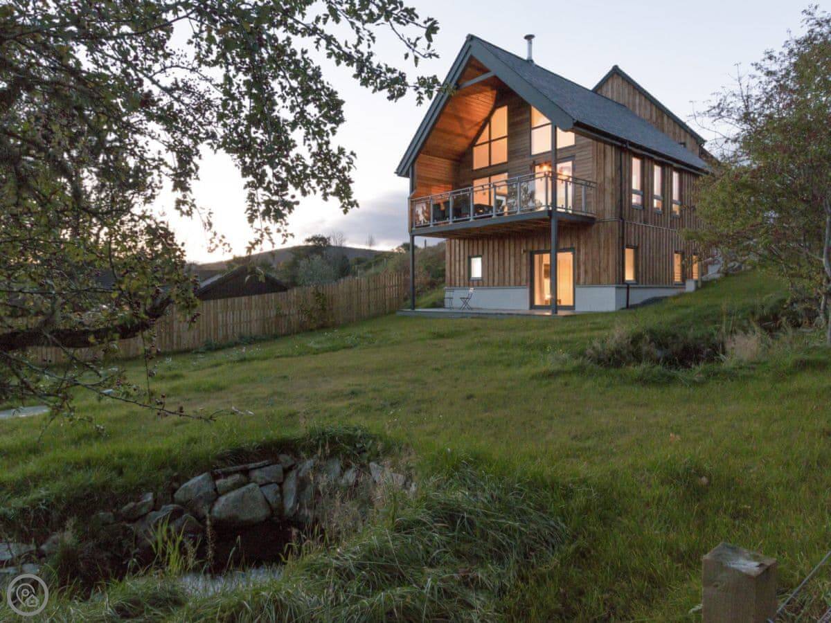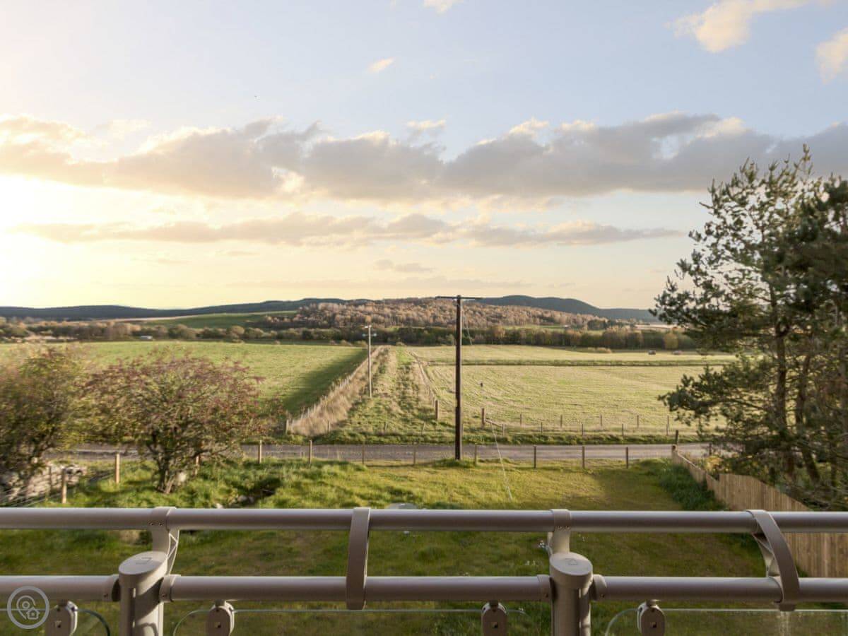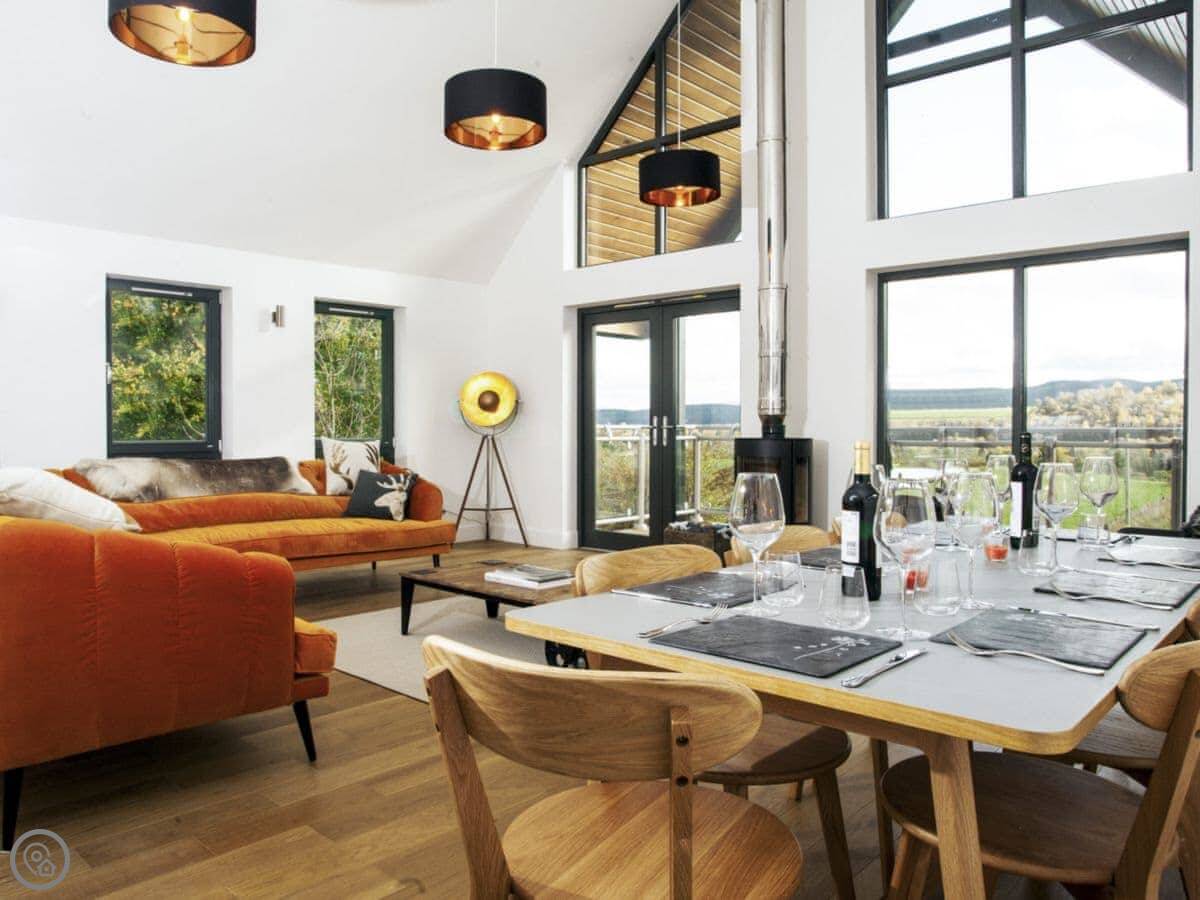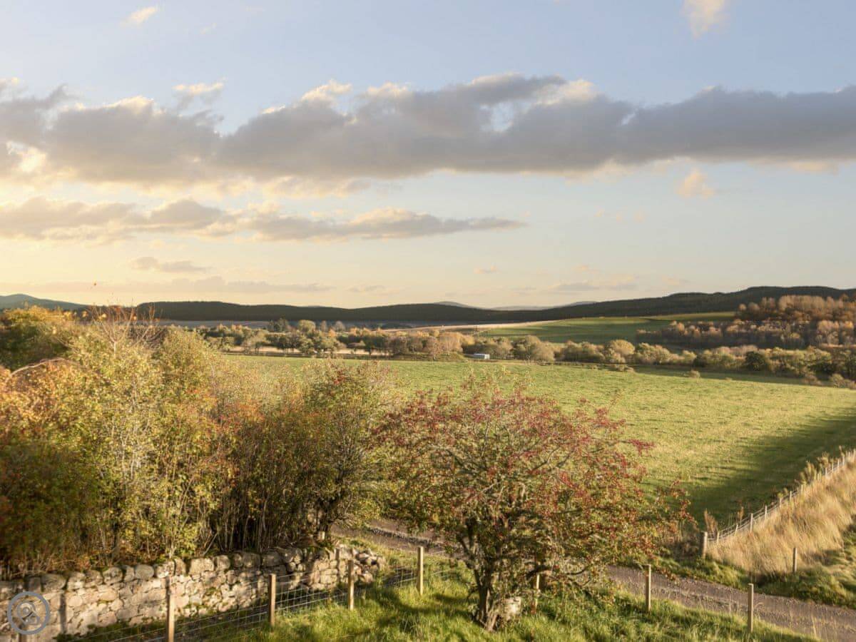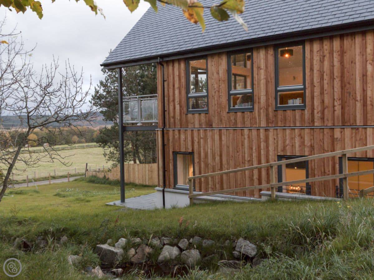 Strathspey Lodge is in Duthil, a small hamlet in the Cairngorms National Park. It's a detached wood and stone lodge. The main thing you get here is the view. It looks out over fields towards the Cairngorm mountains.
