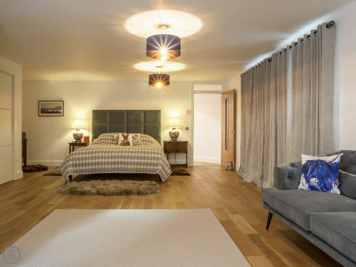 The lodge sleeps eight. There are four bedrooms and four bathrooms, which is useful with a full group. It has a 5 Star rating, which reflects the standard. It's well finished. The furniture is bespoke, made locally. It's comfortable and warm.