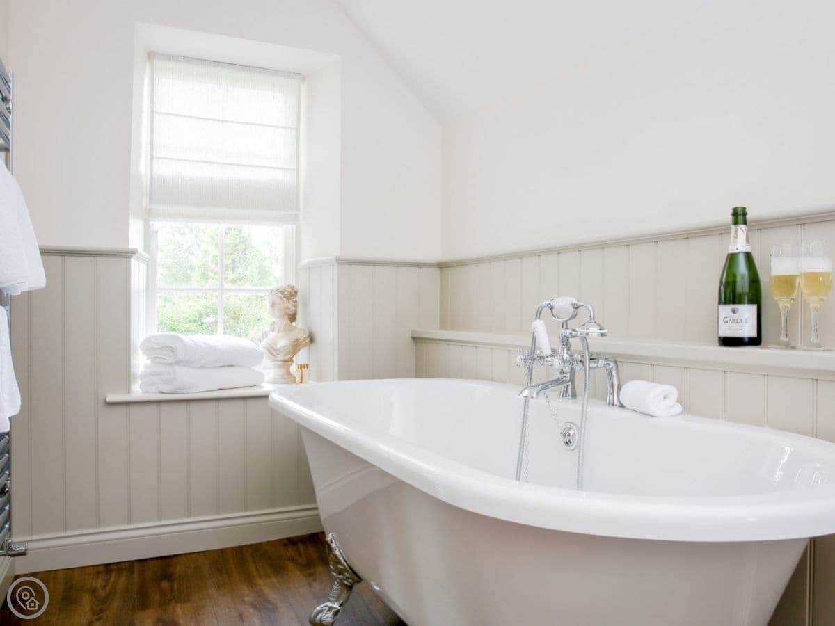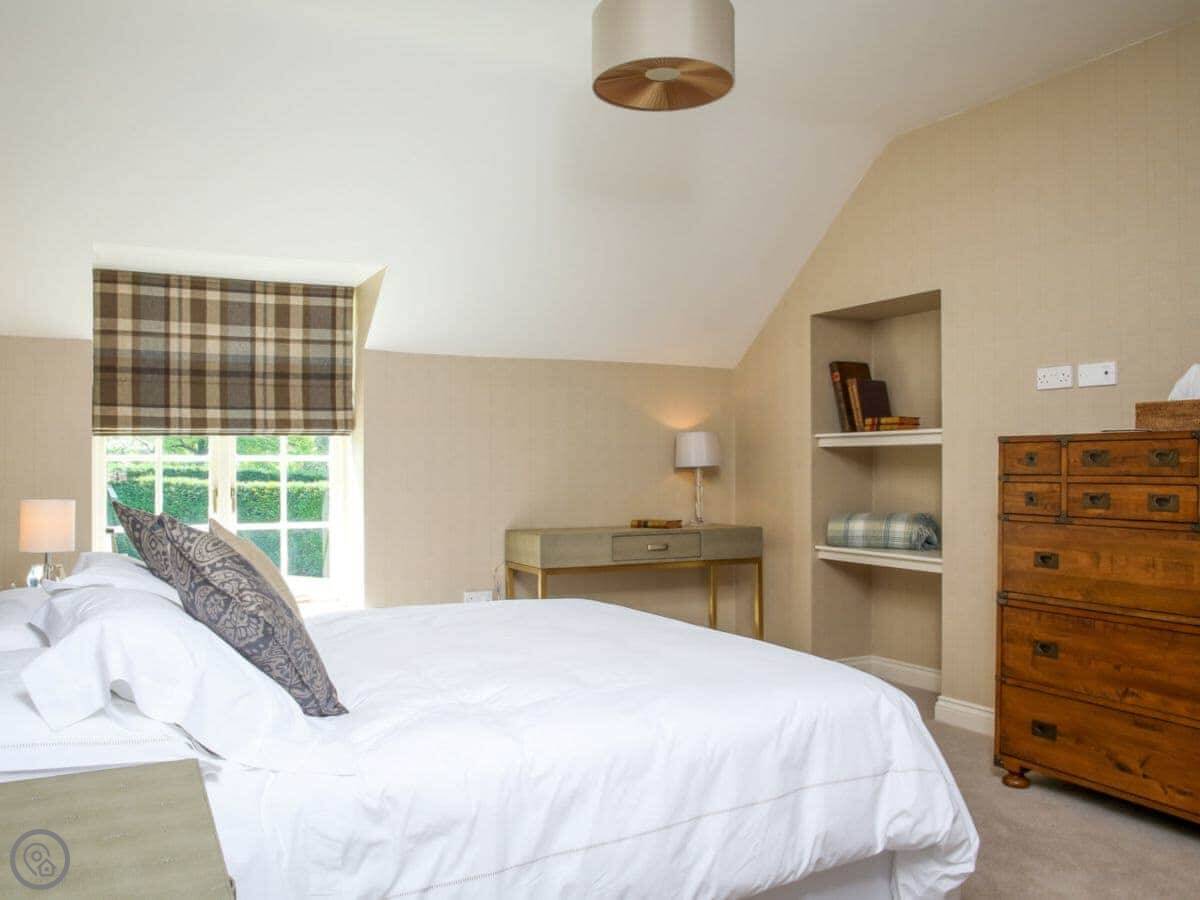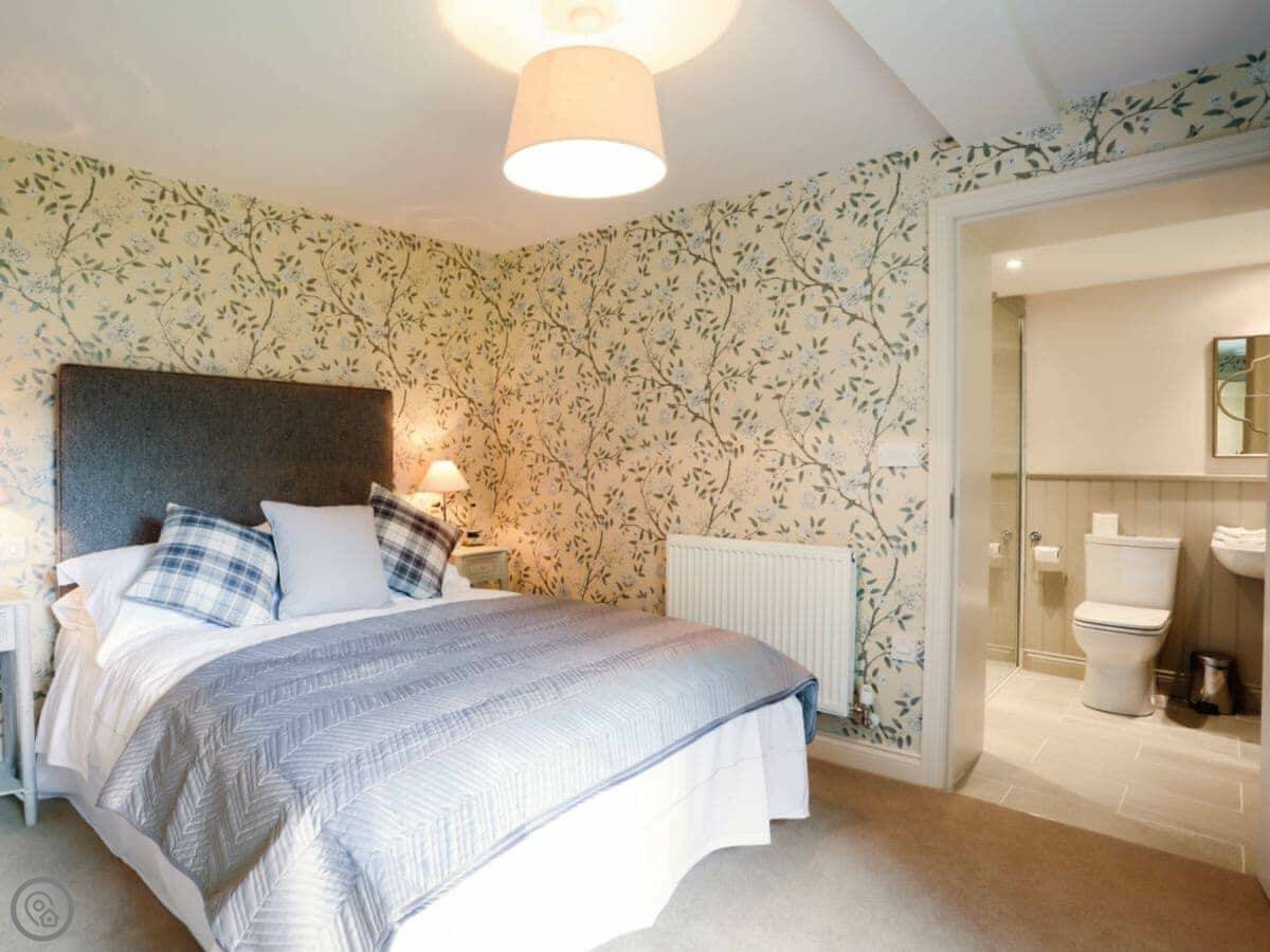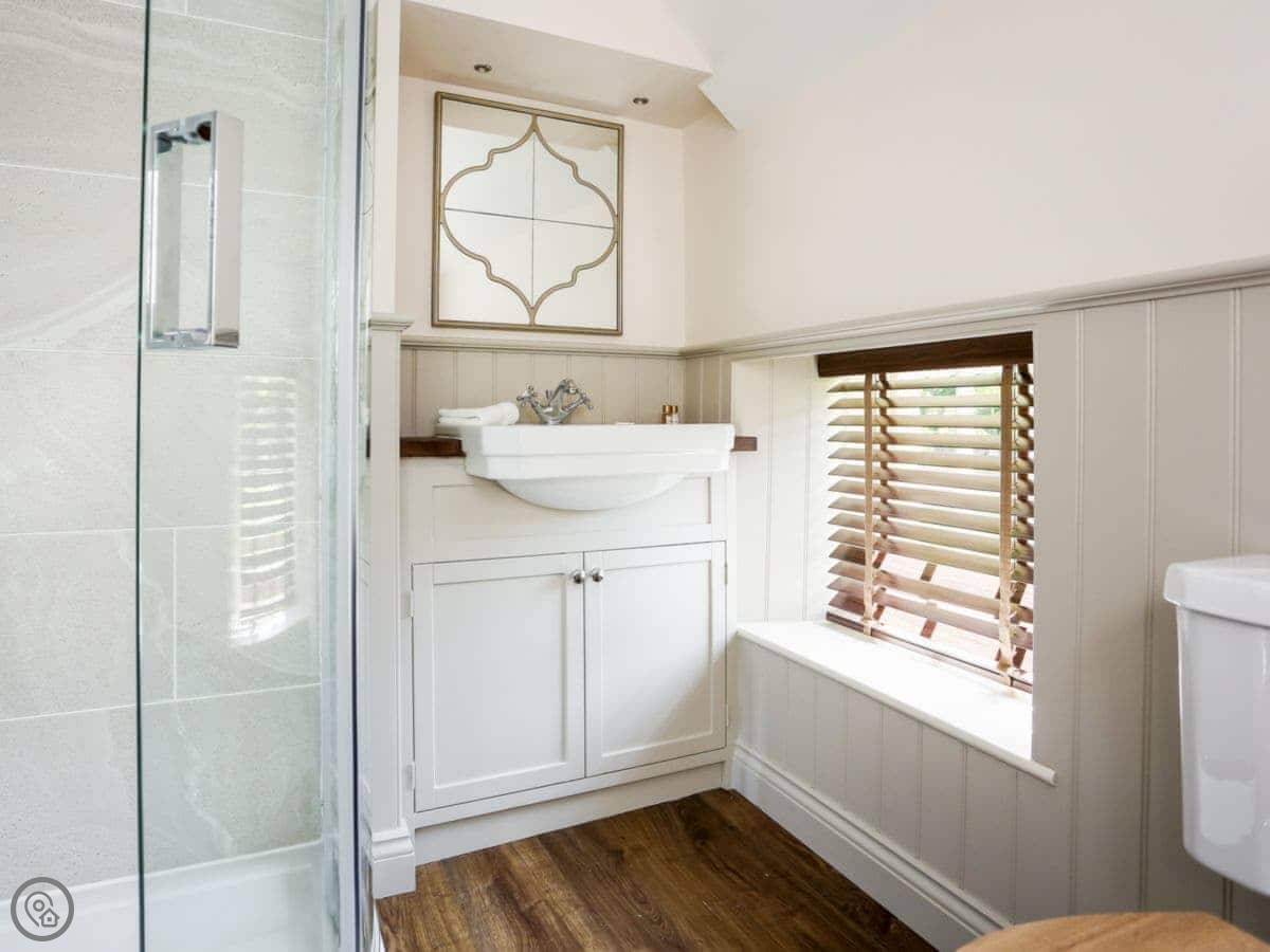 It sleeps eight people. There are four bedrooms and four bathrooms, so no queues in the morning. One of the doubles is downstairs and it's en-suite, which is handy if stairs are a problem. The other three bedrooms are upstairs. Two are en-suite and the third uses a separate shower room.