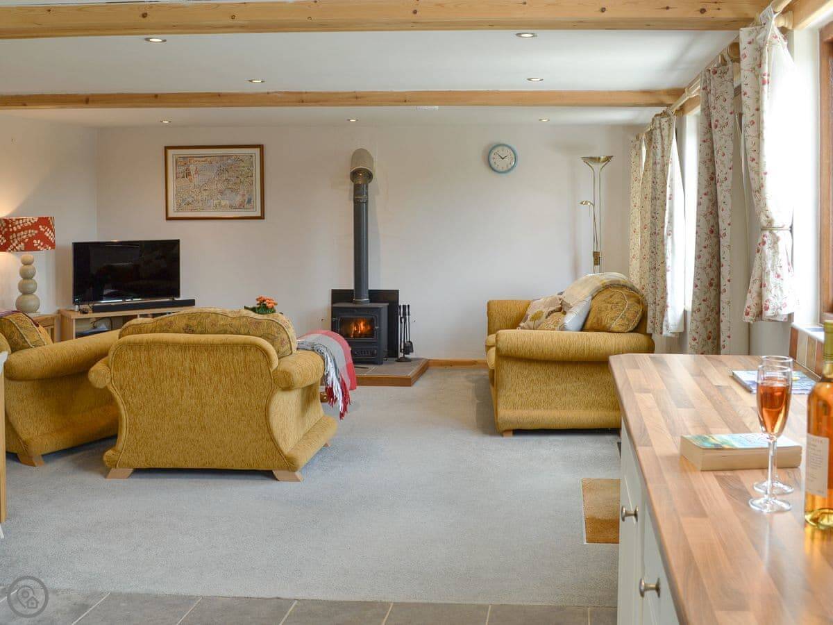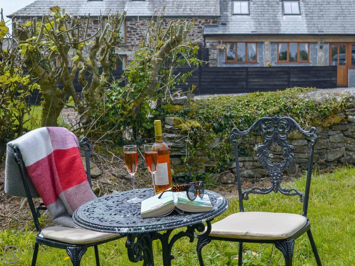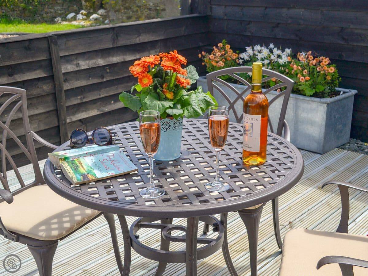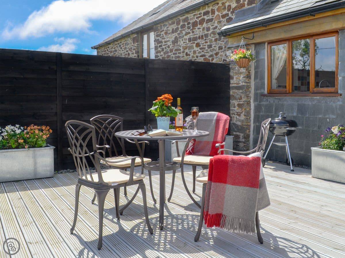 Outside is an enclosed decked area with a table and a charcoal barbecue. It’s secure. You can bring two dogs. They’ll like the farm track that goes through the fields, good for a walk right from the door.