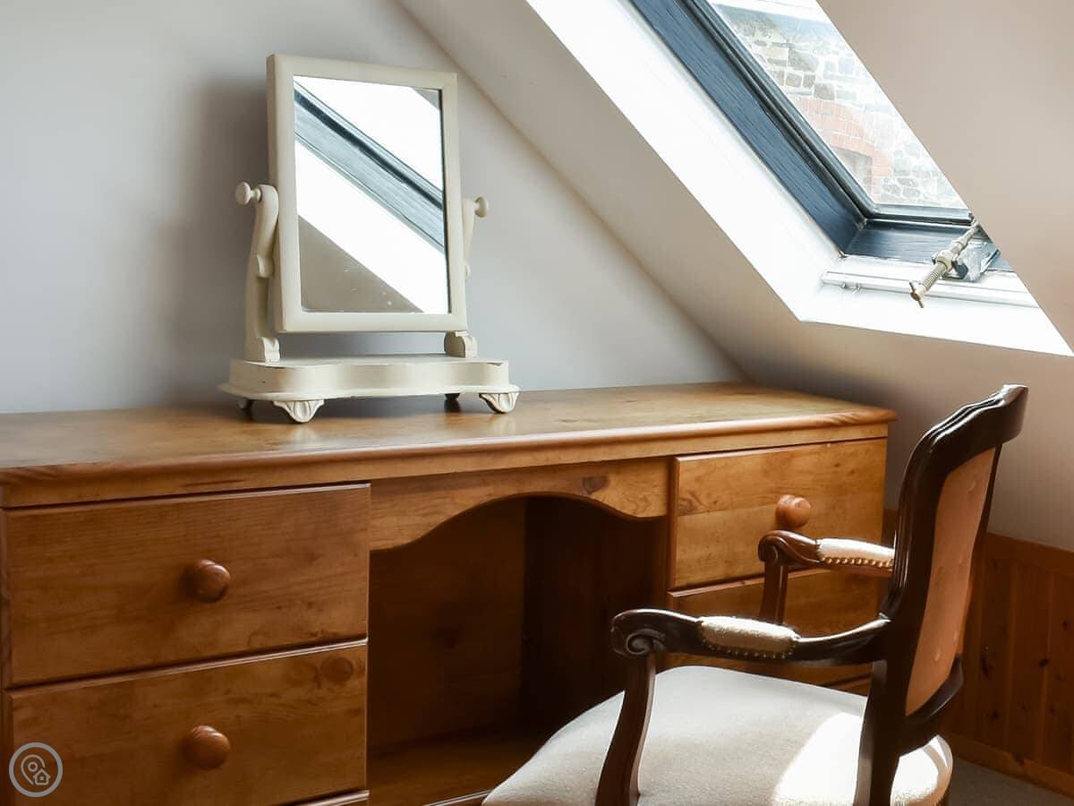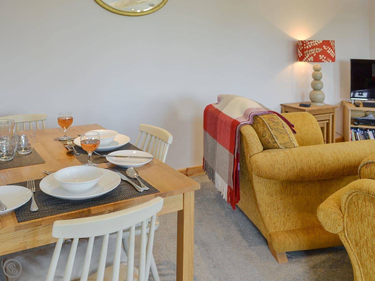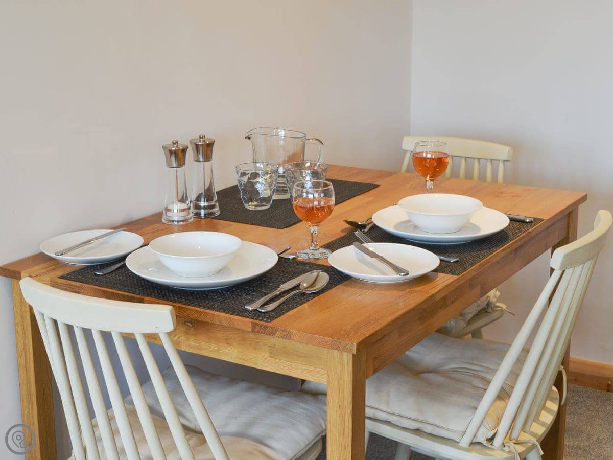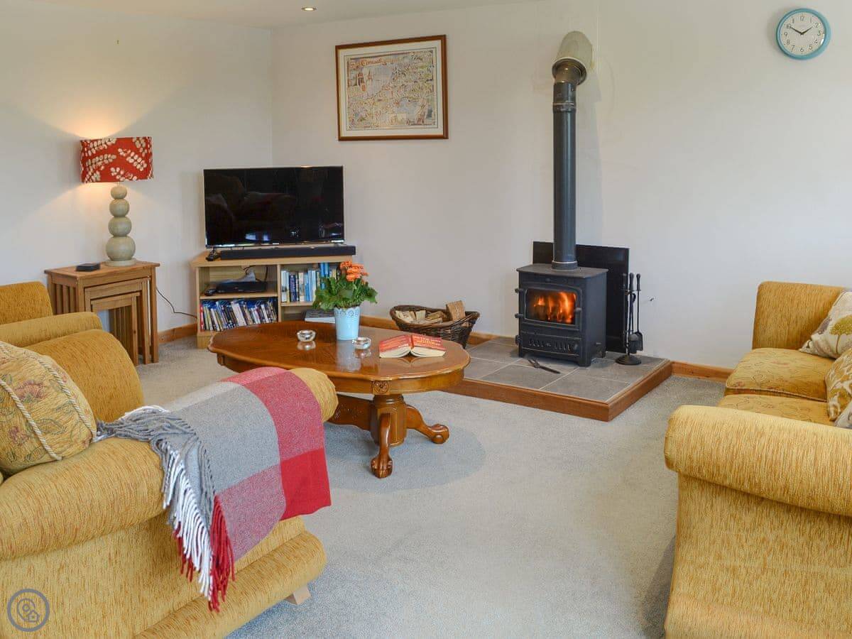 Outside is an enclosed decked area with a table and a charcoal barbecue. It’s secure. You can bring two dogs. They’ll like the farm track that goes through the fields, good for a walk right from the door.
