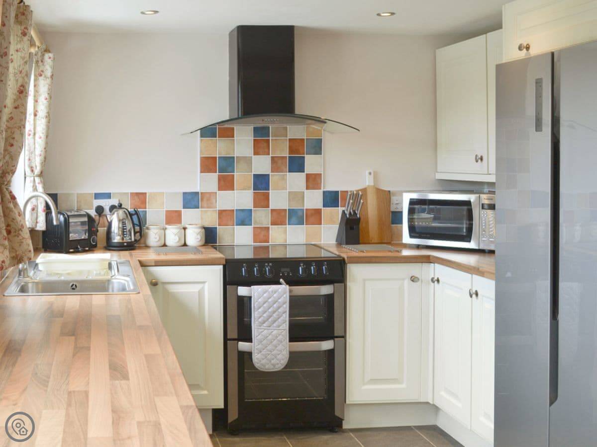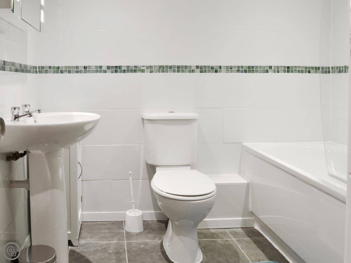 Downstairs is all open plan. There’s a wood burner, a TV, and the kitchen’s decent. Has a dishwasher and a Nespresso machine. The bathroom’s on the ground floor too, with a shower over the bath. There’s a cupboard under the stairs for coats and boots, which is handy.