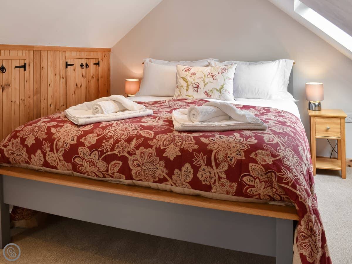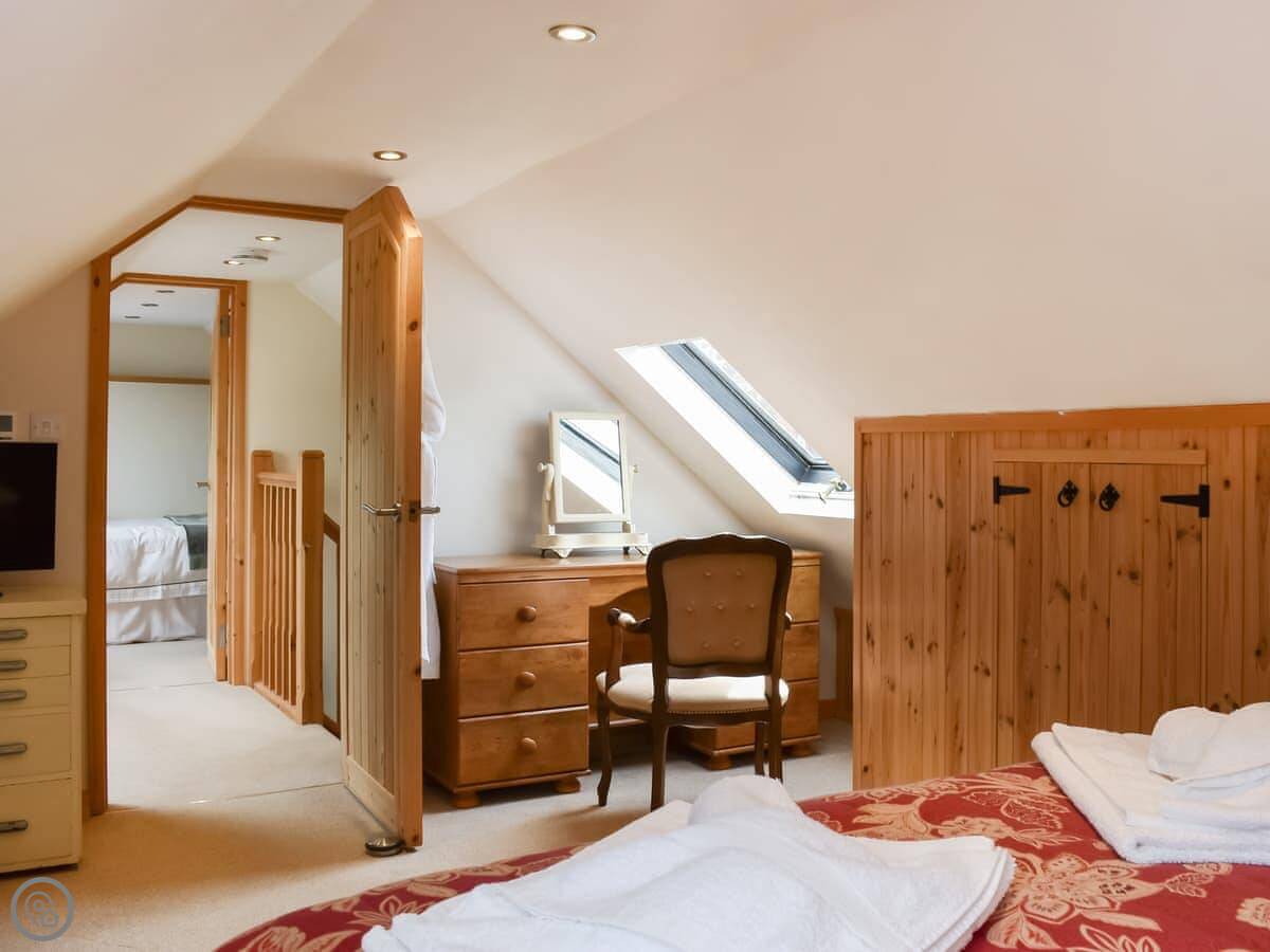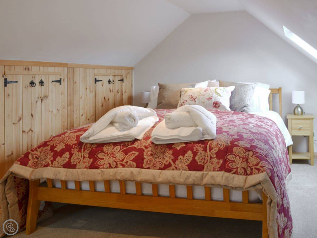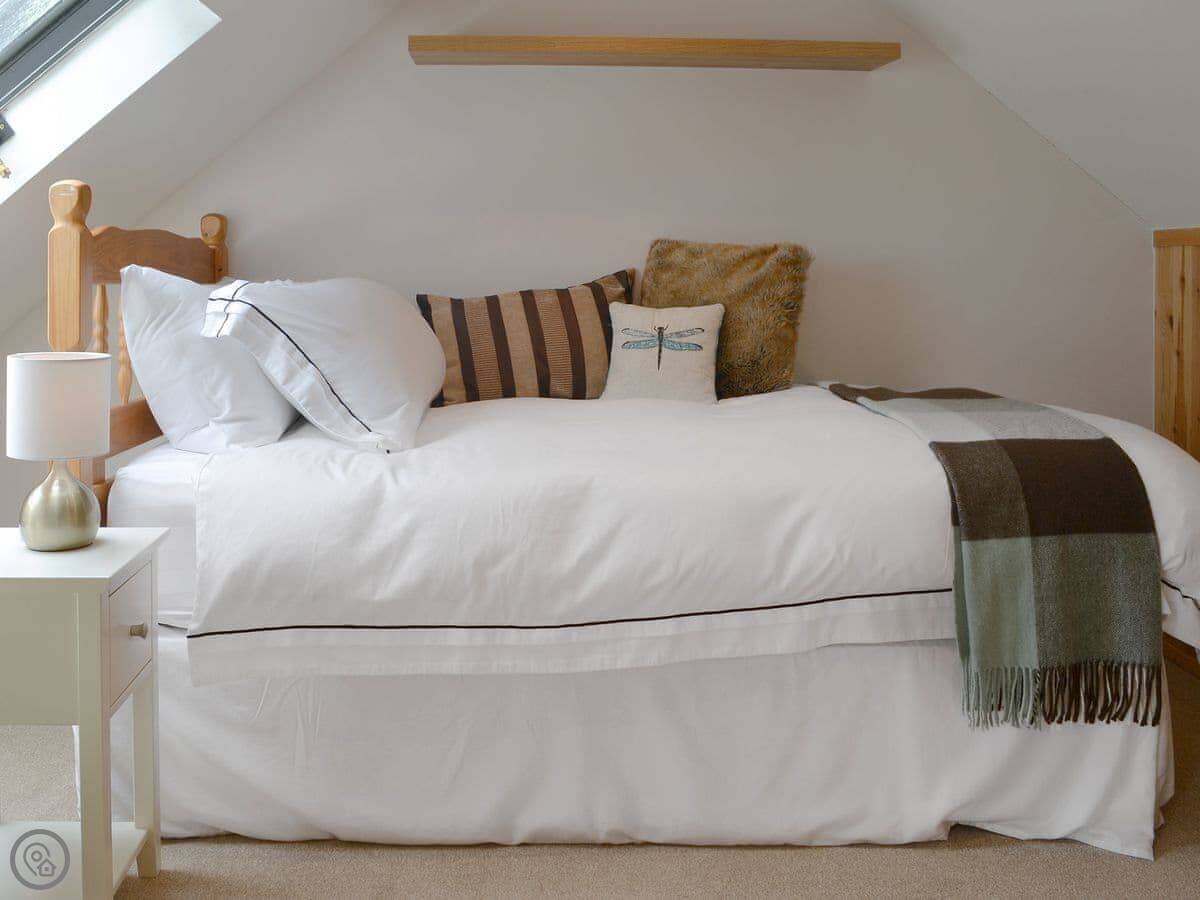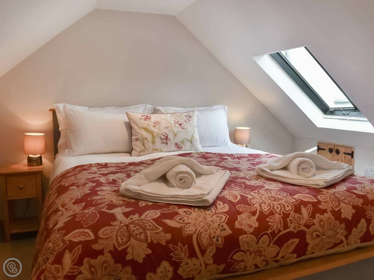 Sleeps three in two bedrooms. One king-sized bed and a single. Both rooms are upstairs and have sloping ceilings, so mind your head. It’s got a 4 Star rating. Everything’s clean and it’s well set up.