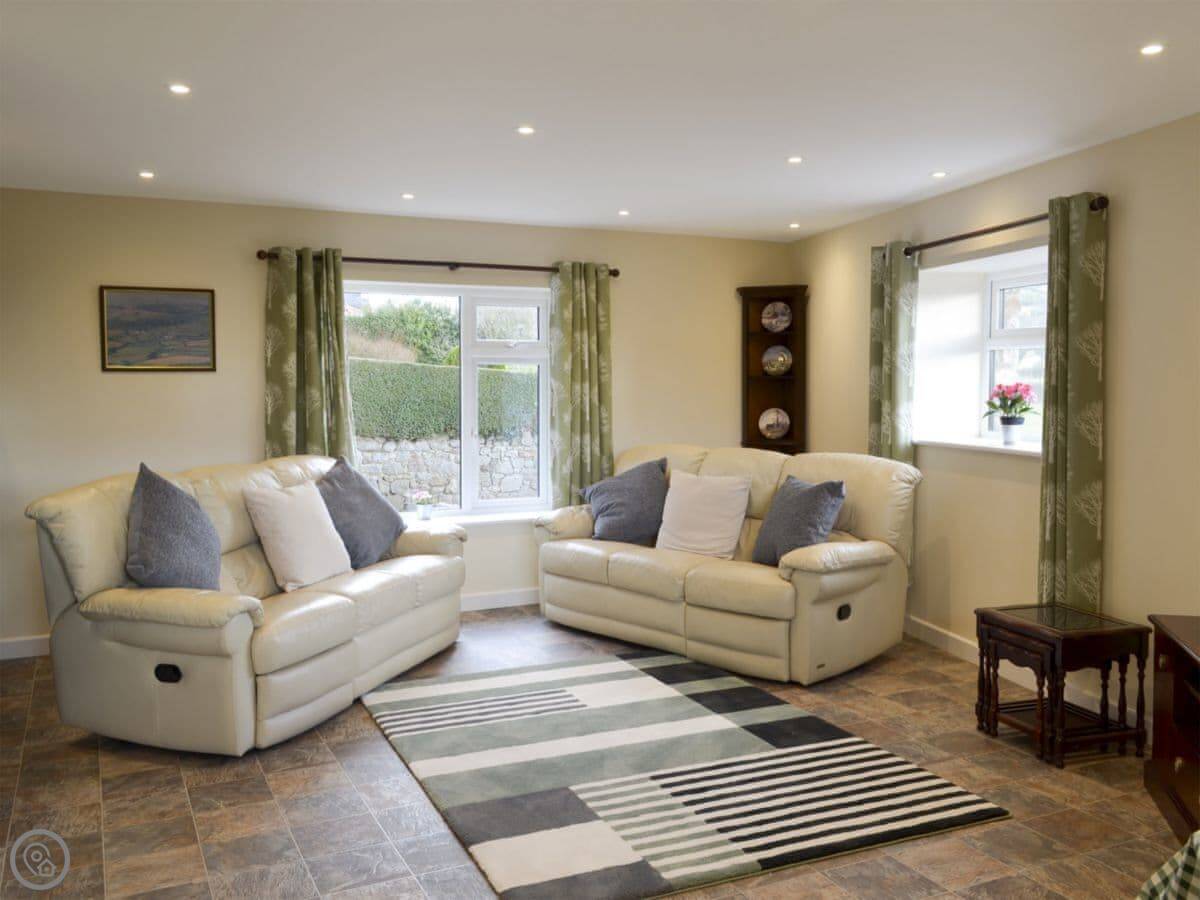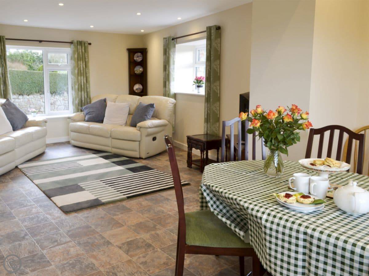 The barn sleeps eight. Four bedrooms, three bathrooms. It's got a 4 Star rating. The living and dining room is separate from the kitchen, which some people prefer if you've got a bigger group. You get your own bit of garden outside to sit in. The view from there is just fields. It's very quiet.