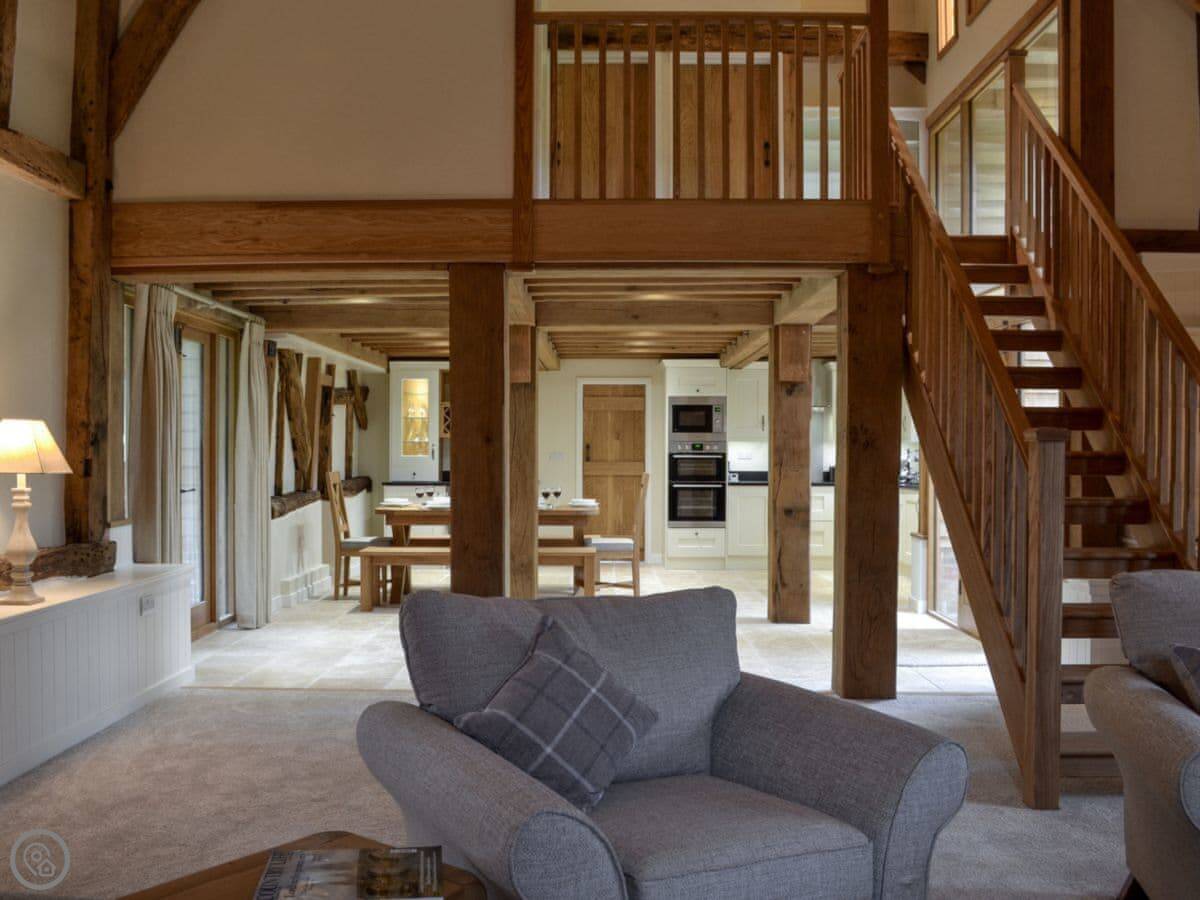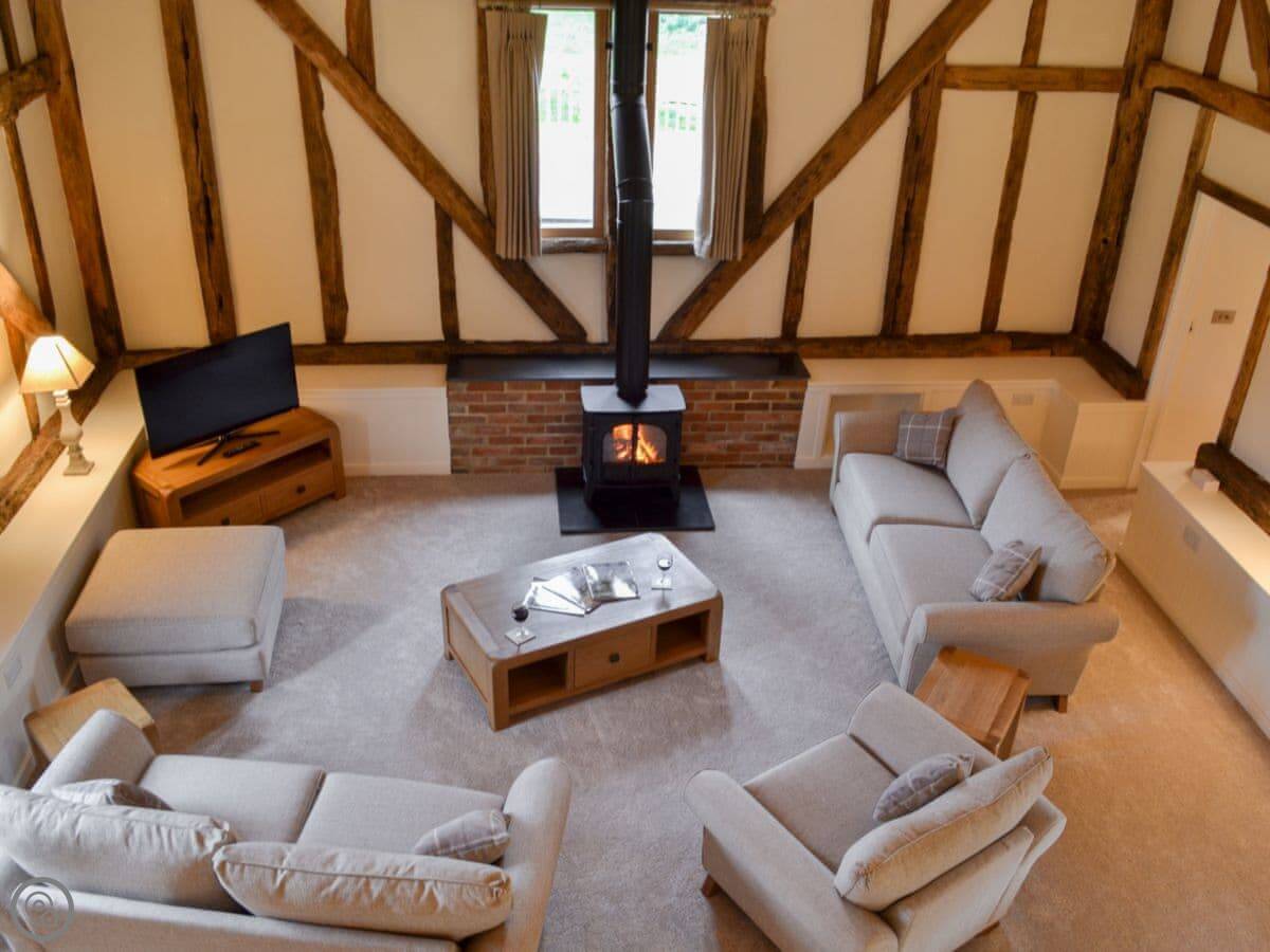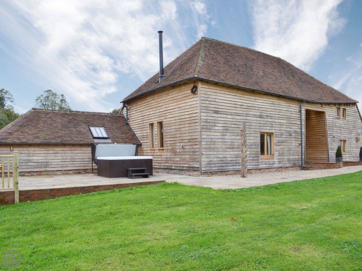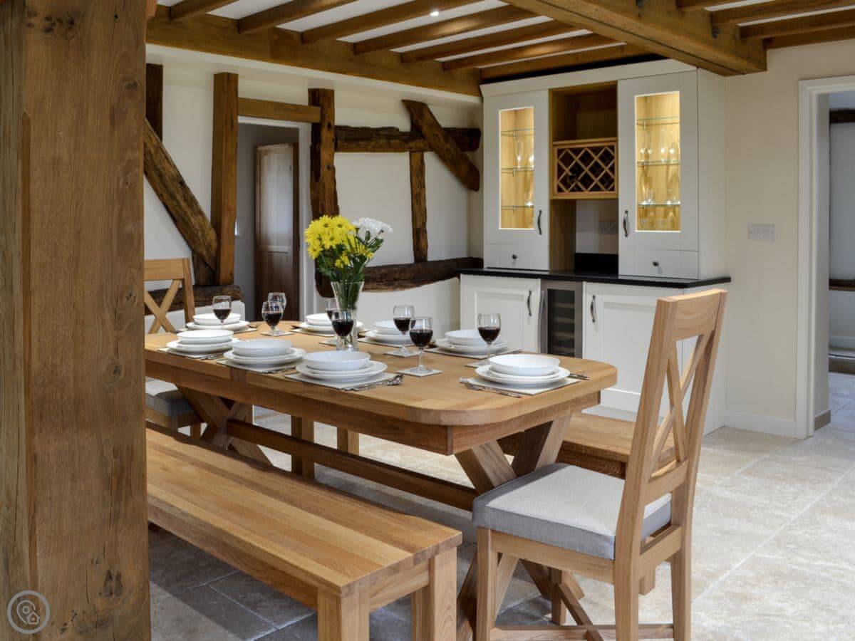 The barn has got a lot of the old beams and vaulted ceilings. There's a log burner for cooler evenings. The dining table seats eight comfortably. Outside, there's a patio, a covered veranda area, and a hot tub.