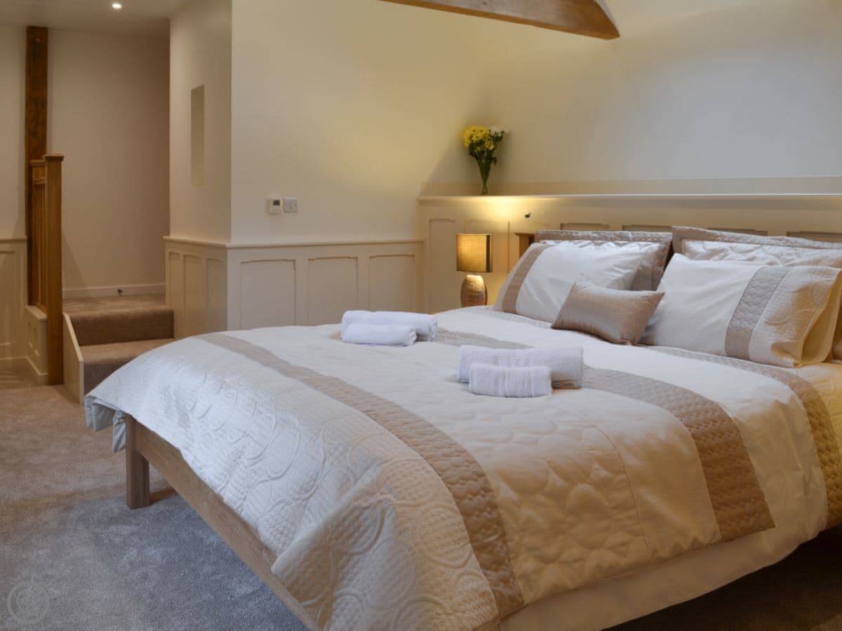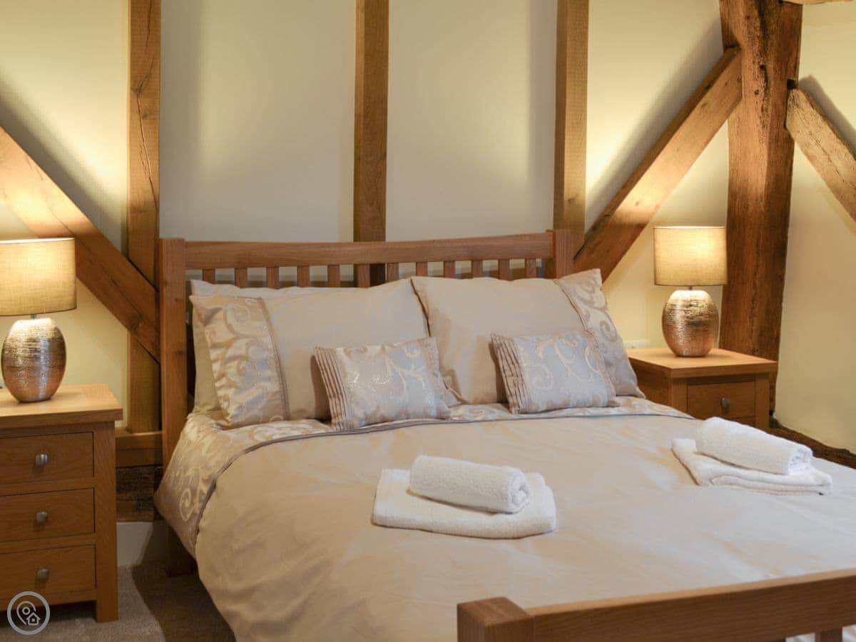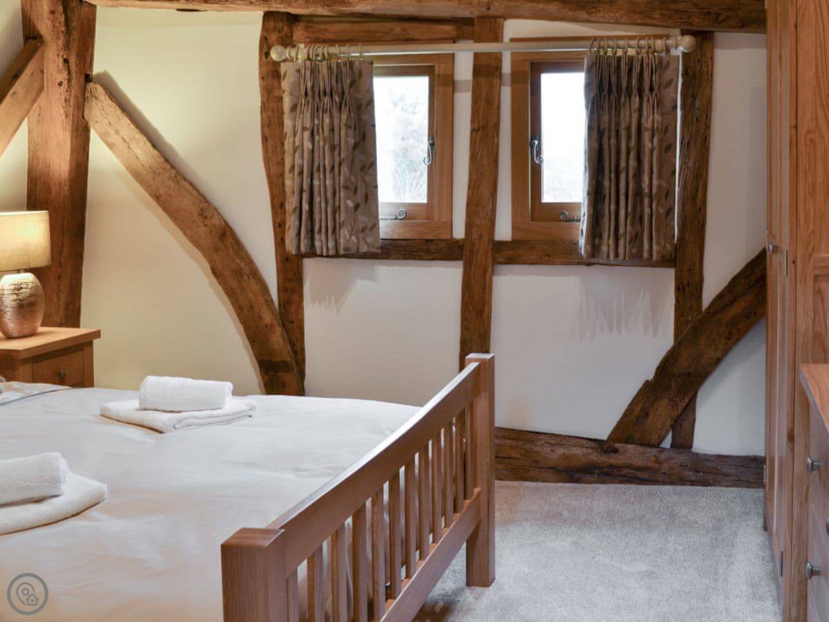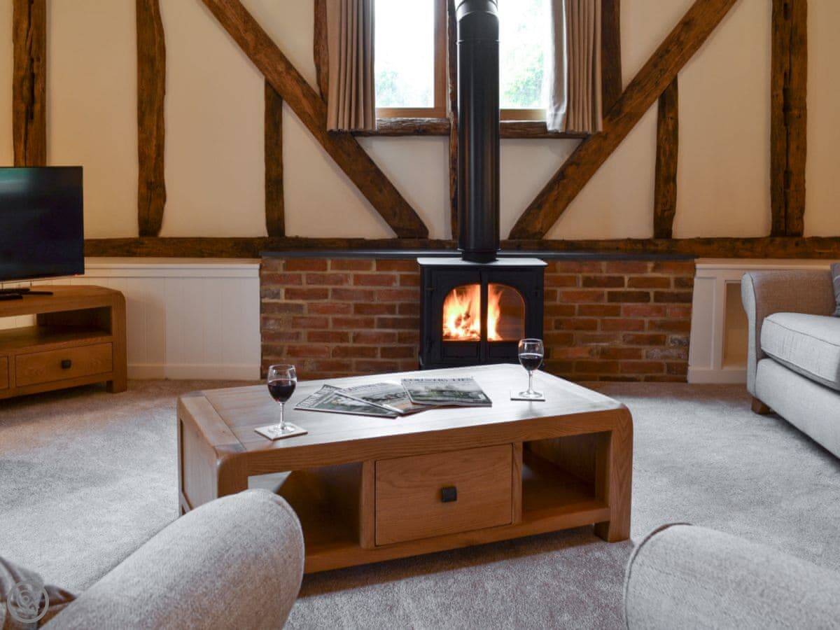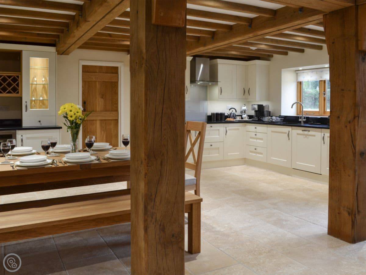 The barn has got a lot of the old beams and vaulted ceilings. There's a log burner for cooler evenings. The dining table seats eight comfortably. Outside, there's a patio, a covered veranda area, and a hot tub.
