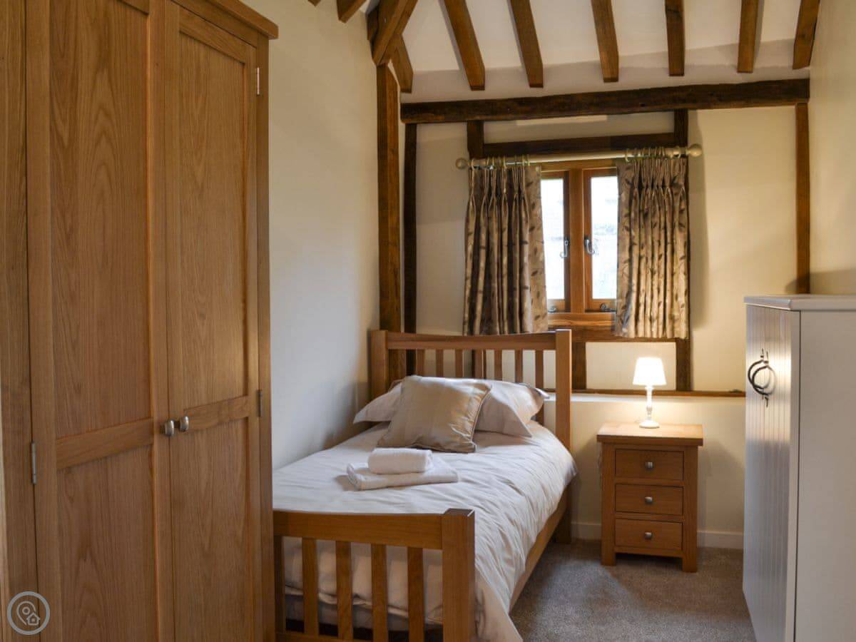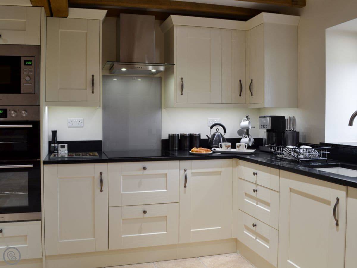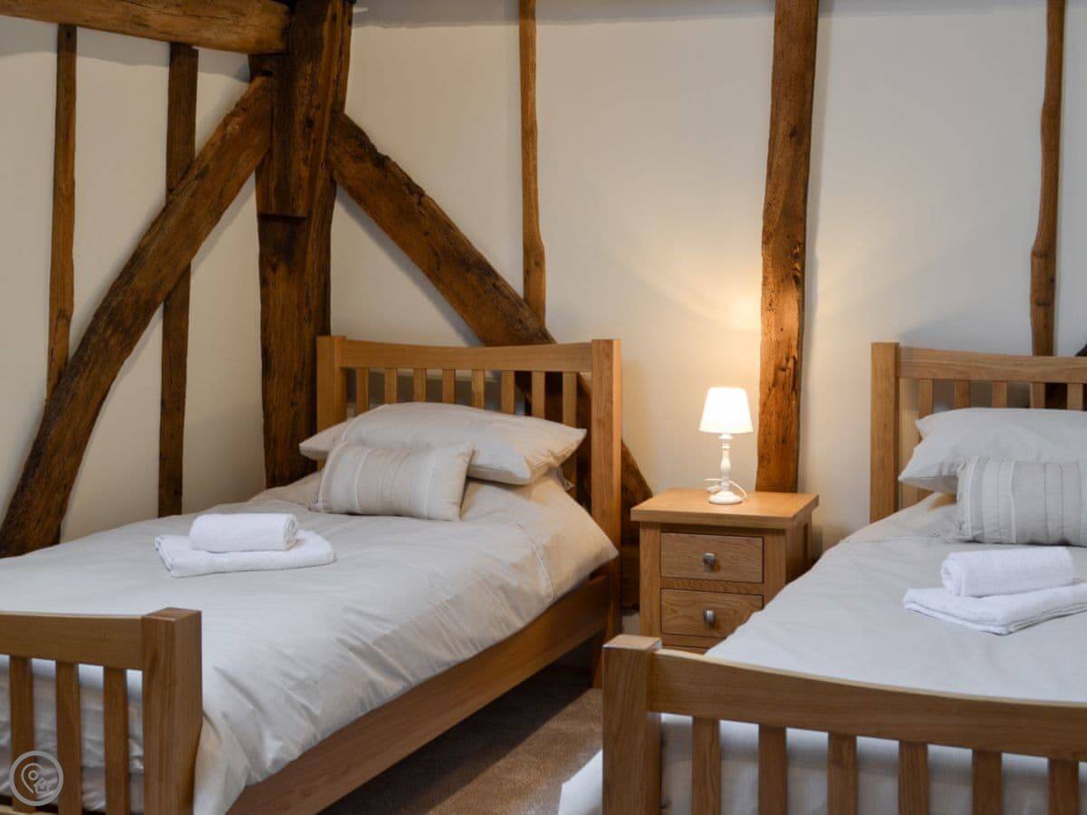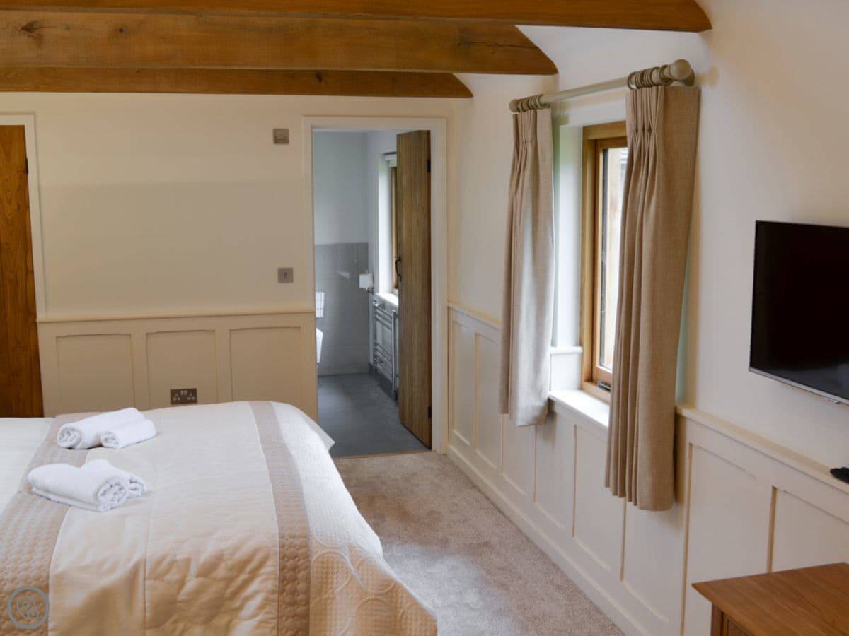 The barn has got a lot of the old beams and vaulted ceilings. There's a log burner for cooler evenings. The dining table seats eight comfortably. Outside, there's a patio, a covered veranda area, and a hot tub.