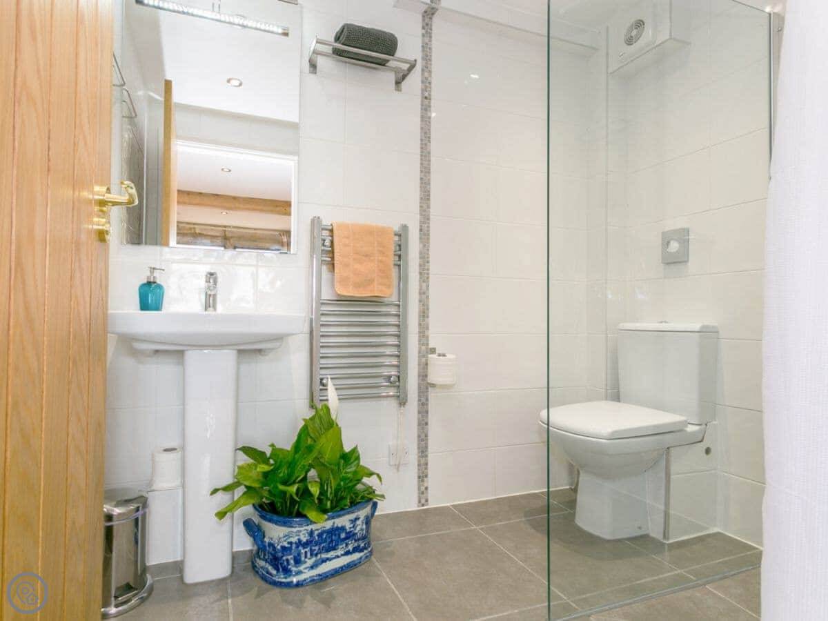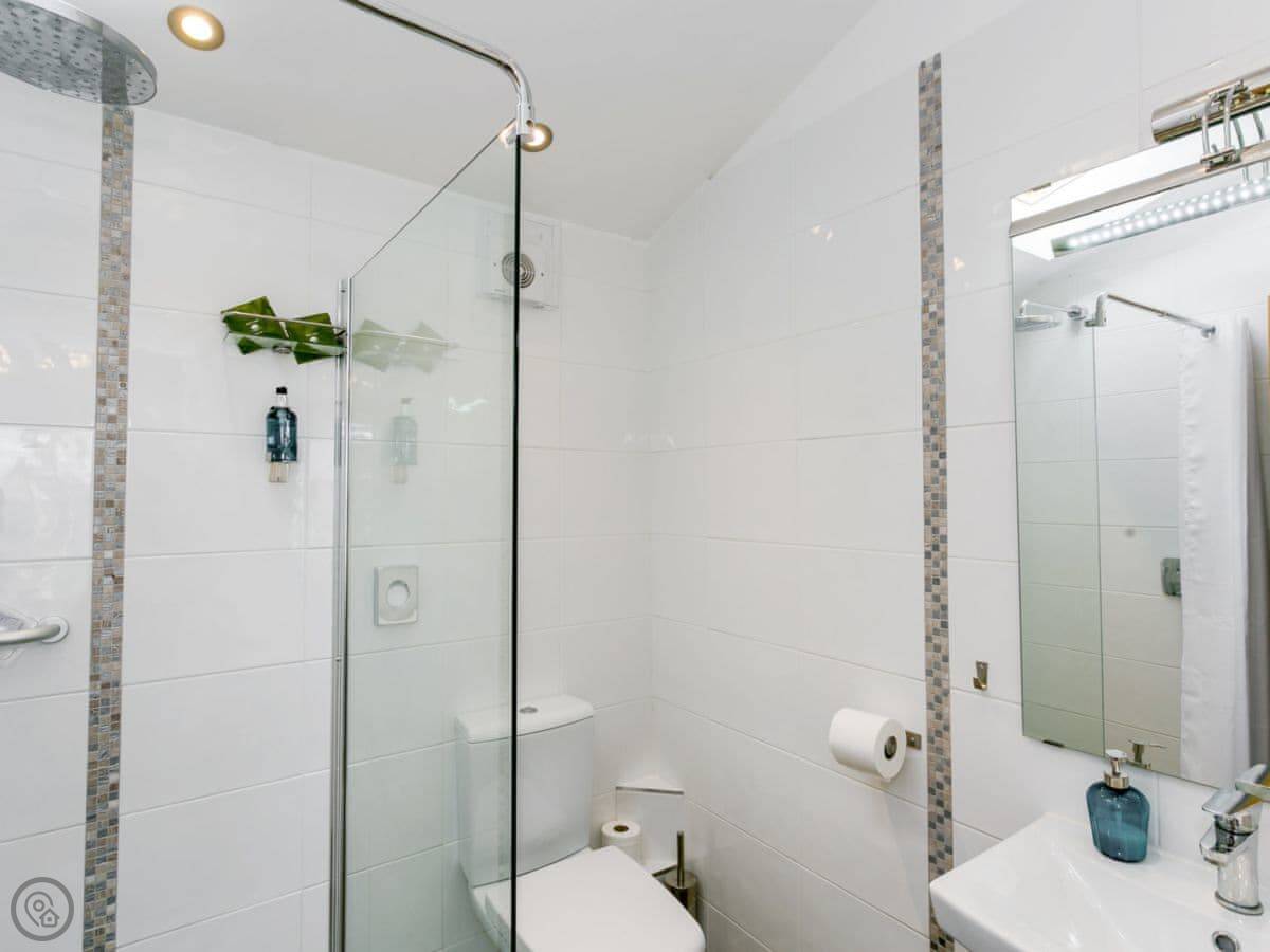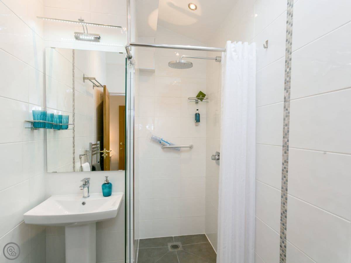 Sleeps four. Two bedrooms, both with their own bathrooms. There's a wet room on the ground floor too, which is handy. It's got a 4 star rating.