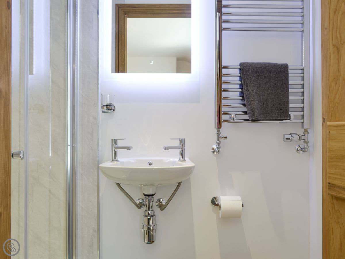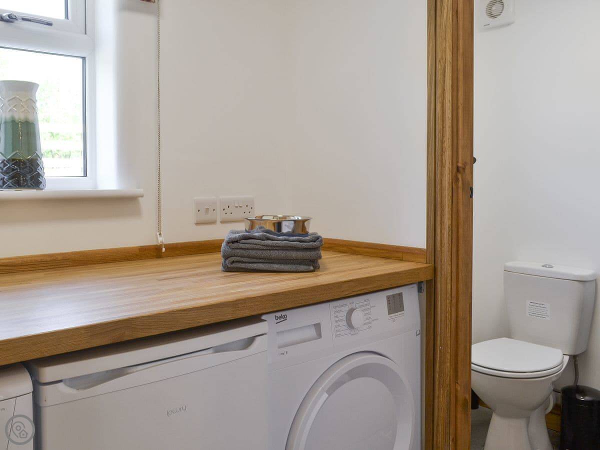 Inside, it's got a wood burner, a dishwasher, and a washing machine. Bedding and towels are included. There's a cot and a highchair if you need them. Parking is right there.