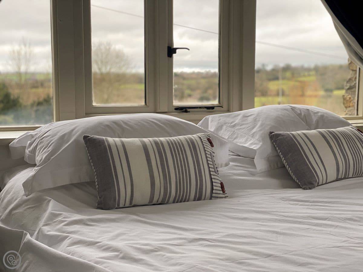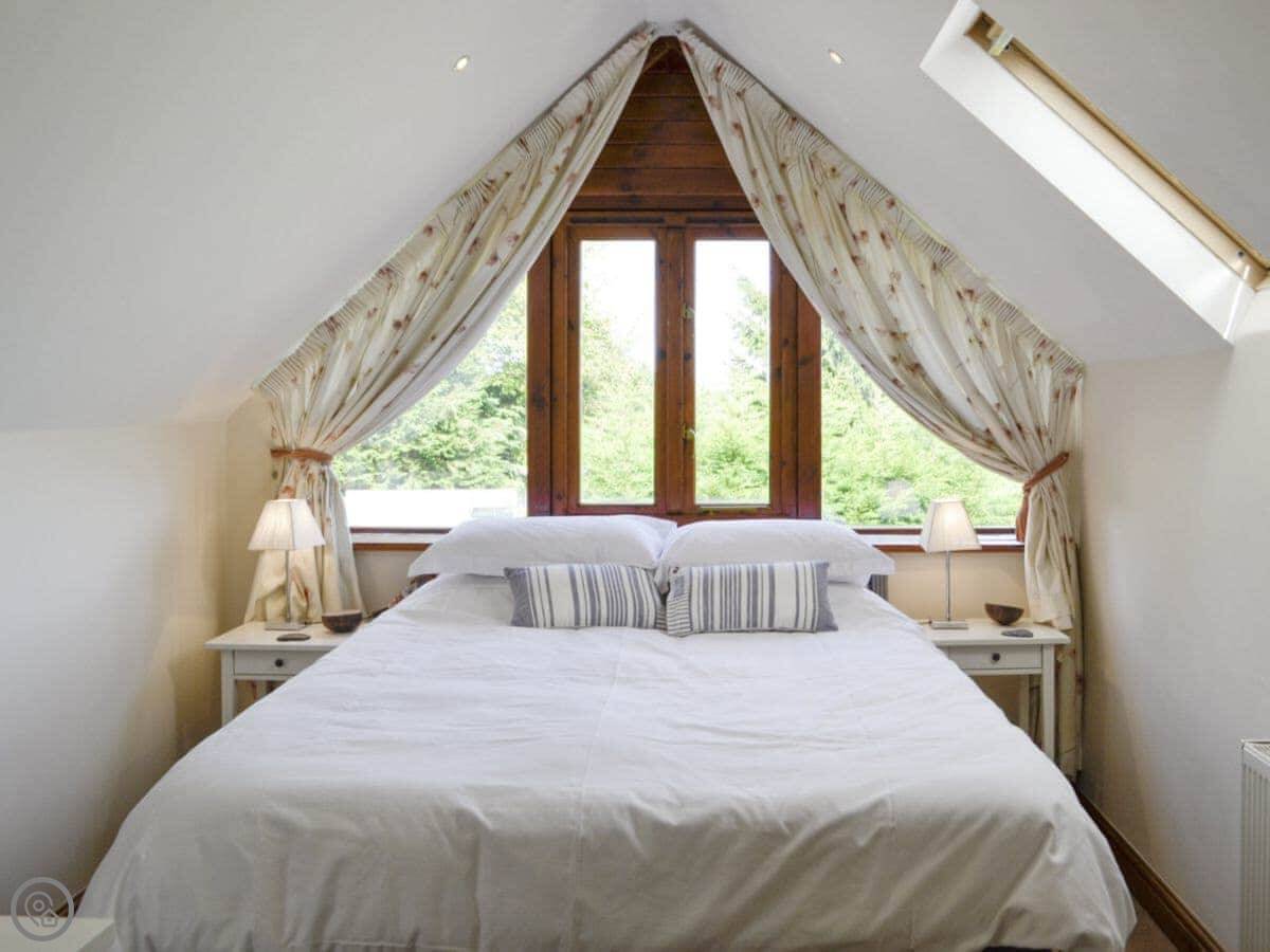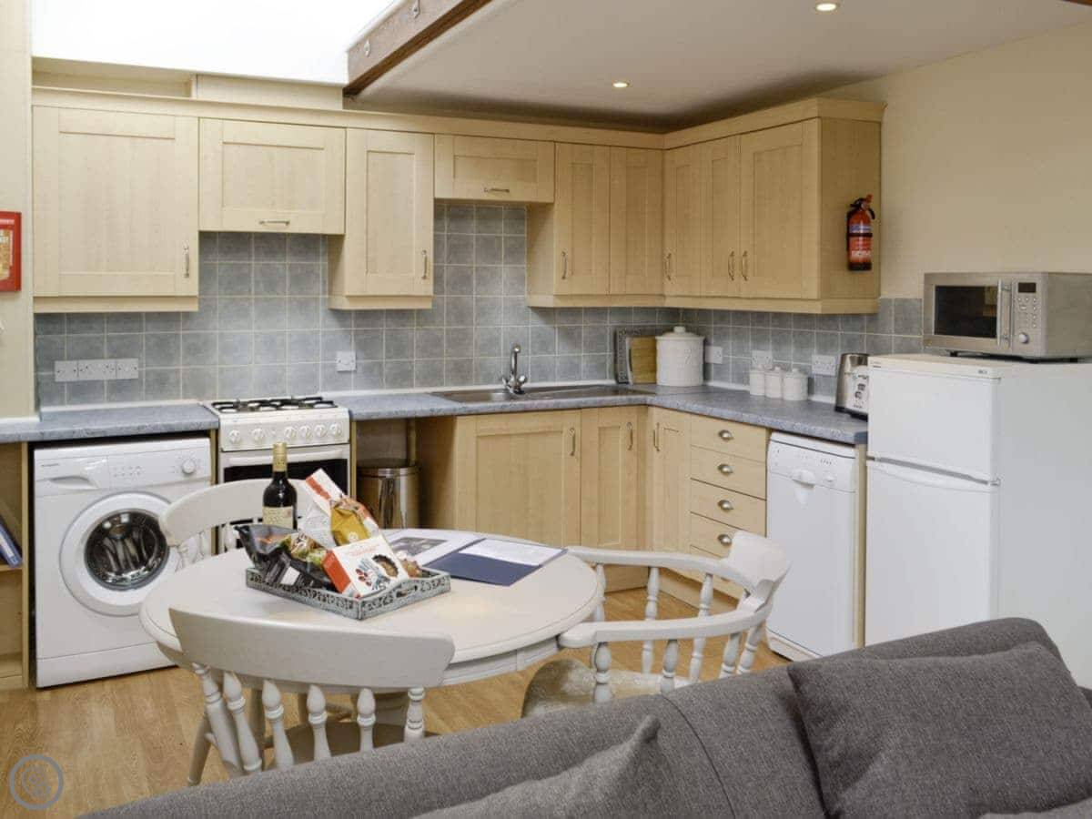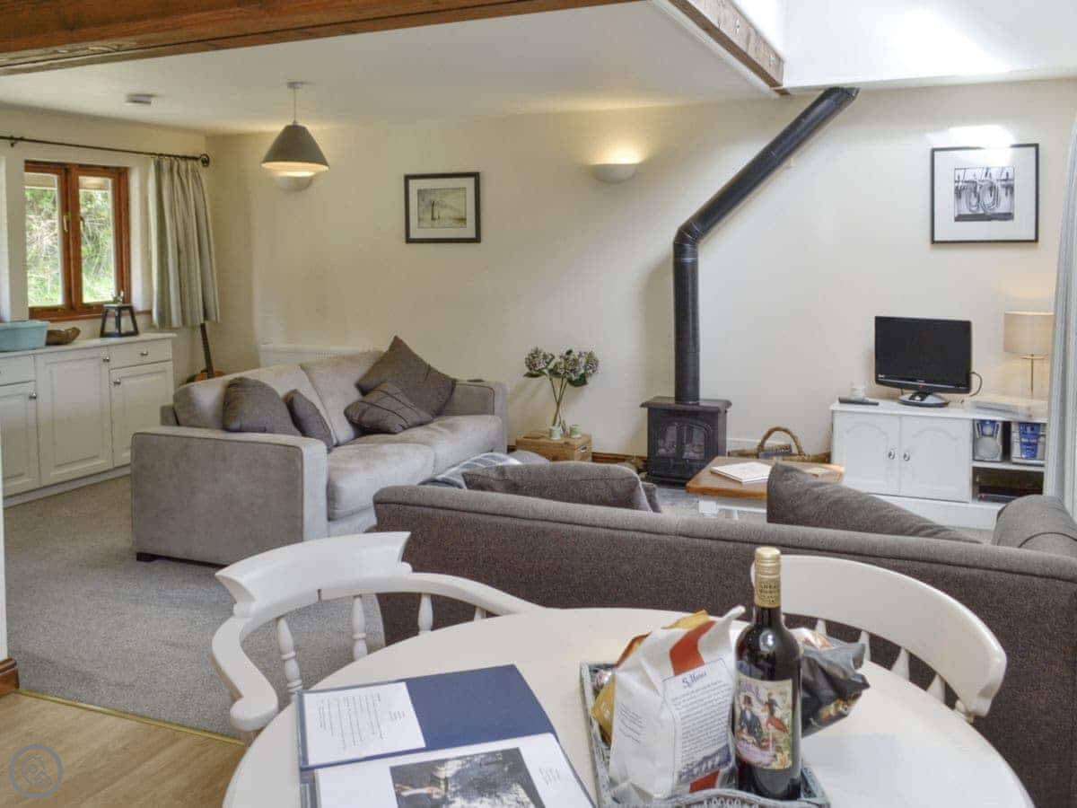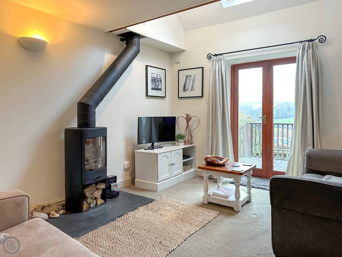 The main room is open plan. Kitchen, living area, and a wood burning stove. It’s got central heating too, so you won't be cold. There's a TV, WiFi, a washing machine, and a dishwasher. All bedding and towels are included. You can park right outside.