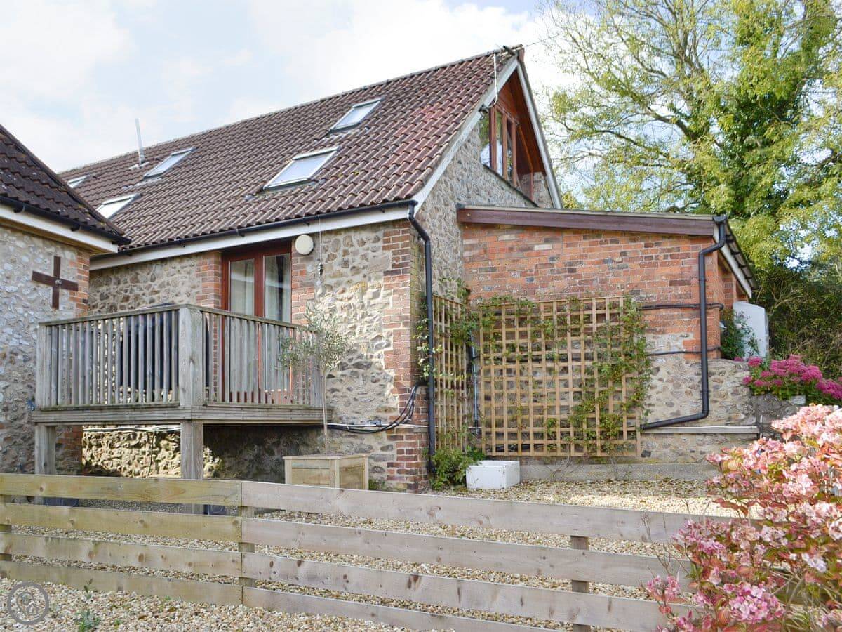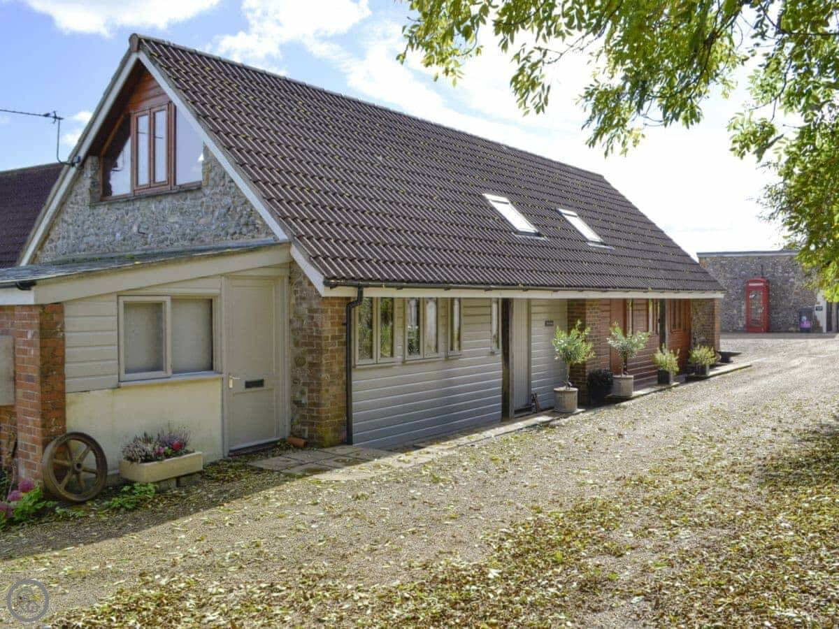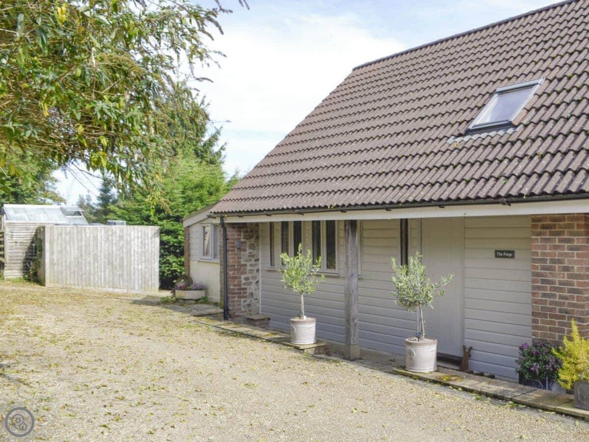 This place is the Forge. It's a barn conversion in Thorncombe, on the Dorset and Somerset border. It's part of a row, semi-detached. You're up in the hills here, so it's quiet and rural. The garden is enclosed, which is good for the dogs.