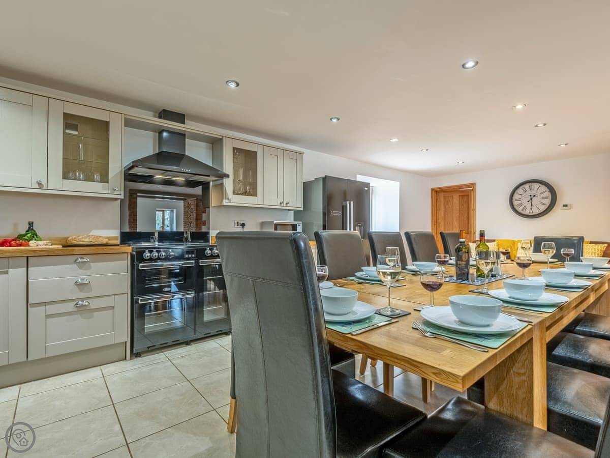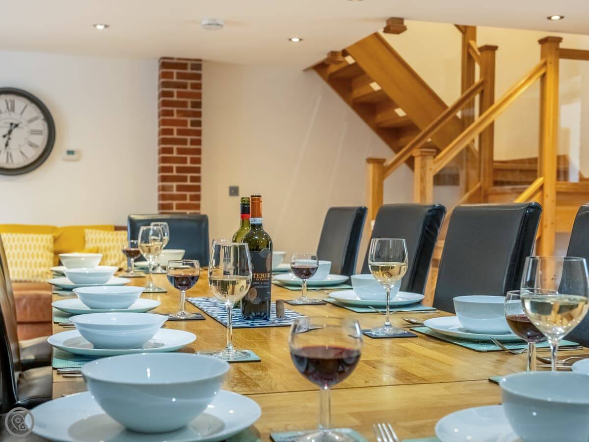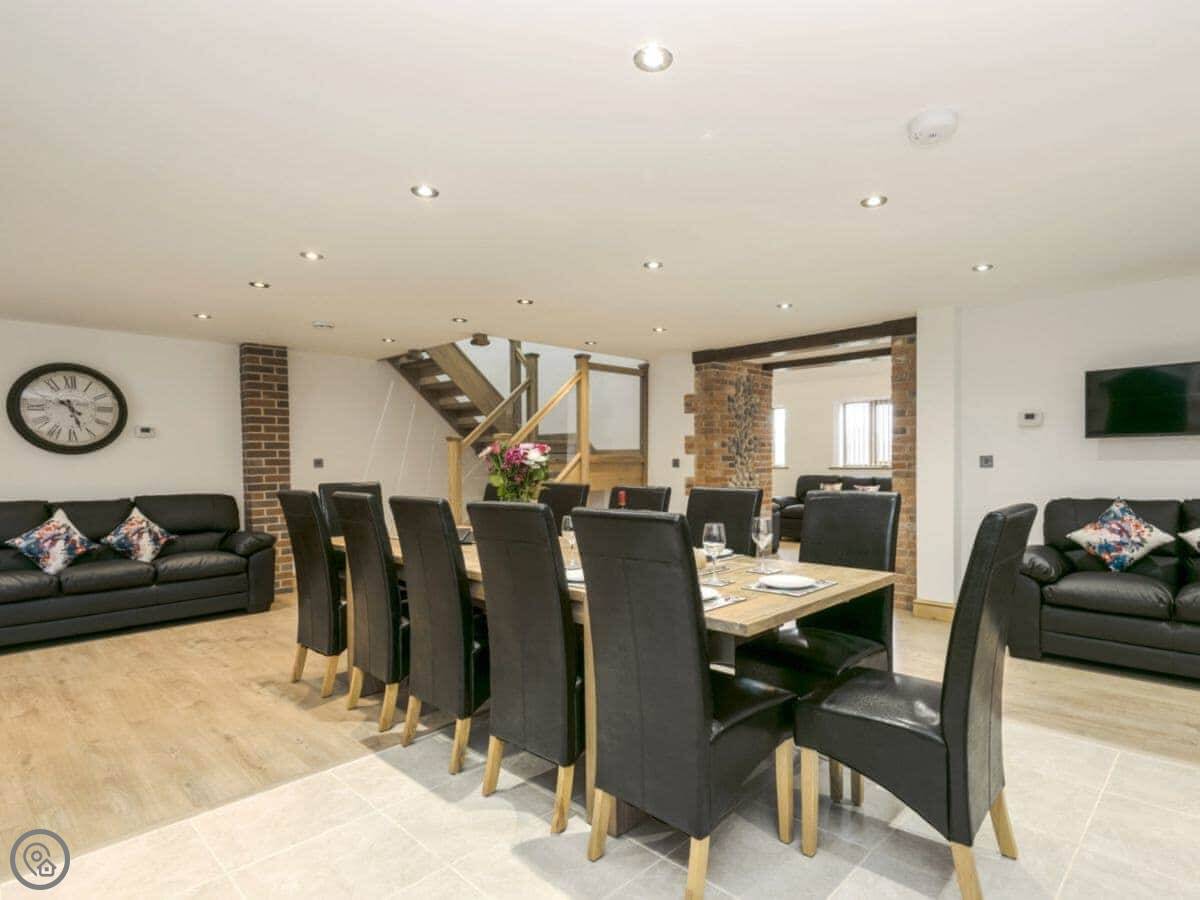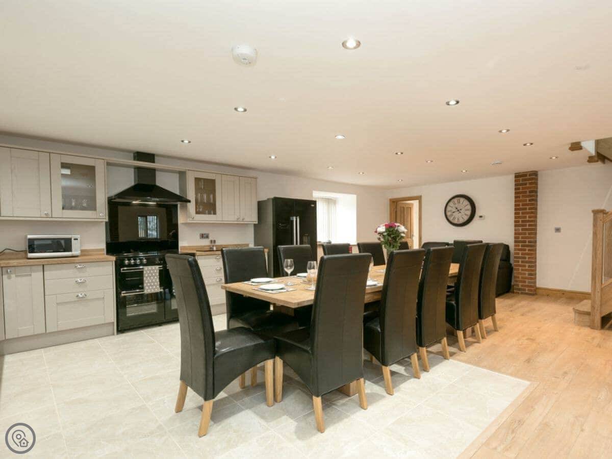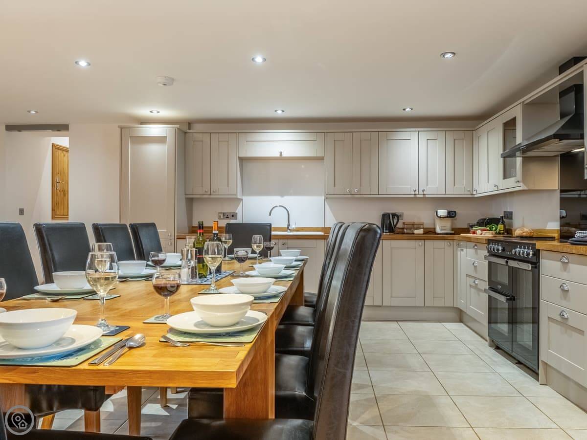It sleeps twelve people. Six bedrooms, four bathrooms. Three of those are en-suite. It's a 5 Star place, so it's well finished and has good kit. It's open plan downstairs, so it works for everyone being together.