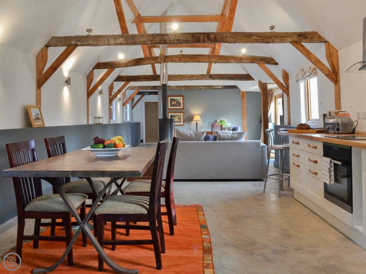 It sleeps four. Two bedrooms and two bathrooms, which is handy. It's all on one floor. The ceilings are high with beams, and the main room is open-plan. The floors are concrete with rugs. It's got a 4 Star rating, so it's comfortable and well-equipped.