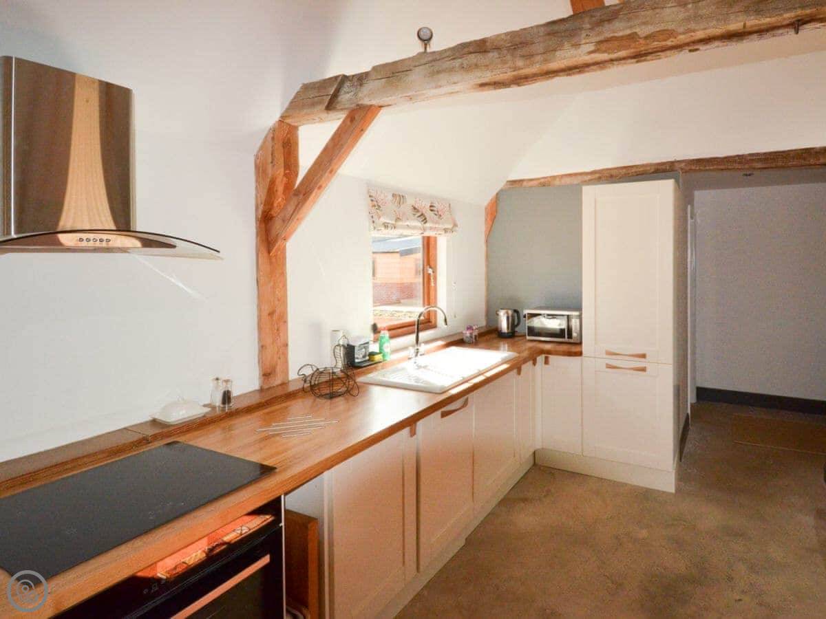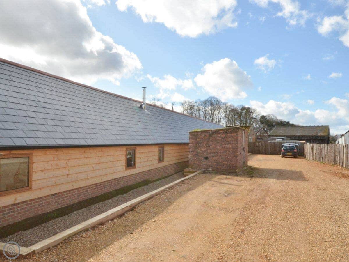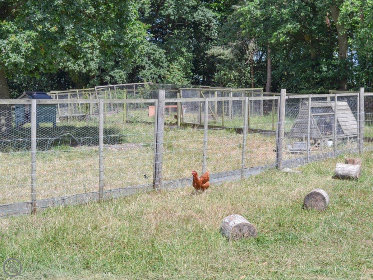 Outside, there's that shared courtyard with raised beds where we grow veg and herbs. There's a fire pit, a pizza oven, and a BBQ there for everyone to use. There's a kids' play area. The chickens wander about, so you get fresh eggs. If you're bringing horses, we can do livery – just ask beforehand.