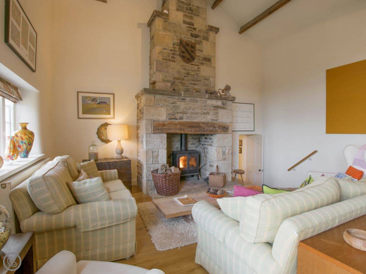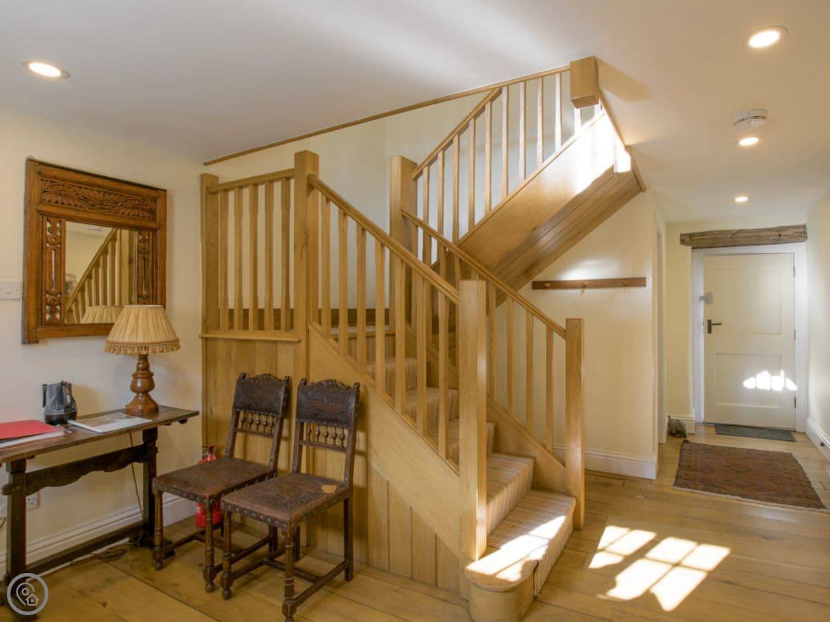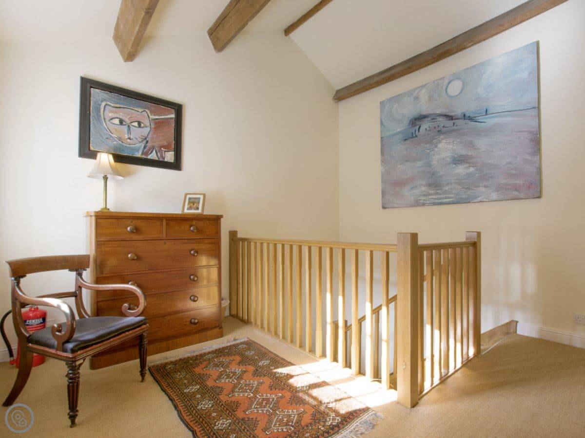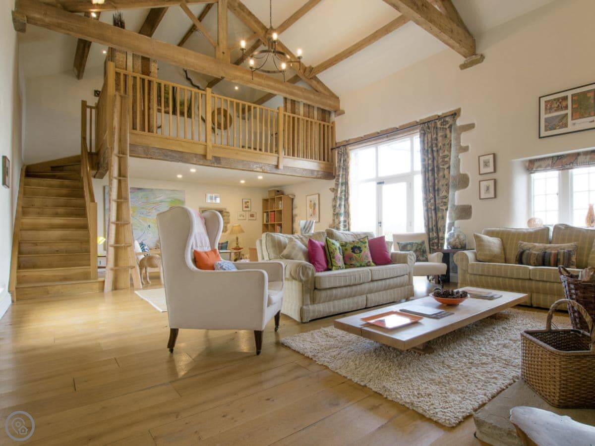It sleeps six in three double bedrooms. There are two bathrooms. It's got a 4 Star rating. The living area is big with a high ceiling and a stone fireplace. There's a sort of raised gallery seating area that kids tend to like. The stairs are open and a bit steep. It's a 17th century farmhouse, so that's how they are.