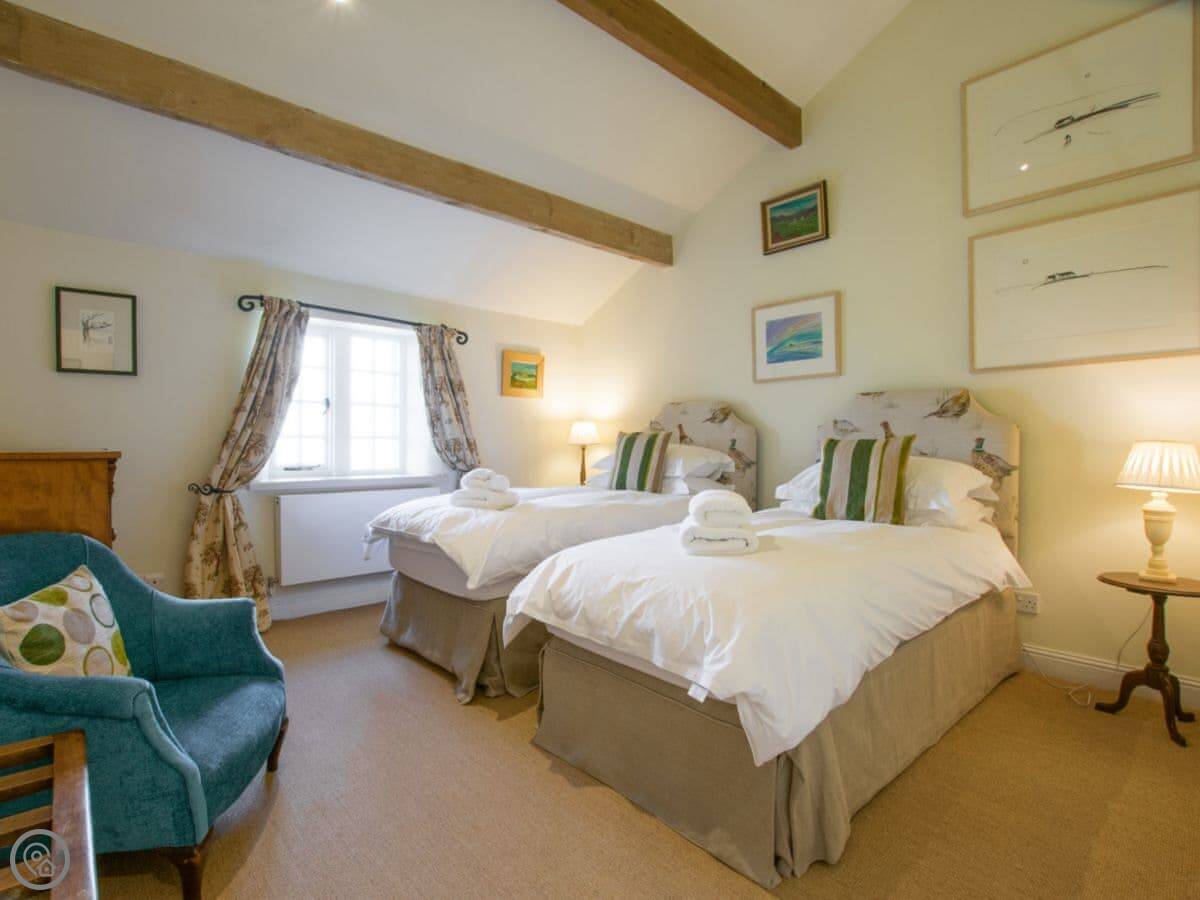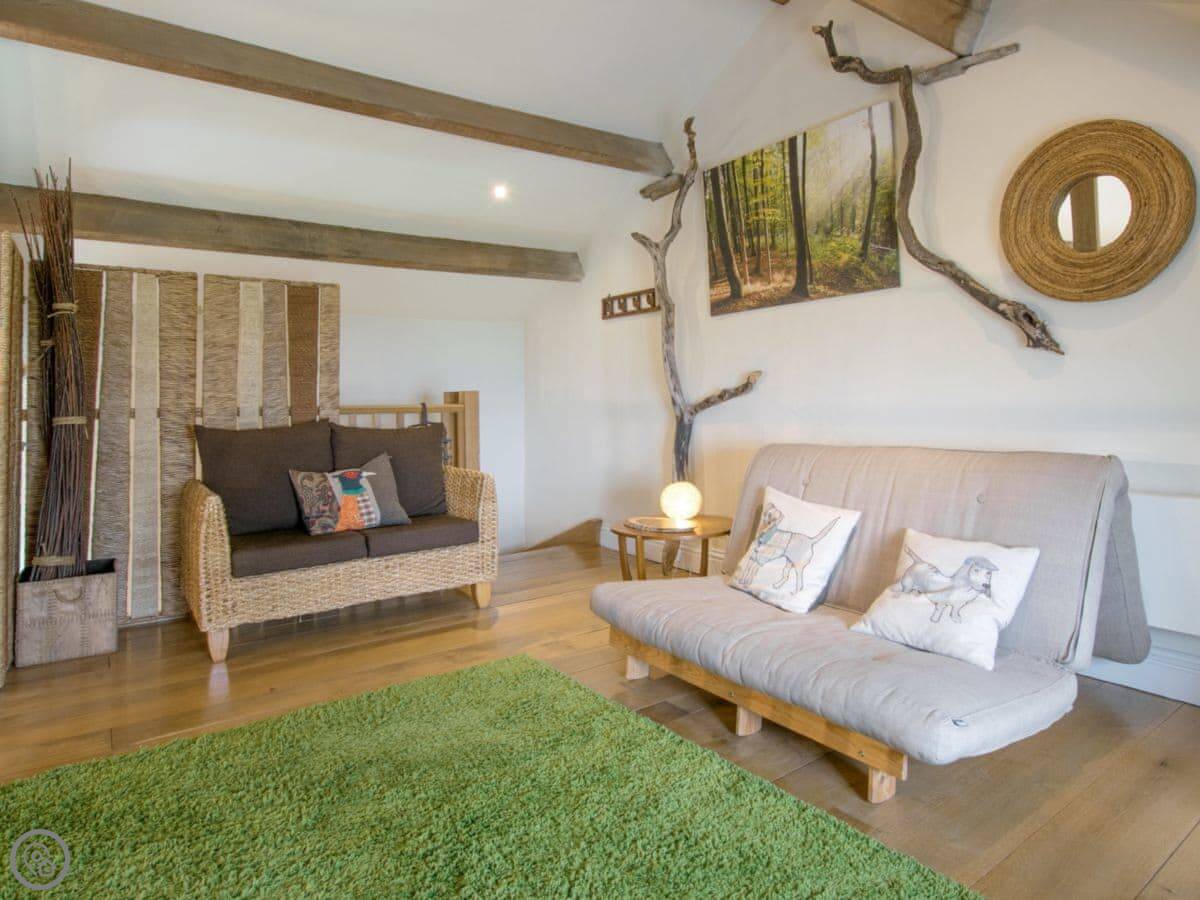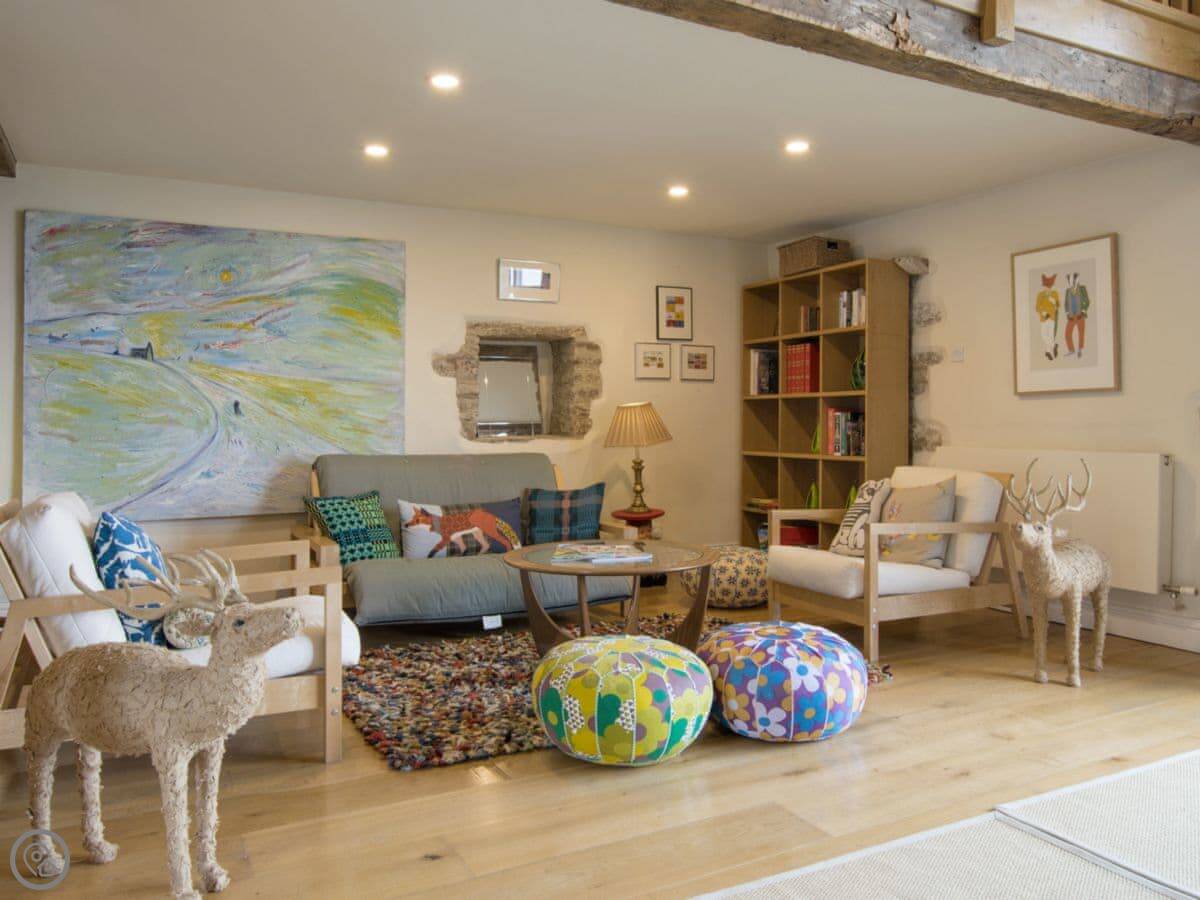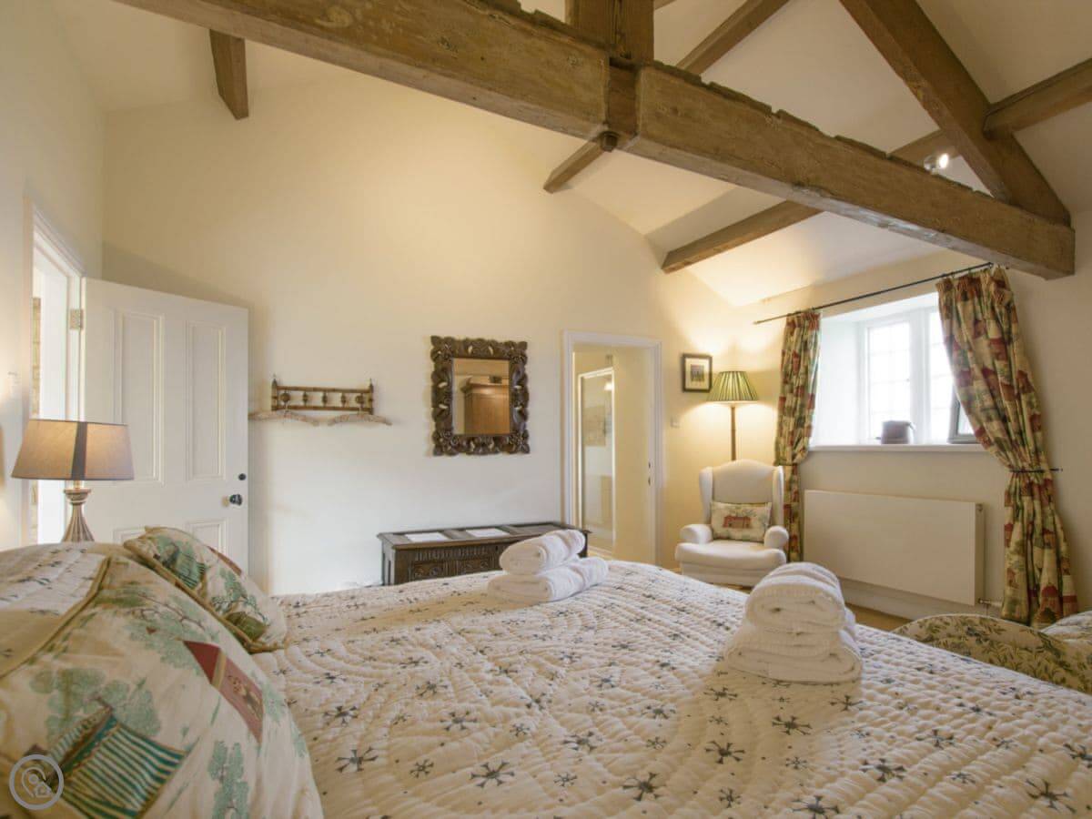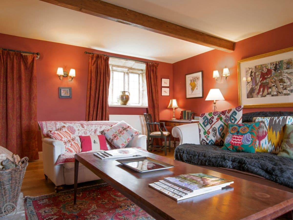 It sleeps six in three double bedrooms. There are two bathrooms. It's got a 4 Star rating. The living area is big with a high ceiling and a stone fireplace. There's a sort of raised gallery seating area that kids tend to like. The stairs are open and a bit steep. It's a 17th century farmhouse, so that's how they are.