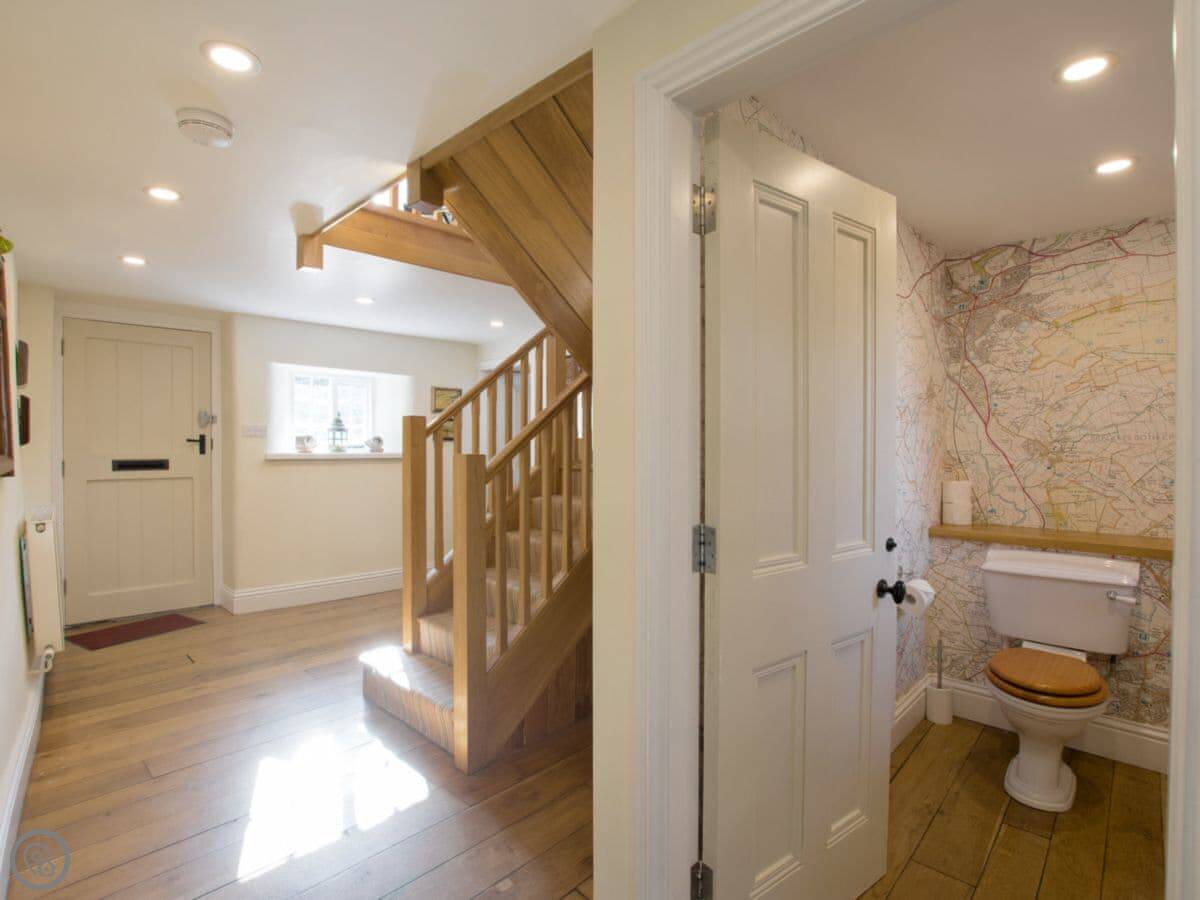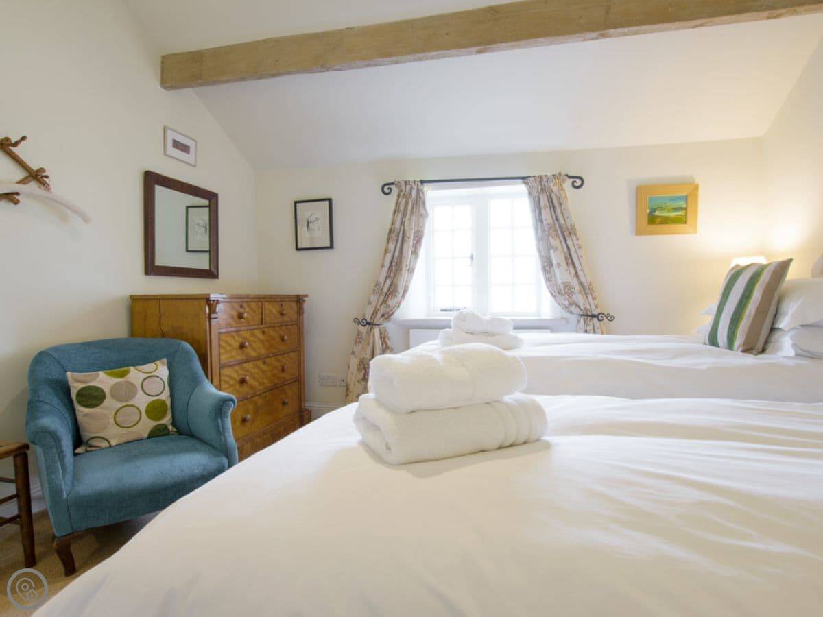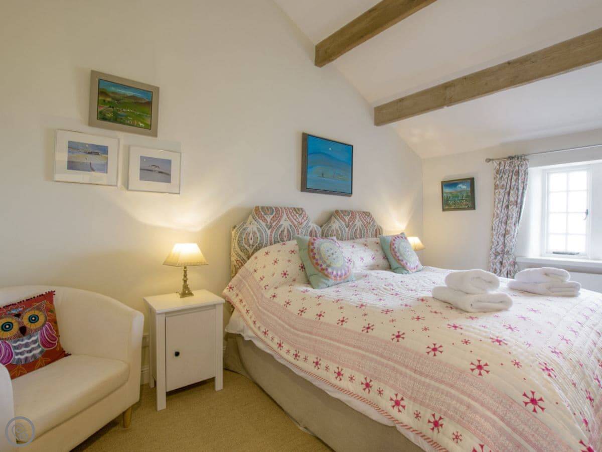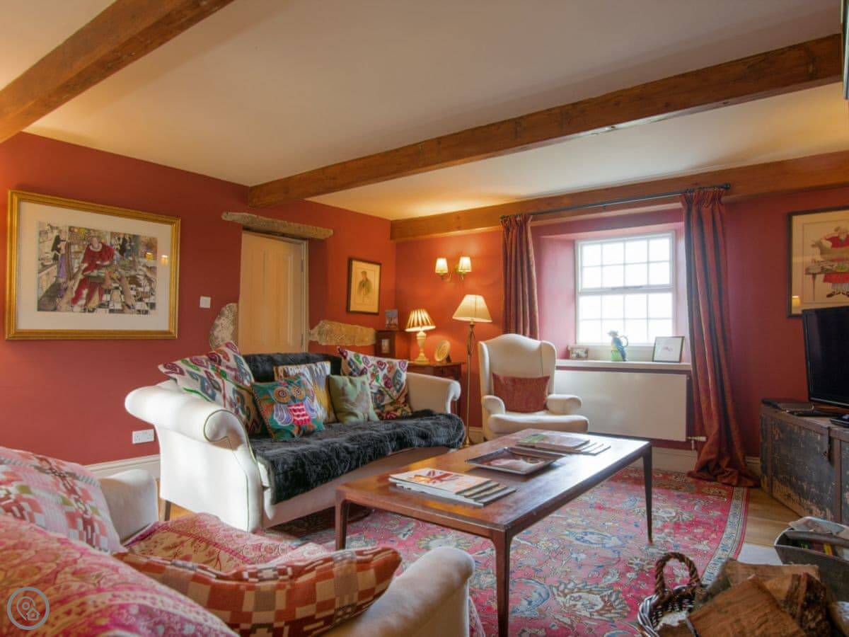 It sleeps six in three double bedrooms. There are two bathrooms. It's got a 4 Star rating. The living area is big with a high ceiling and a stone fireplace. There's a sort of raised gallery seating area that kids tend to like. The stairs are open and a bit steep. It's a 17th century farmhouse, so that's how they are.
