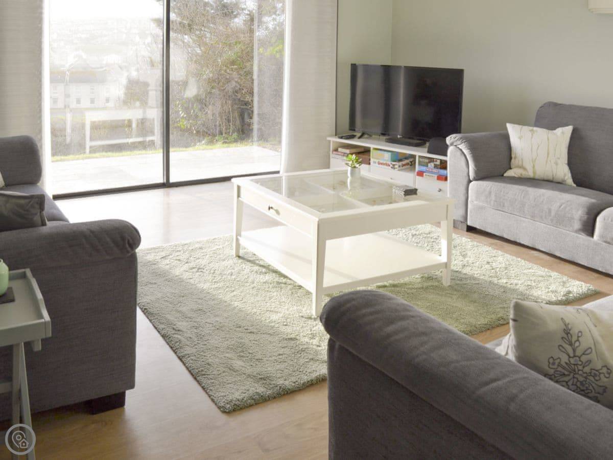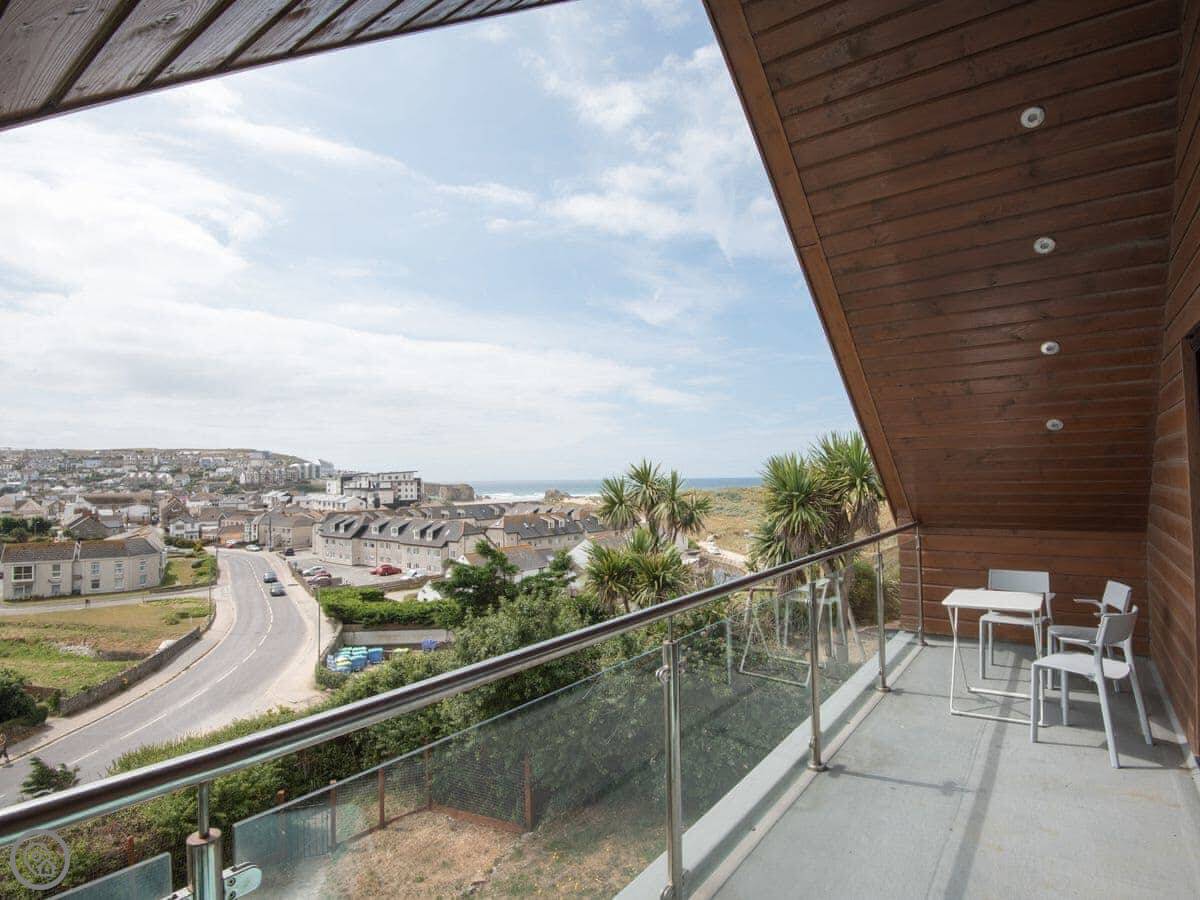 The living area is upstairs, which is where the best views are. Big doors open onto a covered balcony with glass railings. It's a solid spot for a coffee or a drink in the evening. The garden is enclosed. Parking is on the drive.