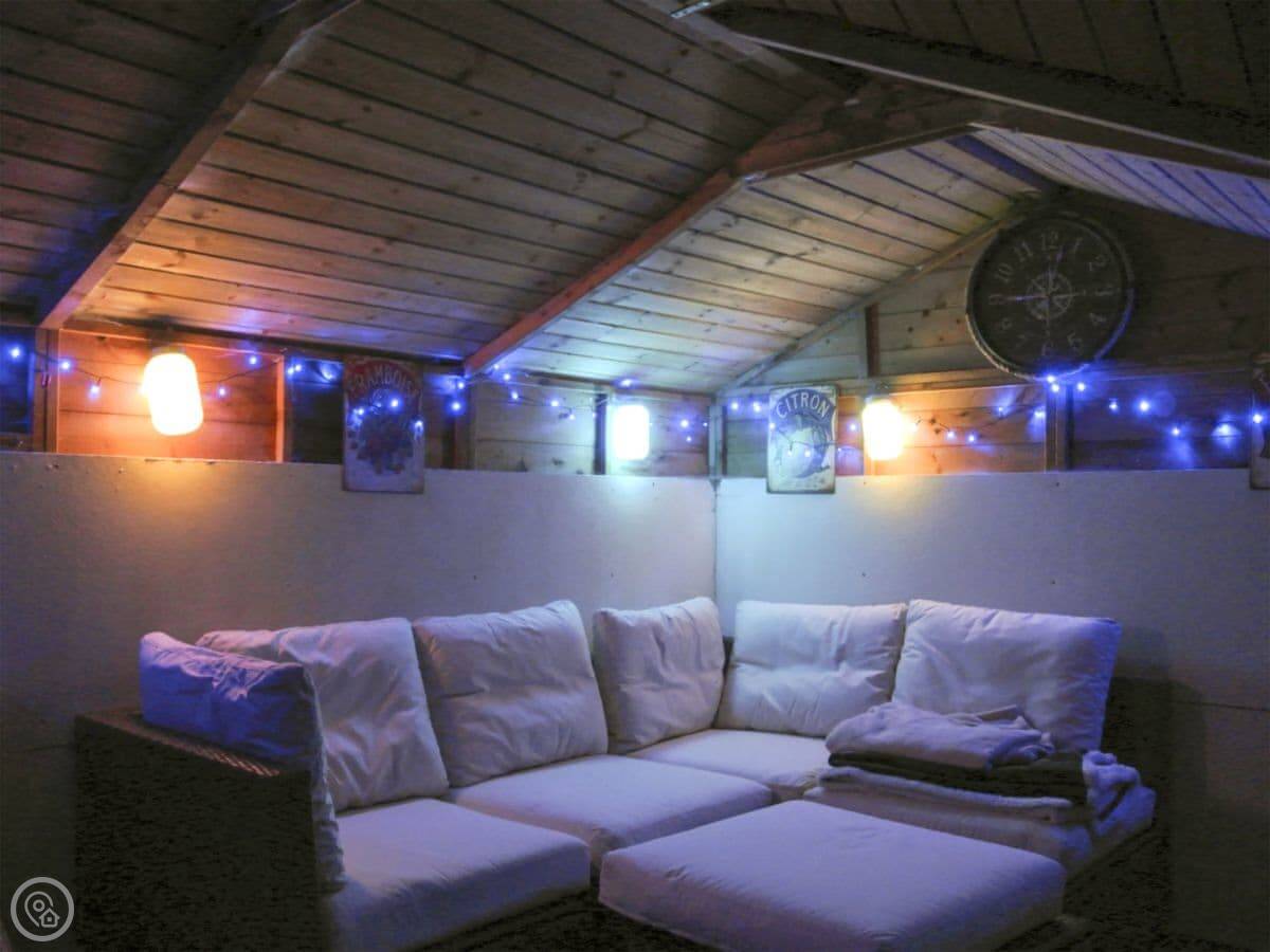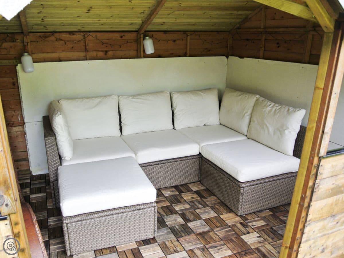 The garden is enclosed, which is good if you have kids or a dog. There's a patio with a barbecue, a lawn, and a little summer house with seating and lights. It's a nice spot for a morning coffee.