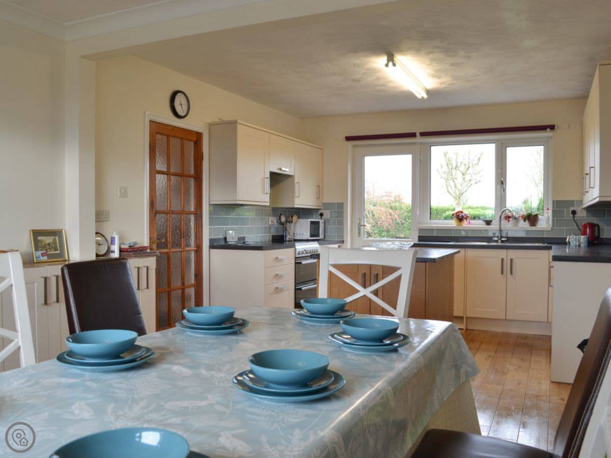 It sleeps eight. Four bedrooms, two bathrooms. The kitchen has a big table for everyone to sit round. It's got a 3 Star rating, which means it's comfortable and clean. It's not a show home, it's a place to stay.