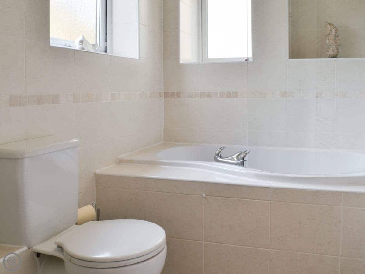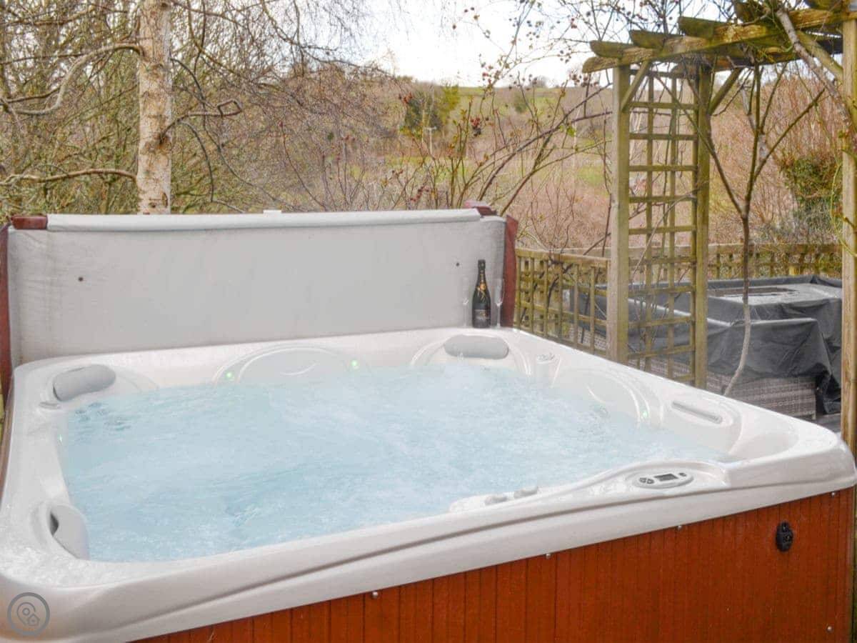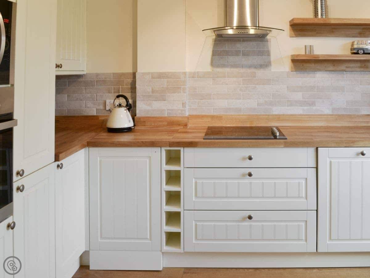 It sleeps eight people in four bedrooms. There are two bathrooms. It's got a 4 Star rating, so it's comfortable and well looked after. The kitchen has oak worktops. The garden is enclosed and there's a hot tub. There's also a shed with a kids' pool table in it.