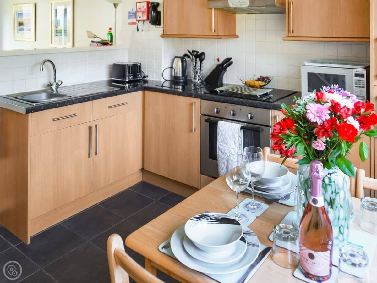 Inside, it's open plan downstairs. The TV, bedding and towels are all included. There's a cot if you need it.
