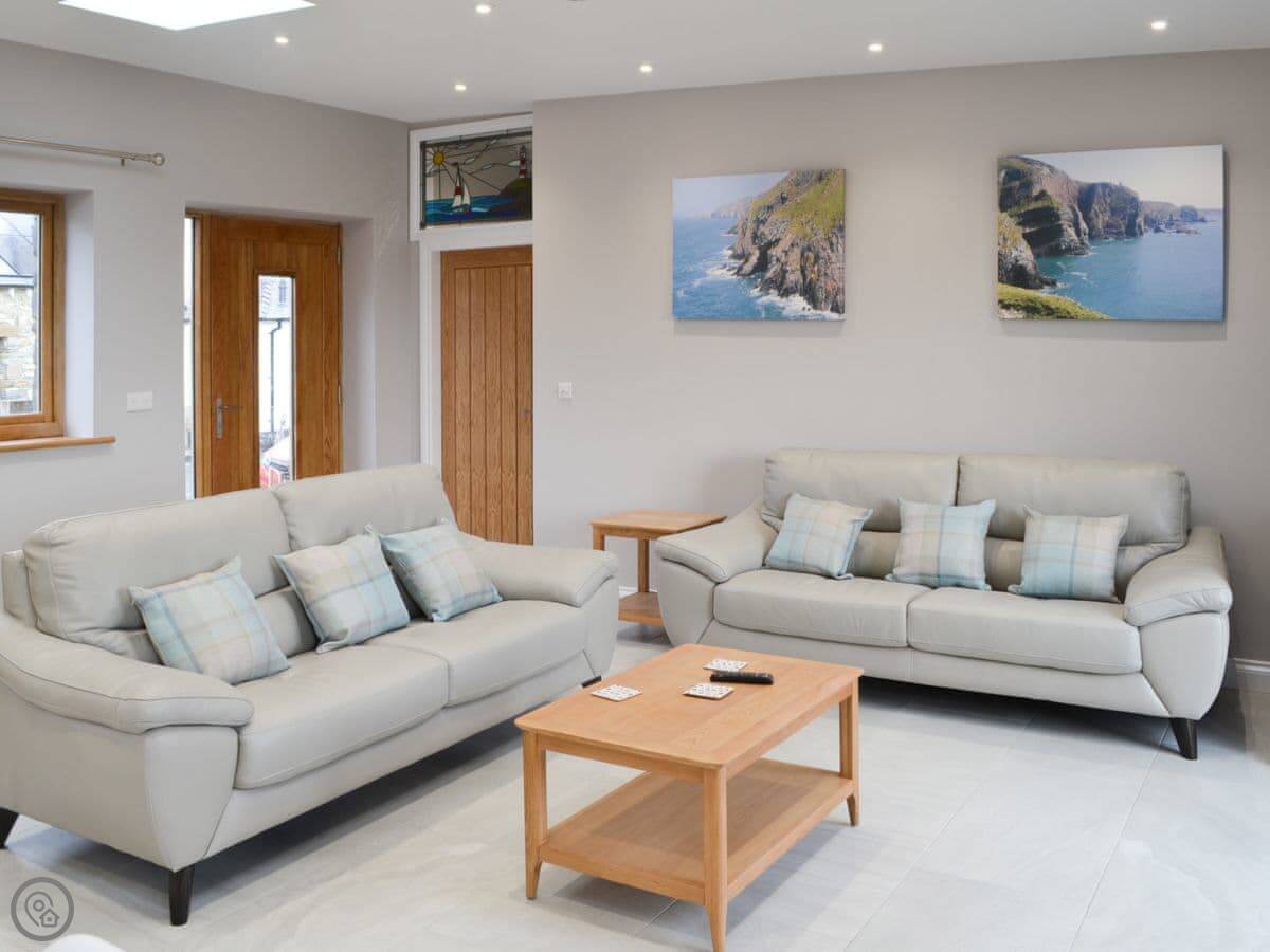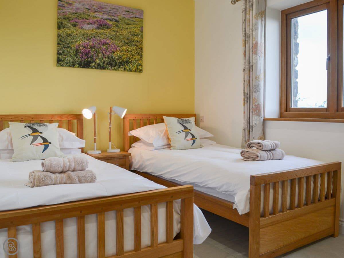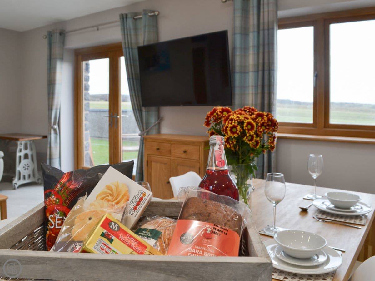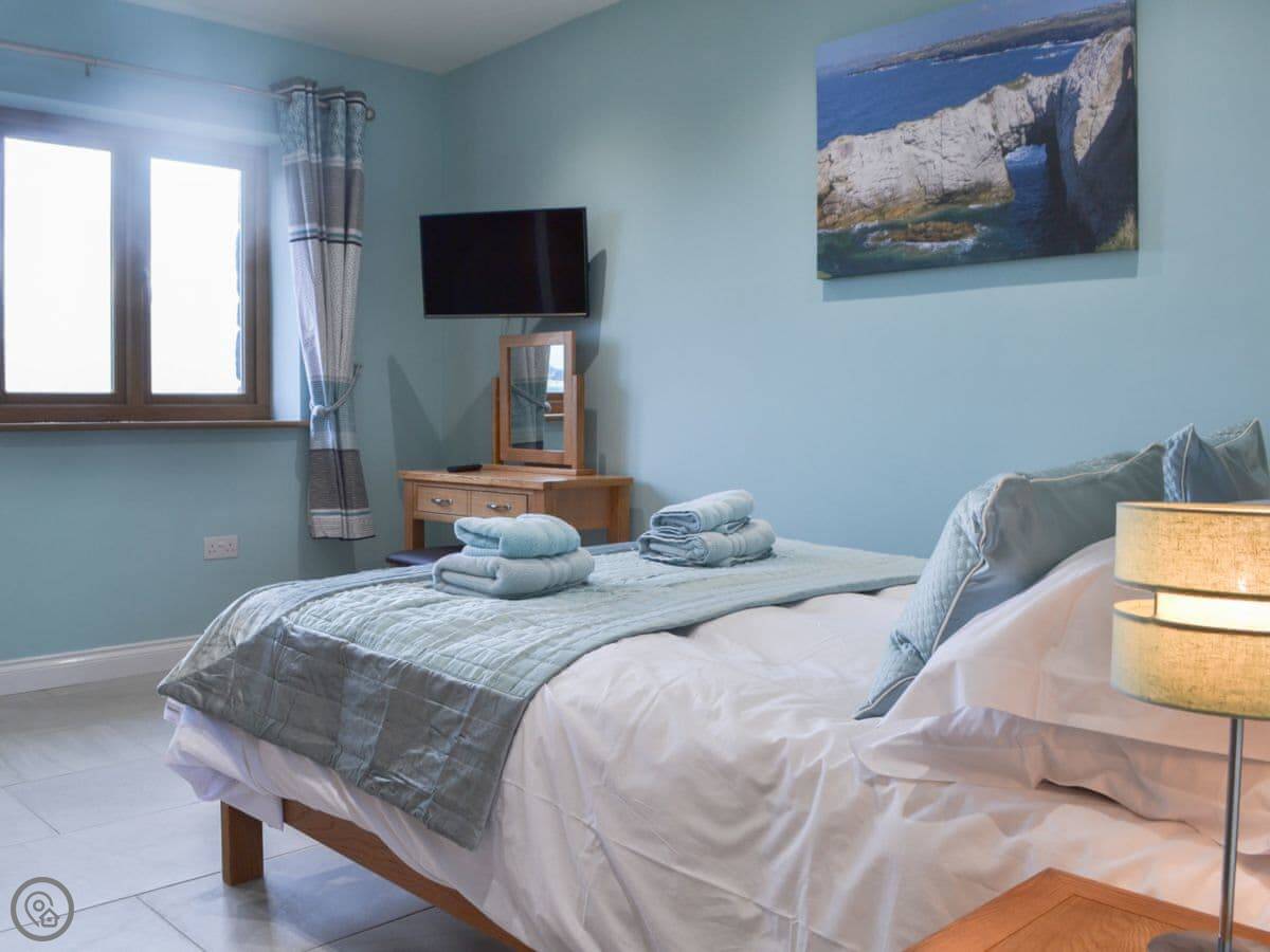The location is quiet, on coastal farmland. You're about a mile from Porth Dafarch beach, which is a nice sandy cove. Trearddur Bay is a bit further on, maybe ten minutes in the car. They've got shops, pubs, and restaurants there.