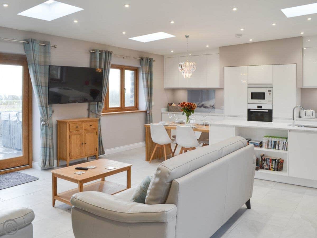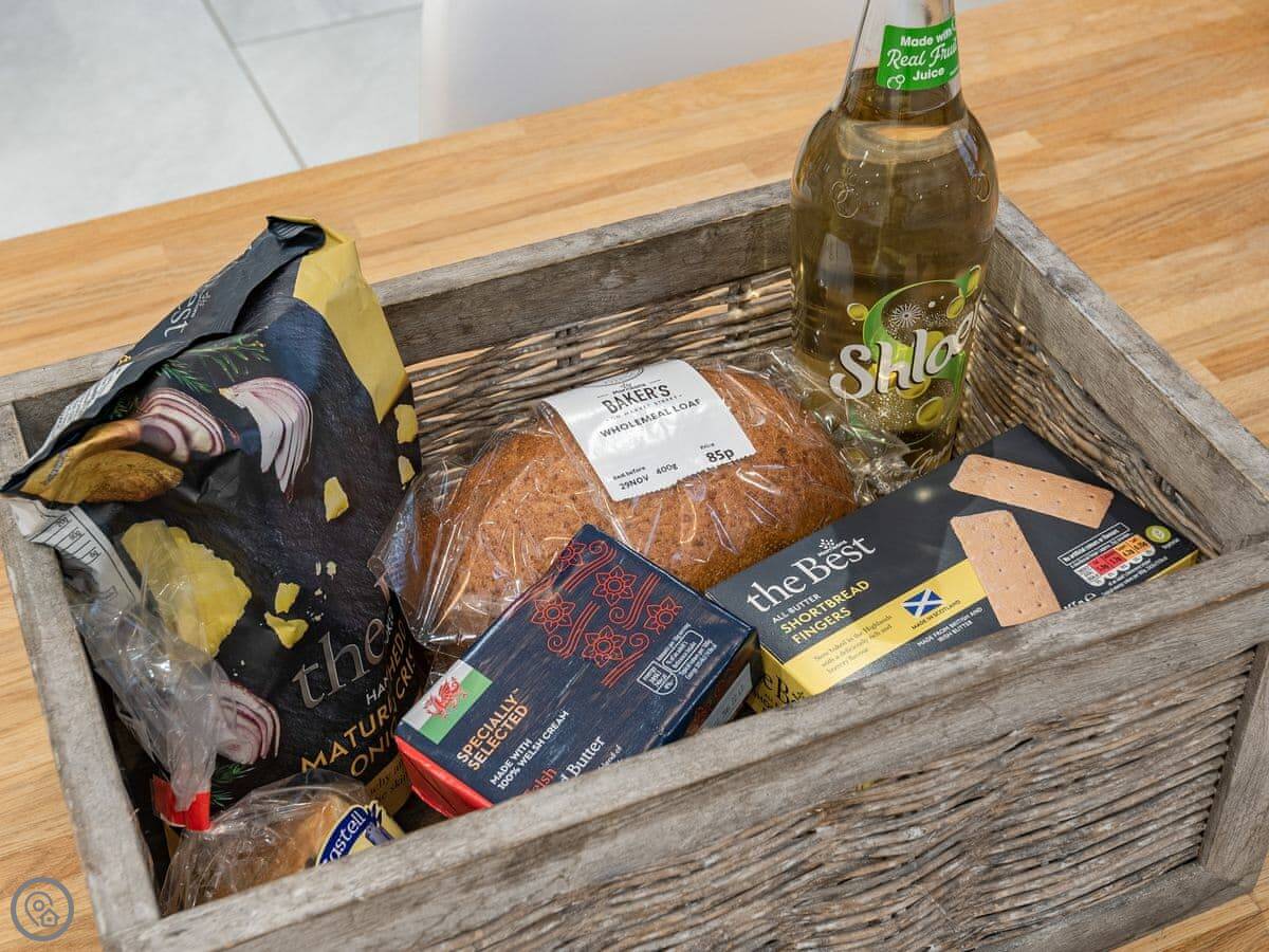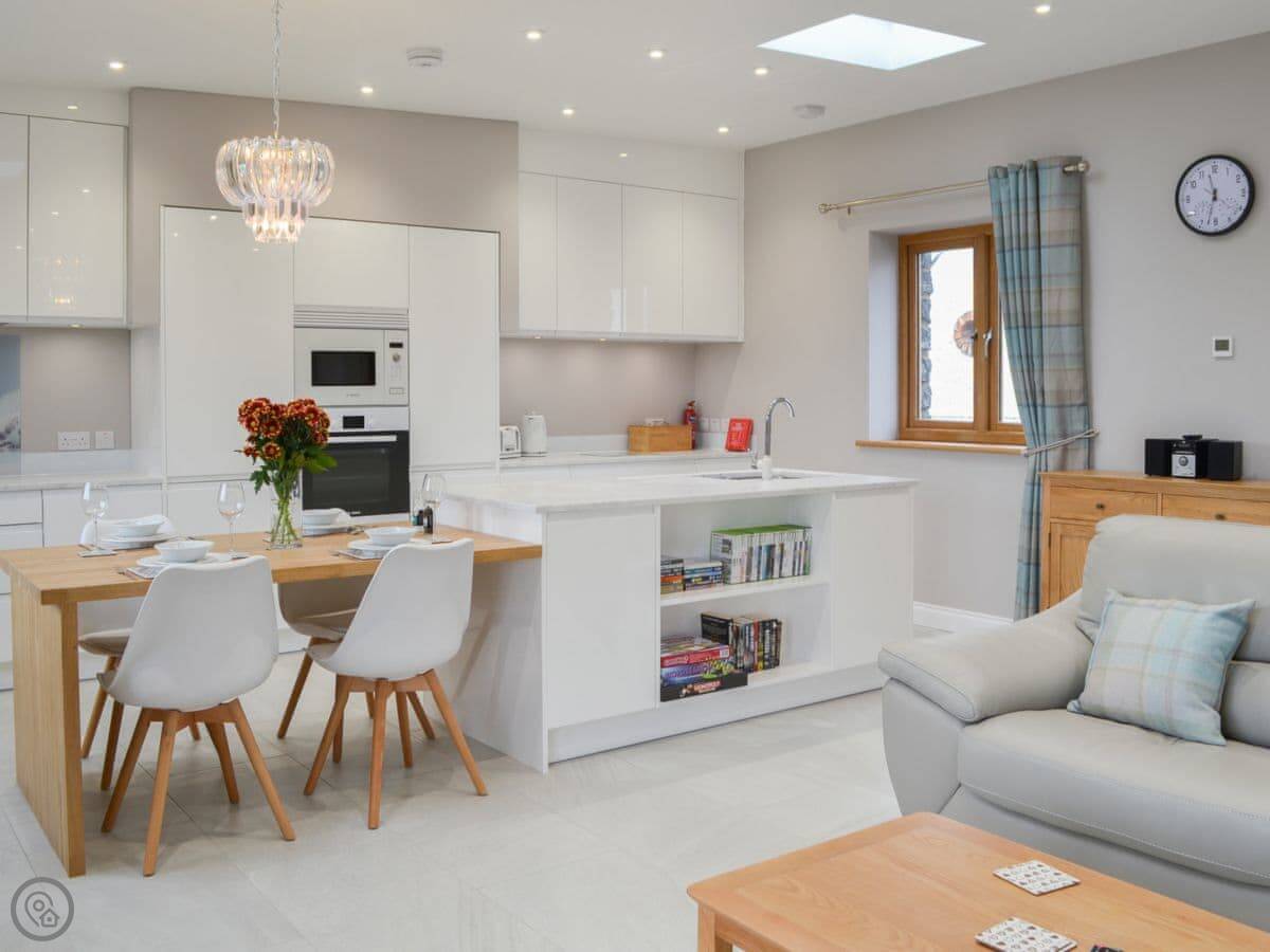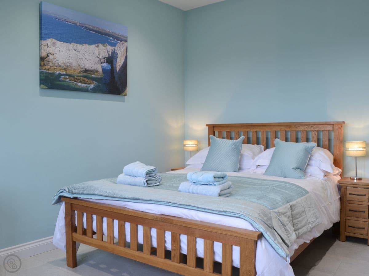 The location is quiet, on coastal farmland. You're about a mile from Porth Dafarch beach, which is a nice sandy cove. Trearddur Bay is a bit further on, maybe ten minutes in the car. They've got shops, pubs, and restaurants there.