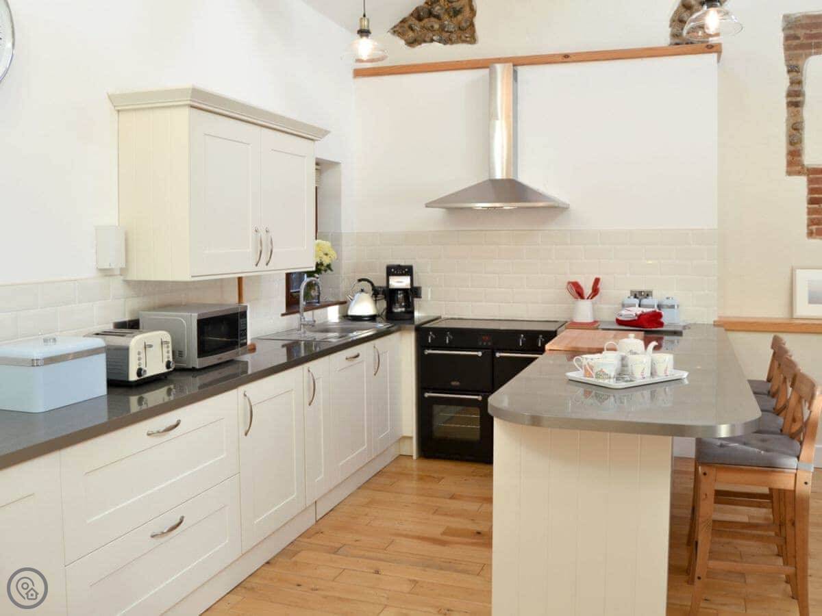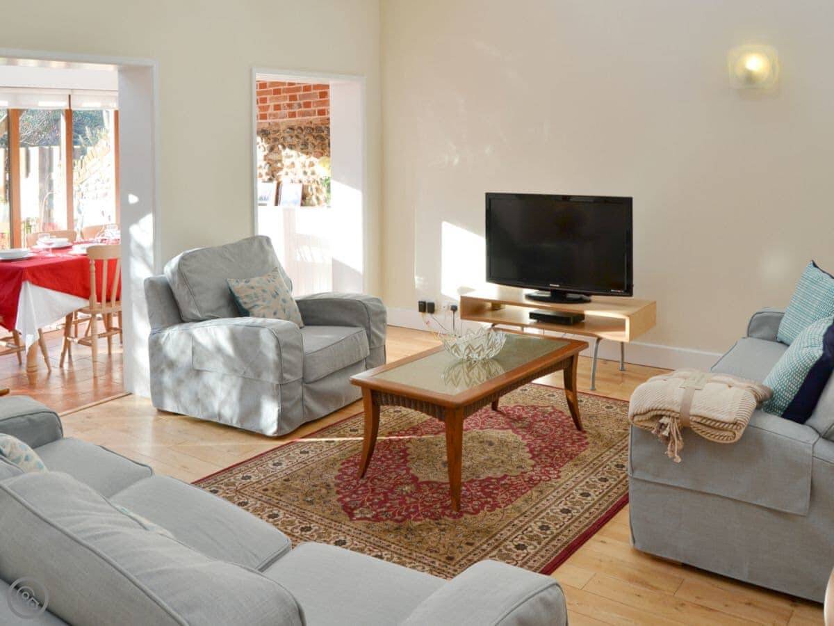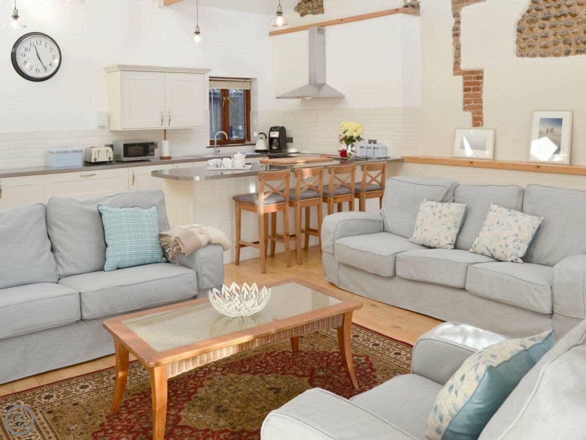 It's a 4 Star place. It's been done up, so it's clean and modern inside. The main room is open plan. There's a big kitchen island people tend to gather round, a dining area, and then the sofas by the TV. French doors open straight into the courtyard from the dining bit. The garden faces south, so it gets the sun.