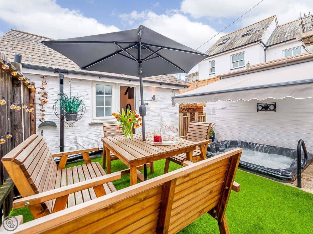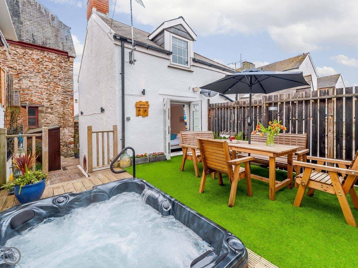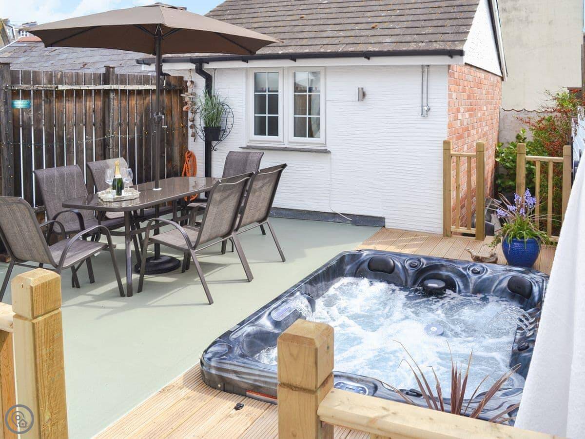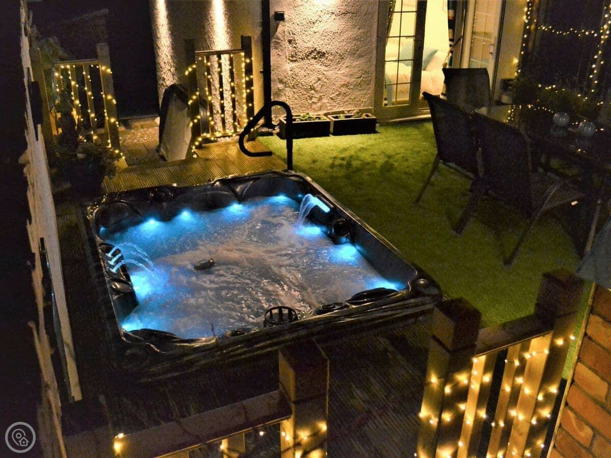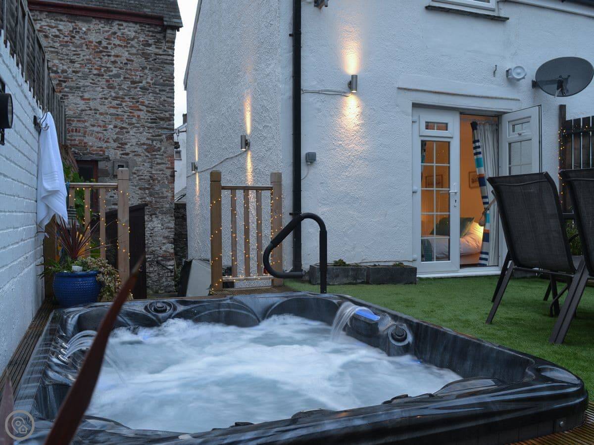 It's got a wood burner and some exposed stonework, so it's cosy. Outside, there's a private hot tub with a cover on it. The garden is enclosed.