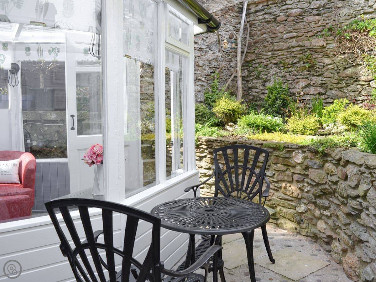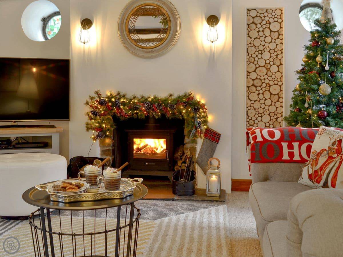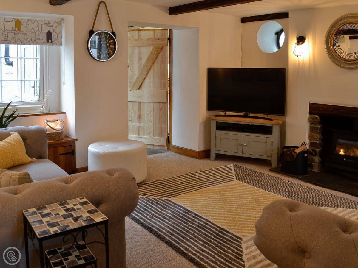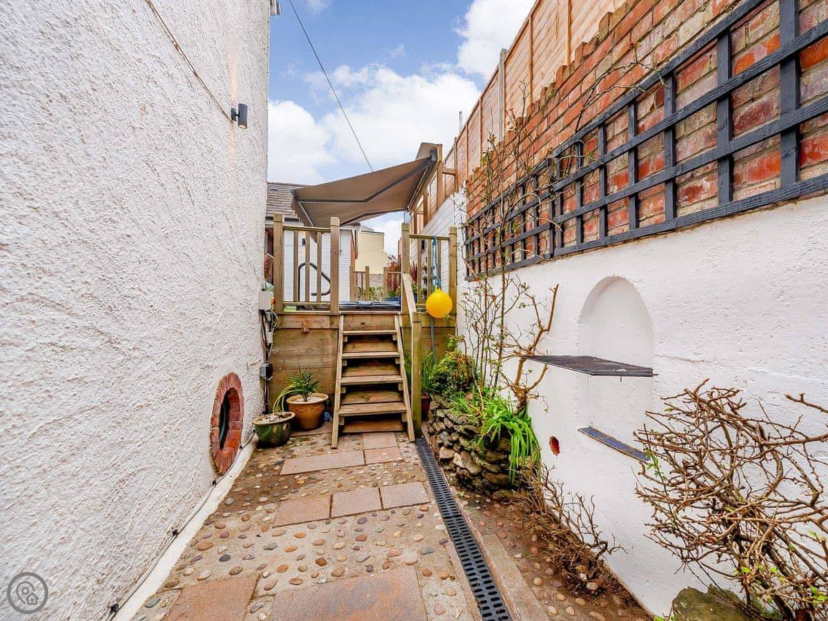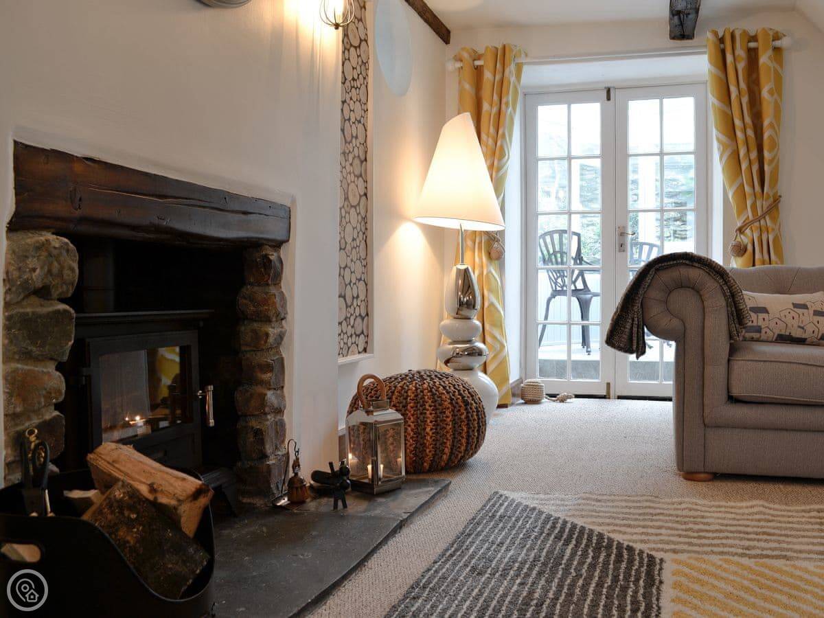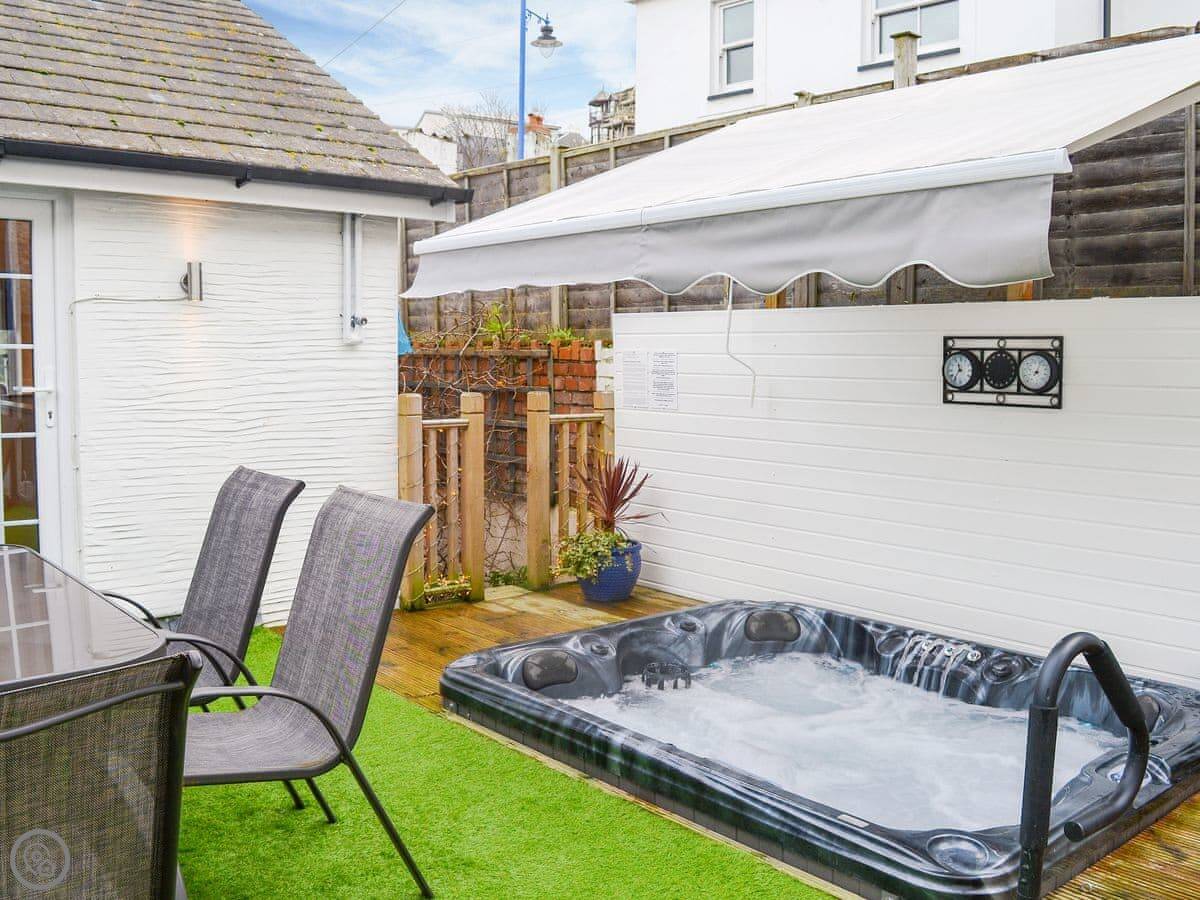 It's got a wood burner and some exposed stonework, so it's cosy. Outside, there's a private hot tub with a cover on it. The garden is enclosed.