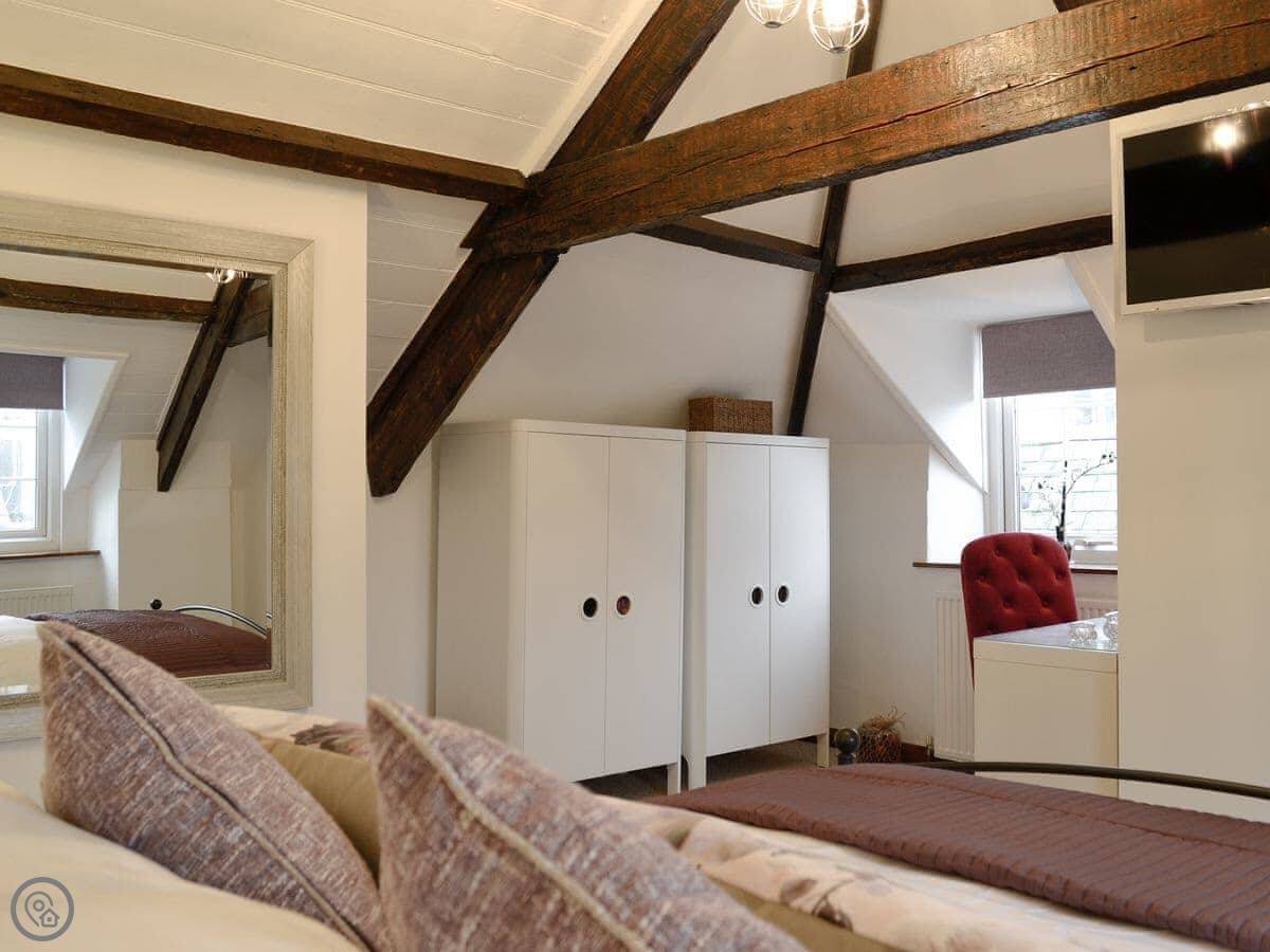 The place sleeps six. There are three bedrooms and each one has its own bathroom. It used to be two cottages, so there are two separate staircases, one at each end of the house. The stairs are typical for an old place.