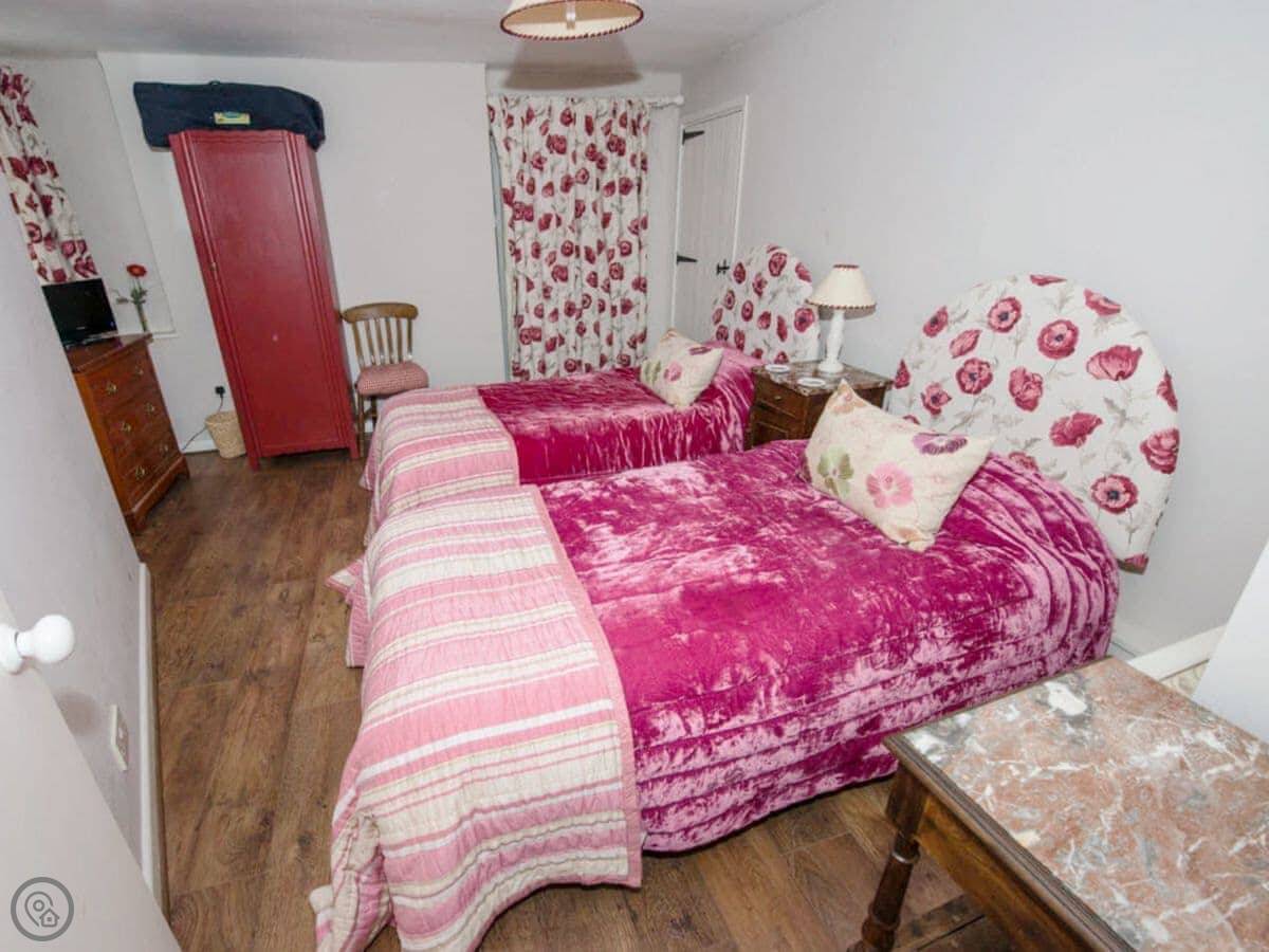 It's a 4 Star place, sleeps four. There are three bedrooms and two bathrooms, which is handy. One pet is allowed. The stairs are fairly typical for a cottage, so they're a bit steeper than in a modern house.
