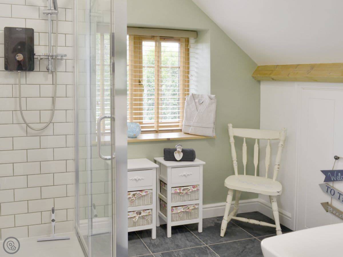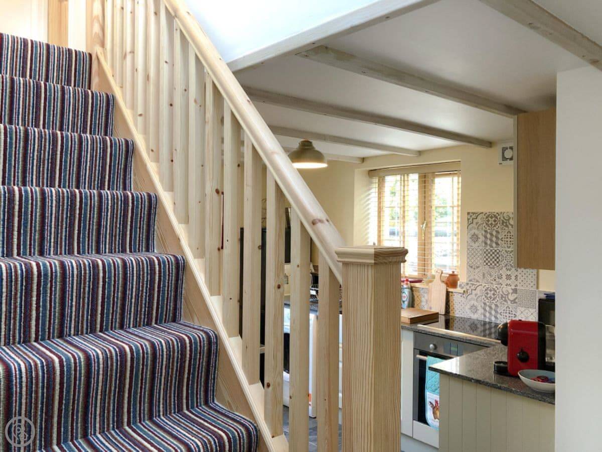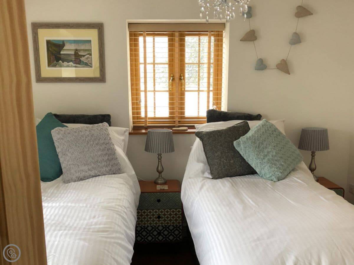 It sleeps four. Two bedrooms, both with king size beds. One bedroom is downstairs and has its own shower room. The other is upstairs, and the main bathroom with a double shower is just across the landing. The stairs are regular stairs, not too steep.