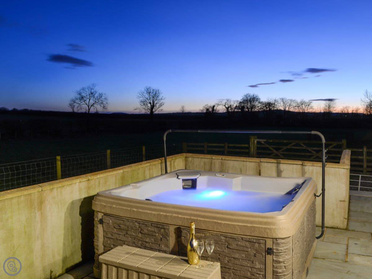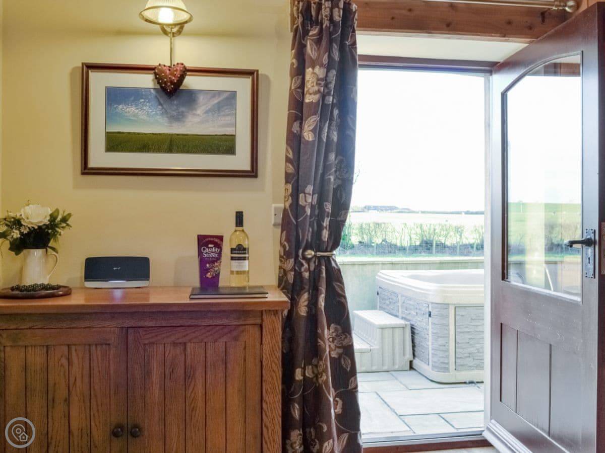 It’s modern inside. Big windows, oak beams, open plan kitchen and dining area. There’s a separate living room with a sofa. The patio doors open onto your own bit of garden with a hot tub and a table.