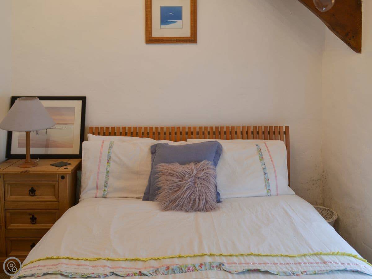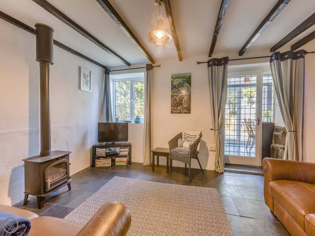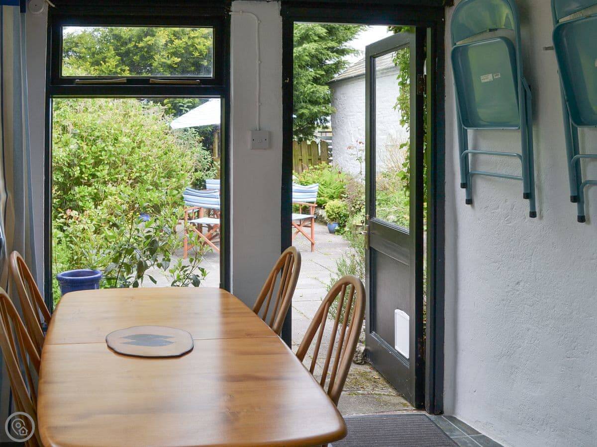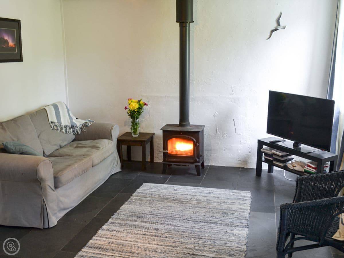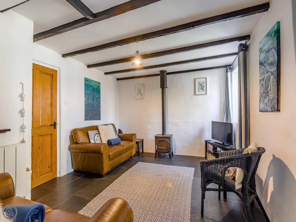 The garden is enclosed, which is good if you're bringing a dog or have kids. You can sit out there. Inside, there's a wood burner for cool evenings. The stairs are a typical cottage staircase, so they're a bit steep.