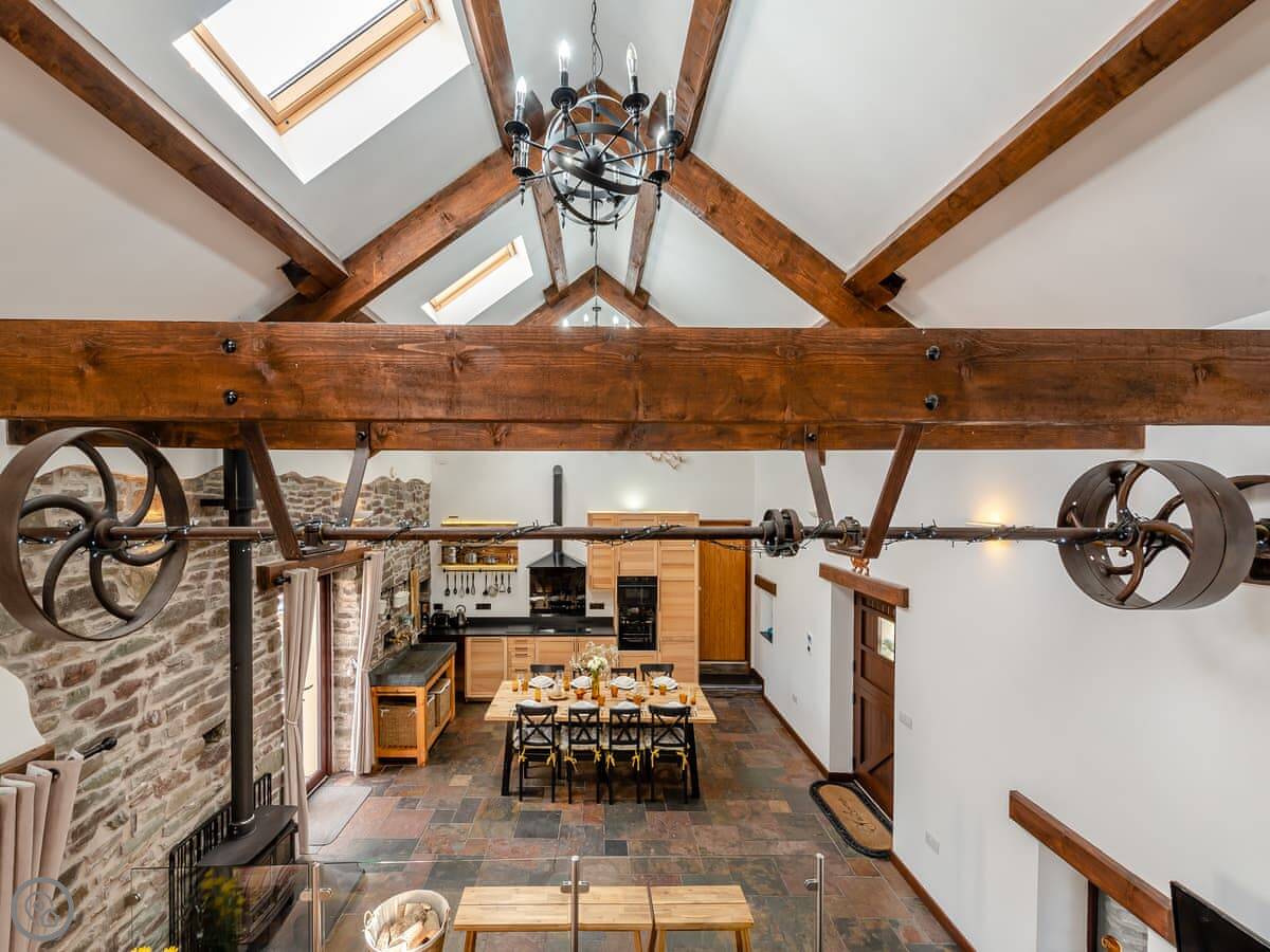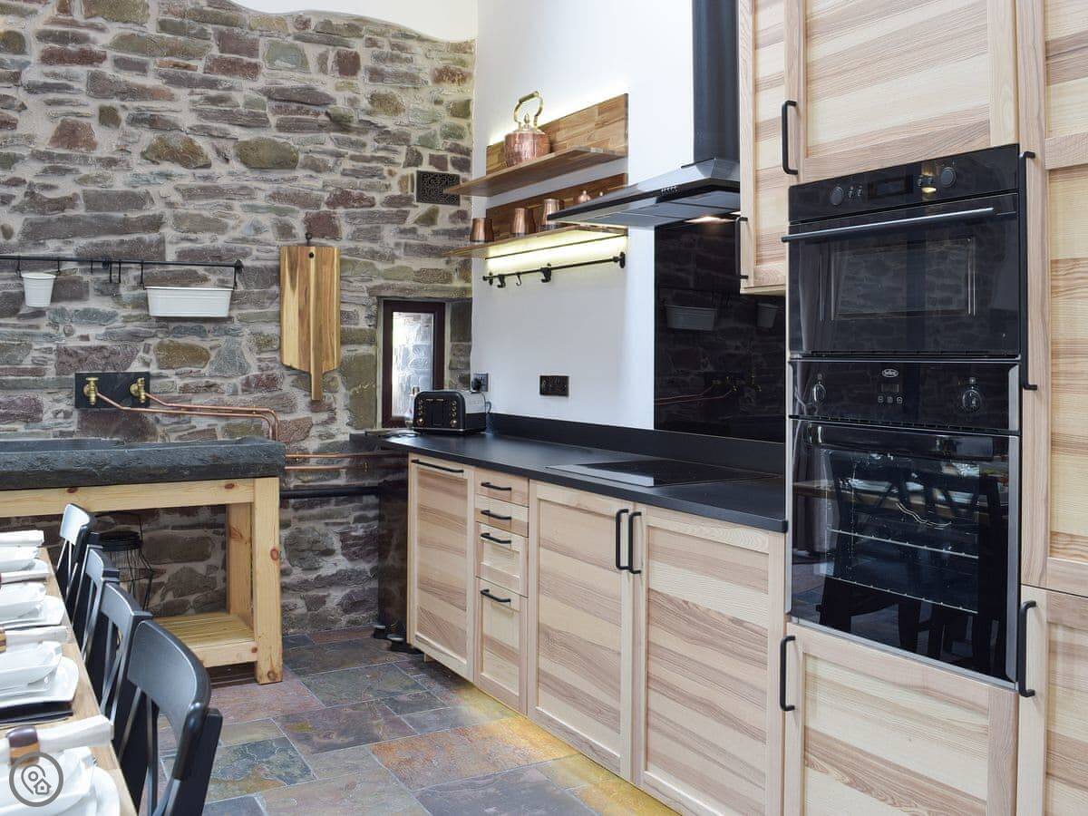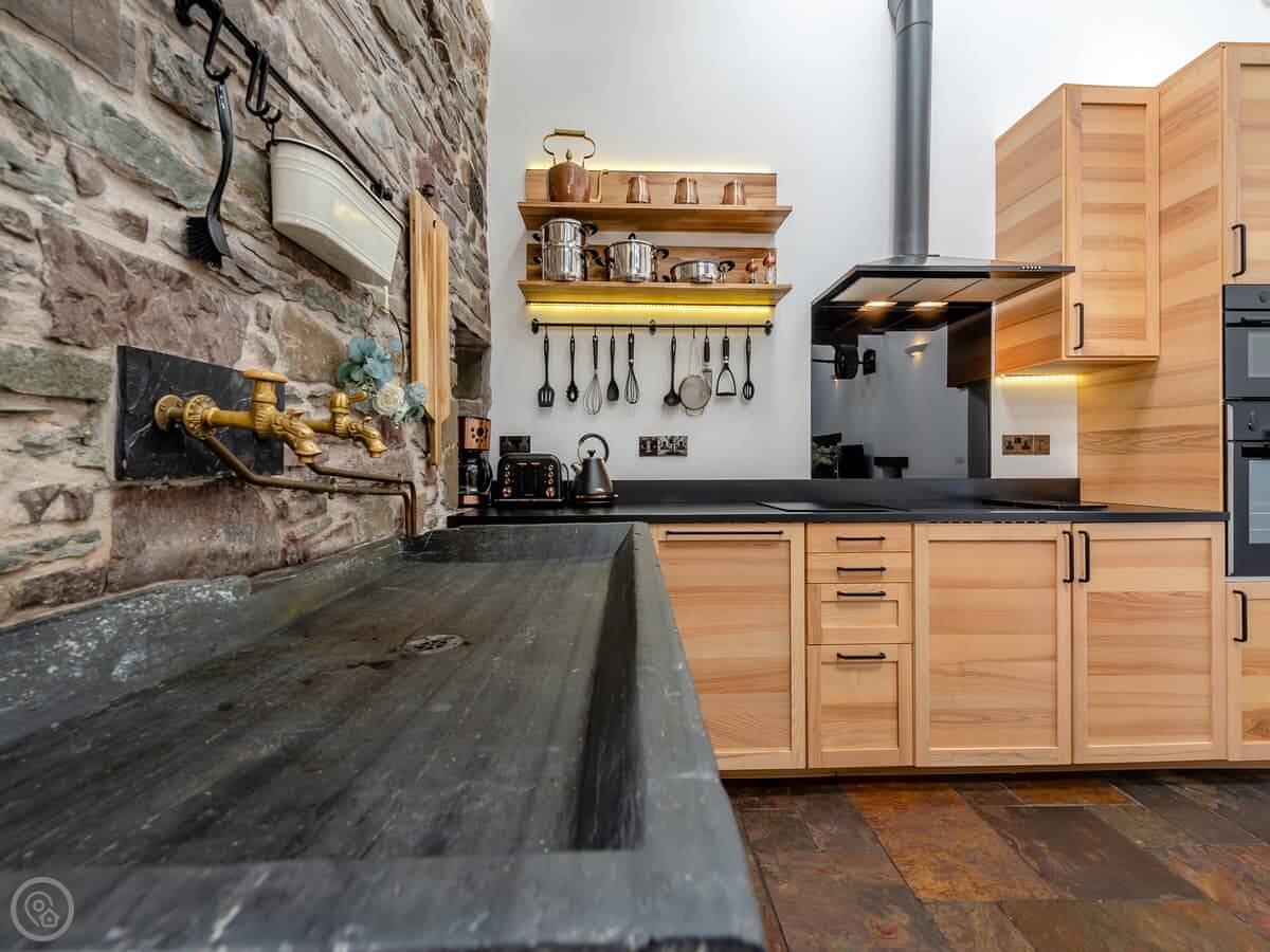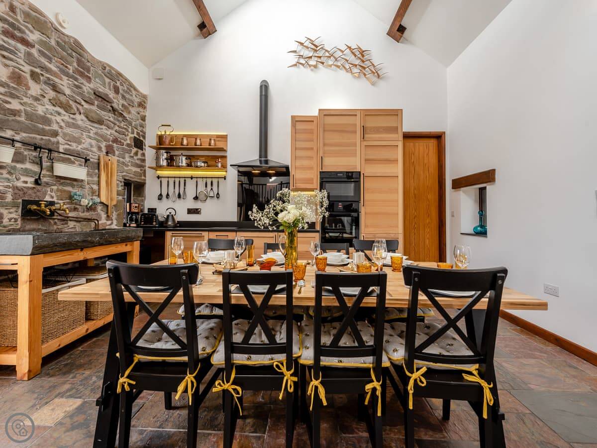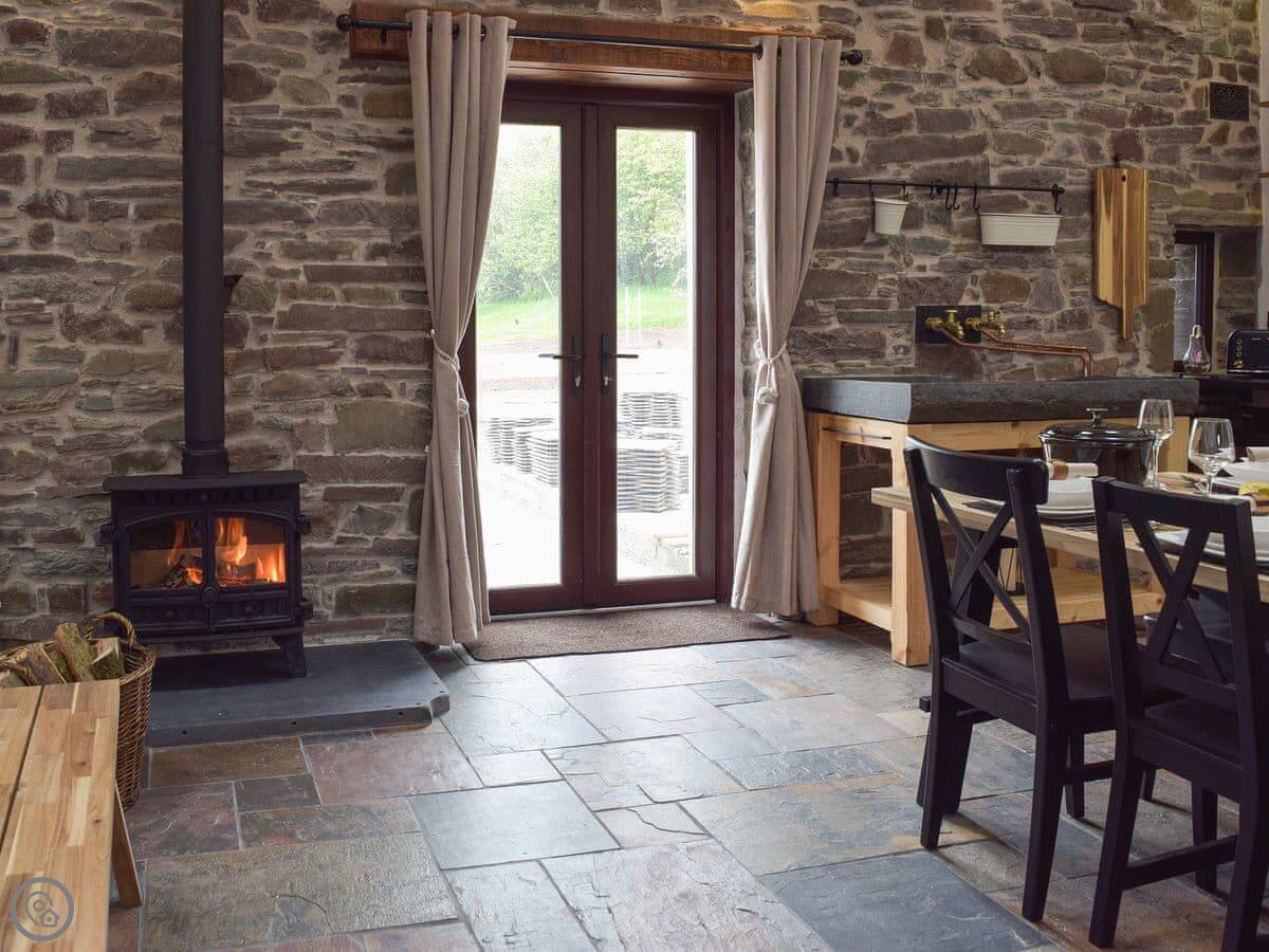 There's a big open plan kitchen and living area on the ground floor. It has a wood burner for cooler evenings. The kitchen floor is slate, and there's an old slate slab built into it. Outside, there's a hot tub on the patio and a private swimming pool in the garden. It's for your use only, not shared.