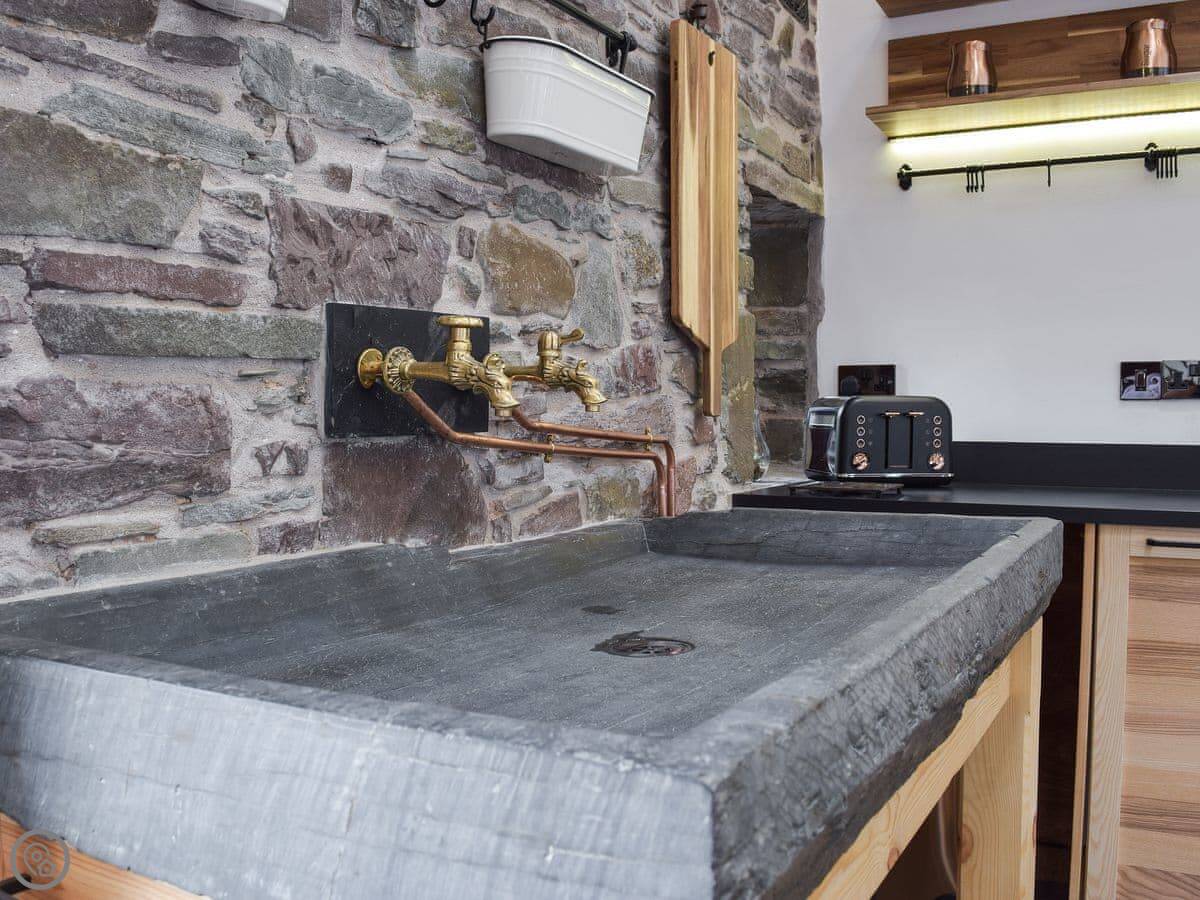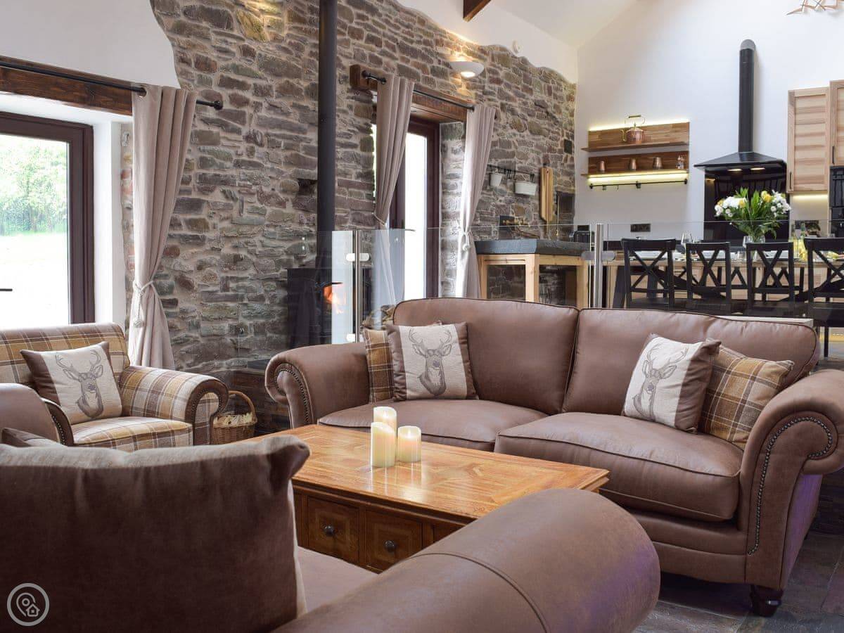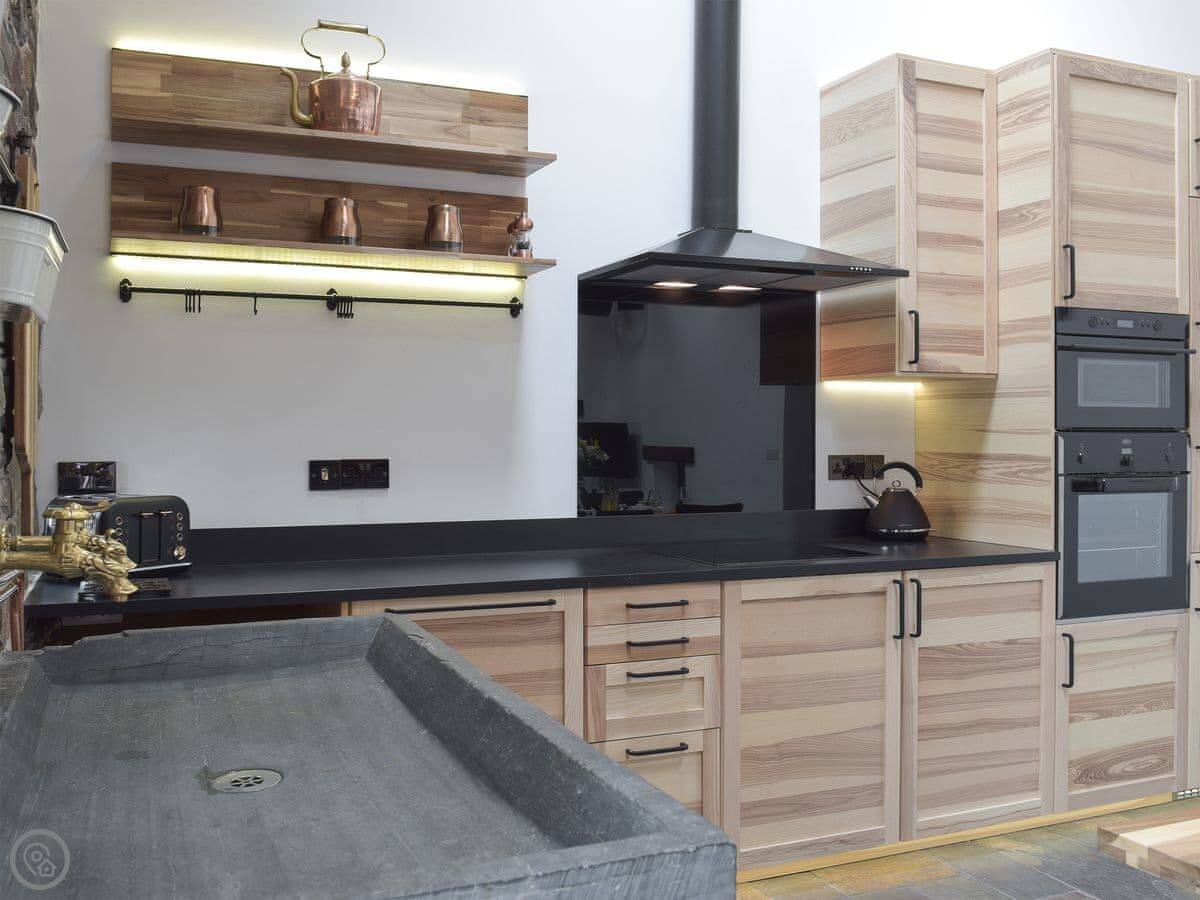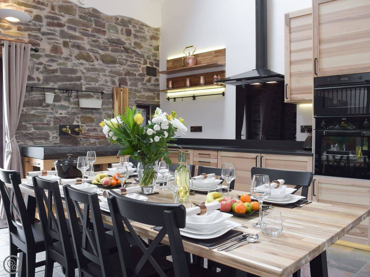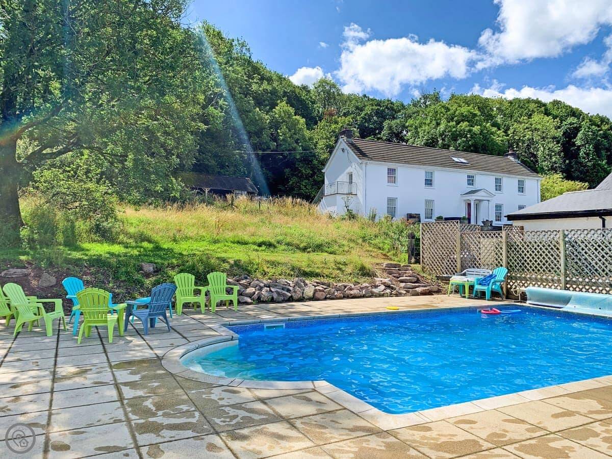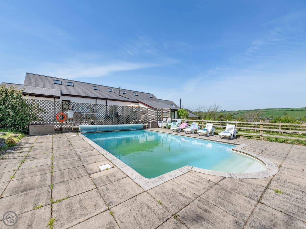 There's a big open plan kitchen and living area on the ground floor. It has a wood burner for cooler evenings. The kitchen floor is slate, and there's an old slate slab built into it. Outside, there's a hot tub on the patio and a private swimming pool in the garden. It's for your use only, not shared.
