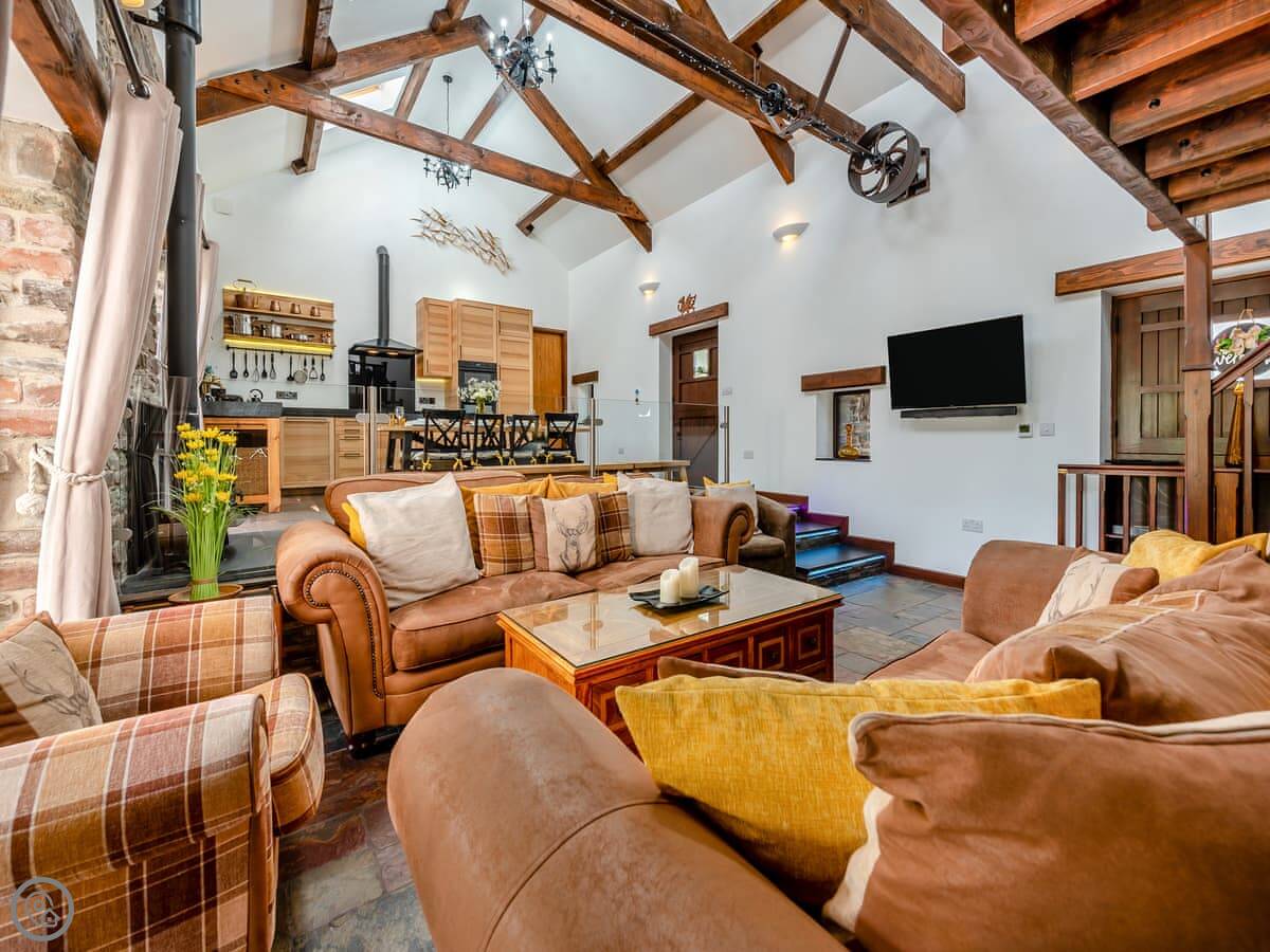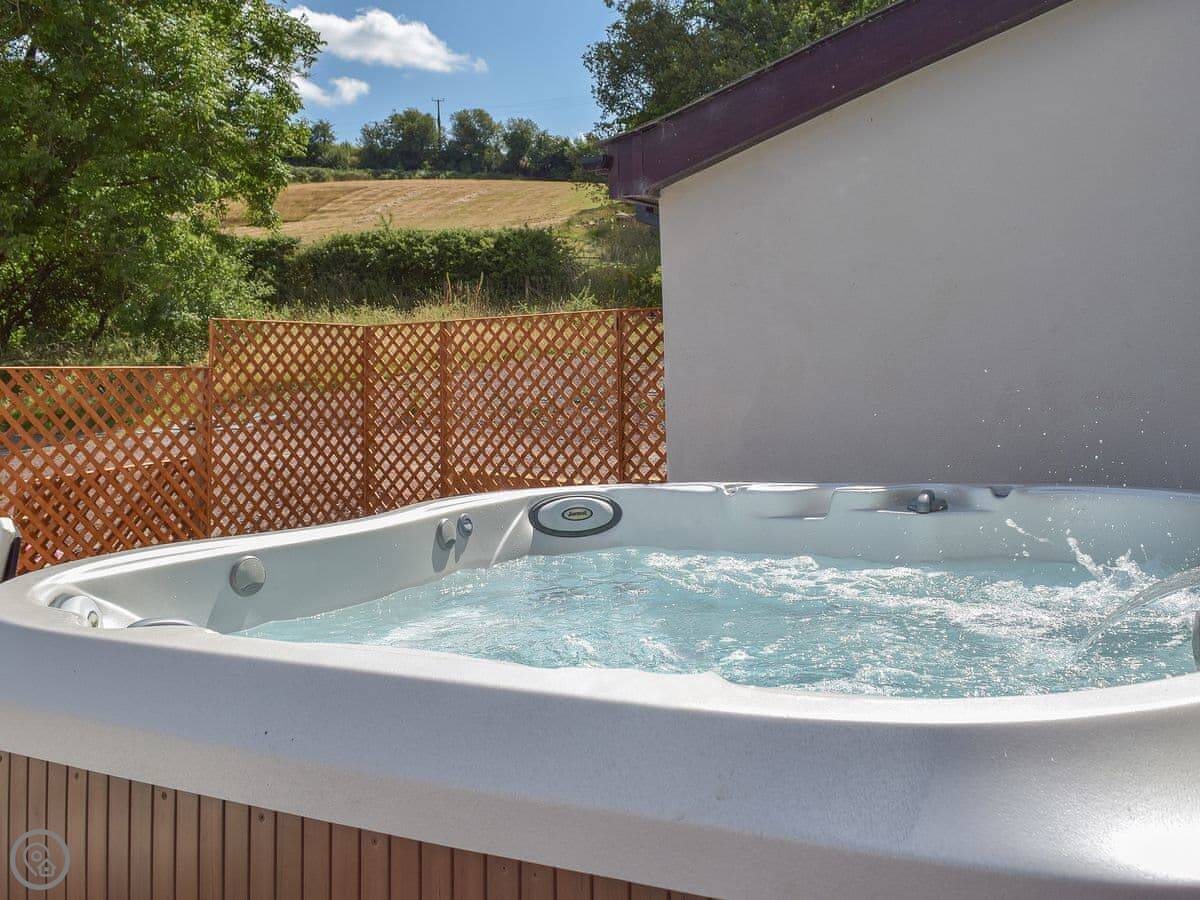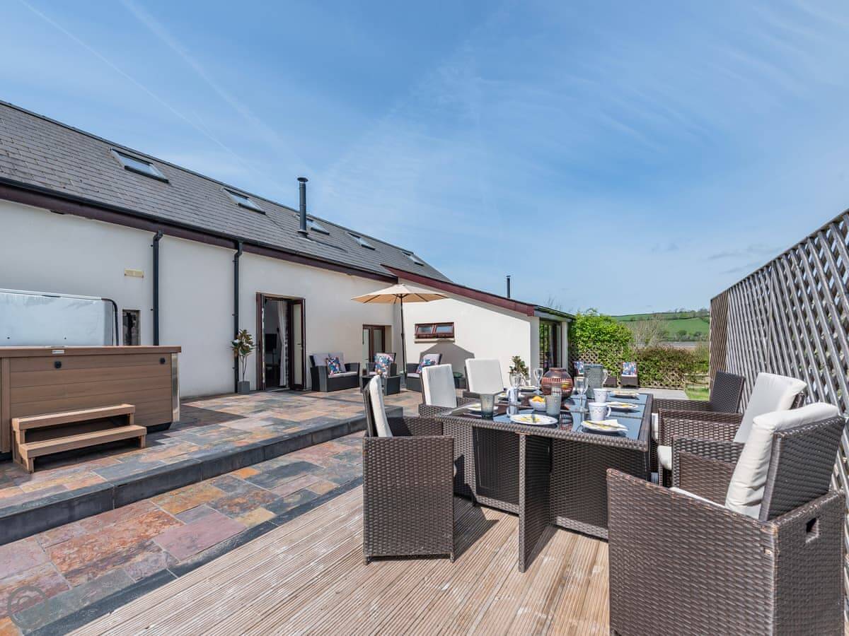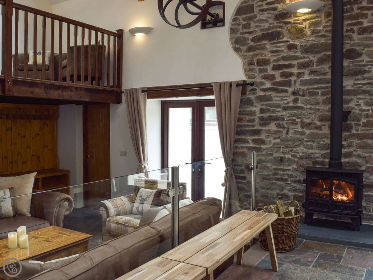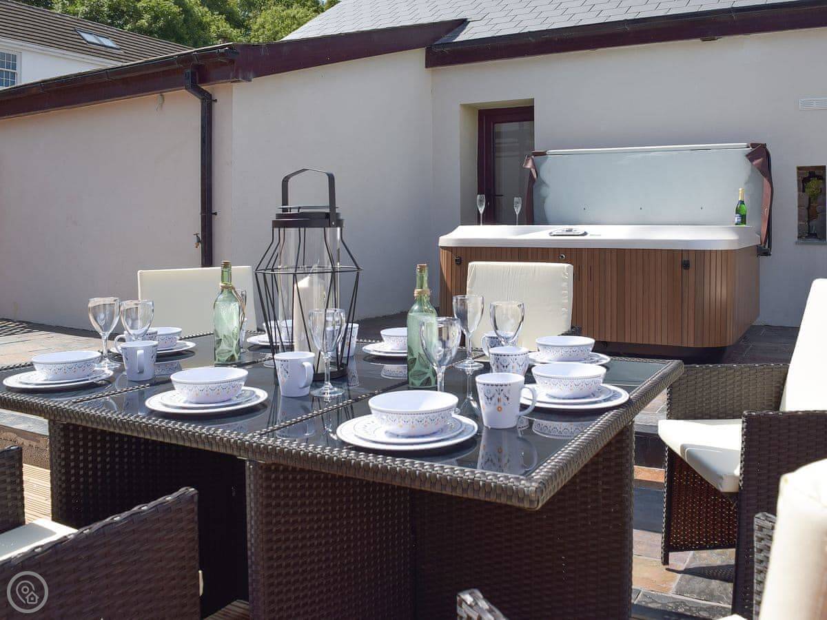 There's a big open plan kitchen and living area on the ground floor. It has a wood burner for cooler evenings. The kitchen floor is slate, and there's an old slate slab built into it. Outside, there's a hot tub on the patio and a private swimming pool in the garden. It's for your use only, not shared.