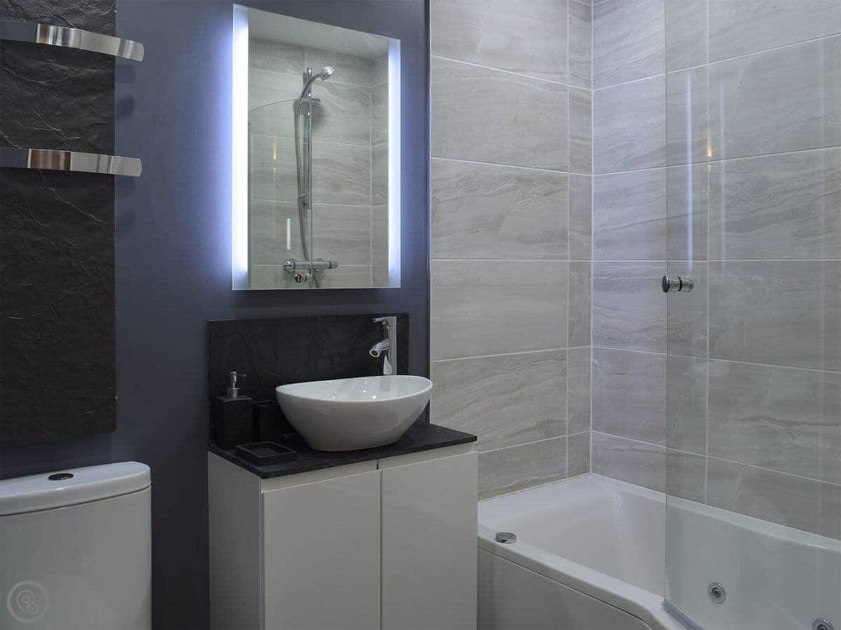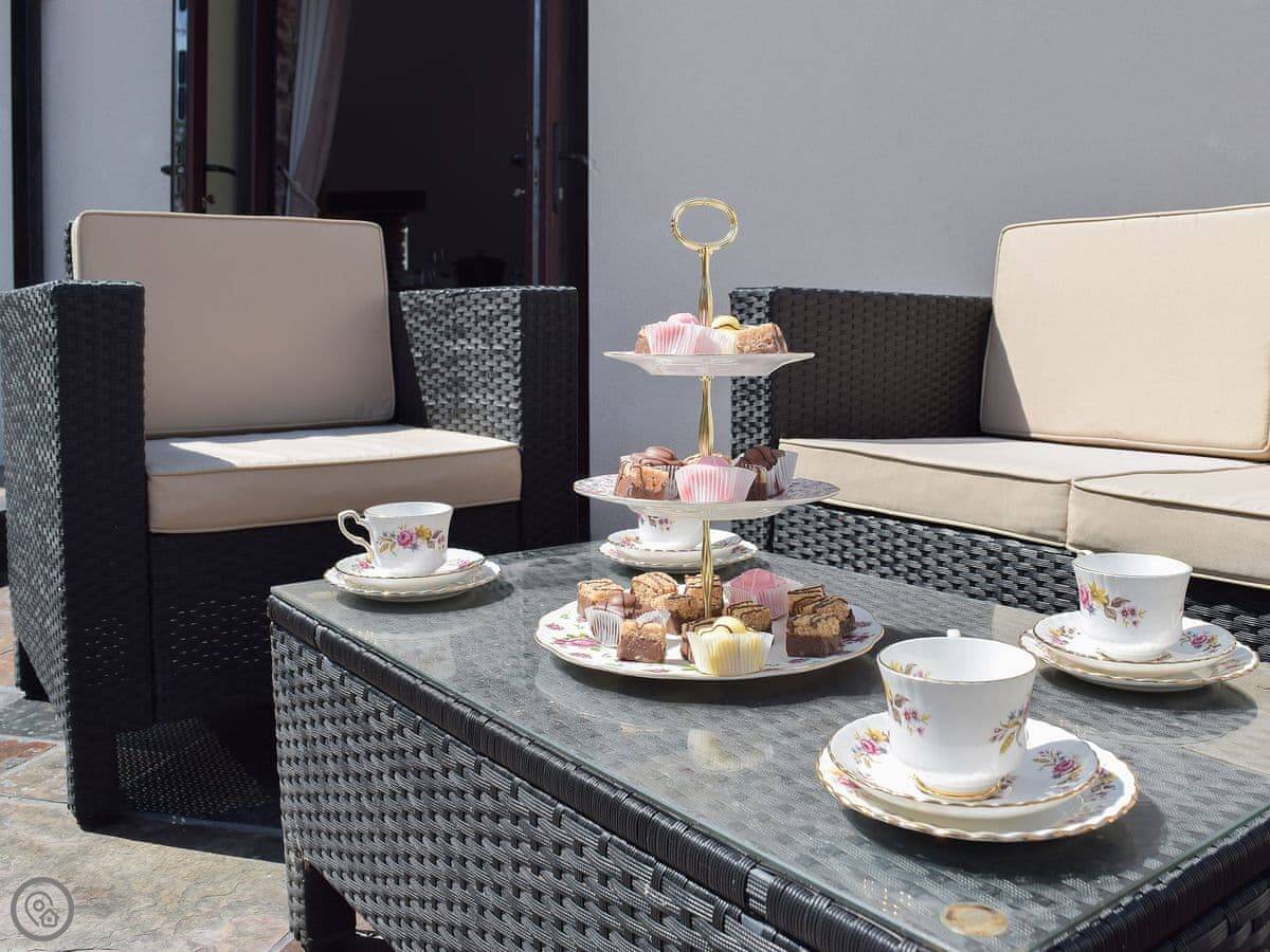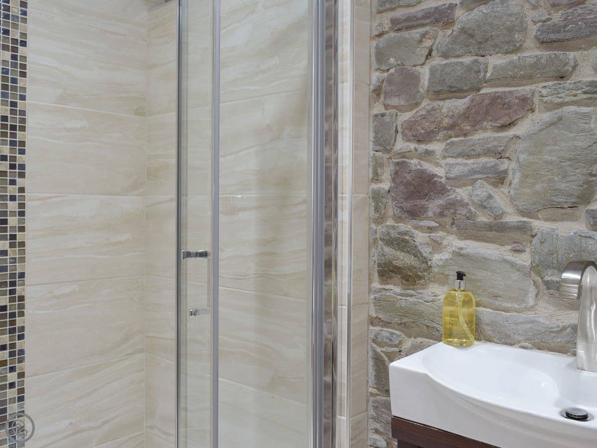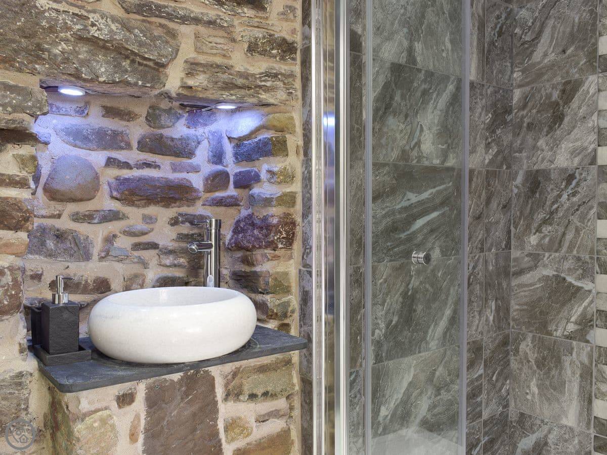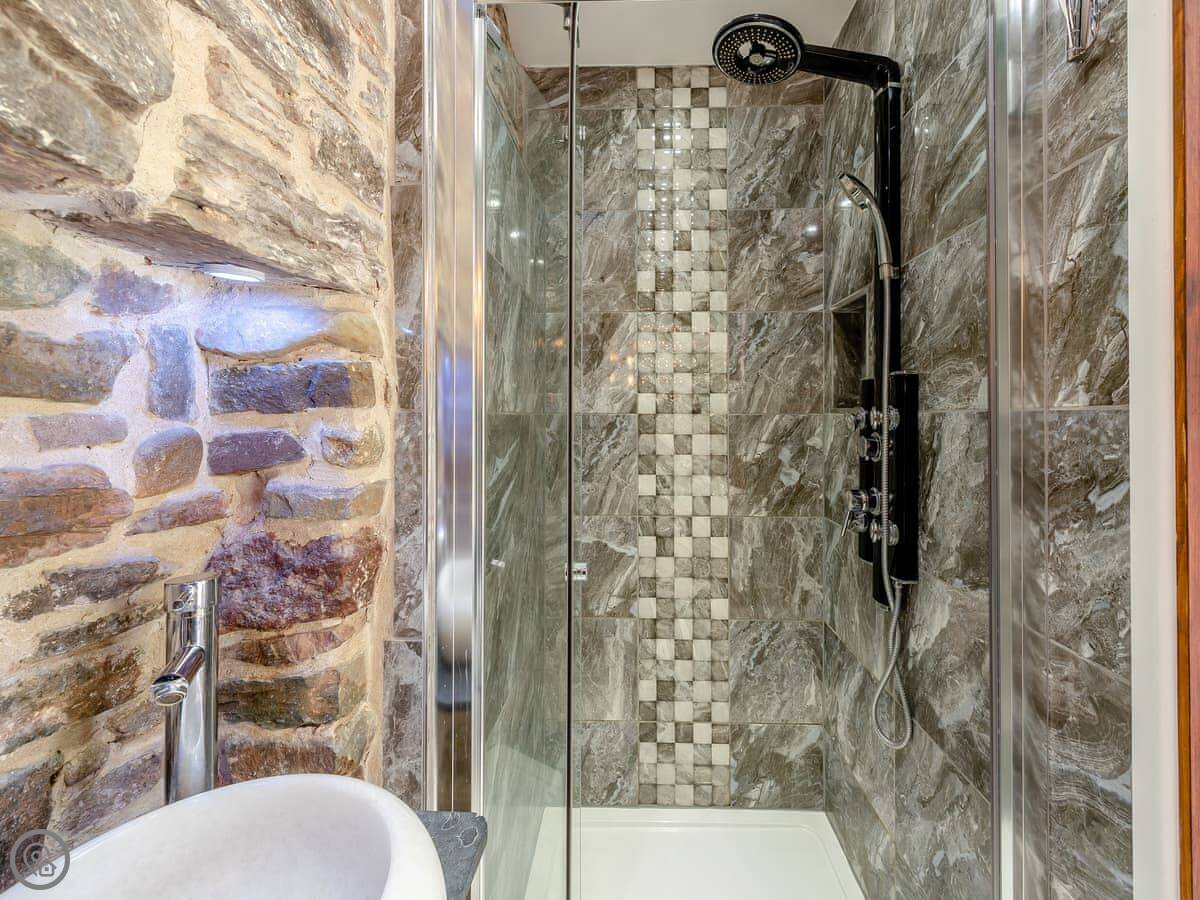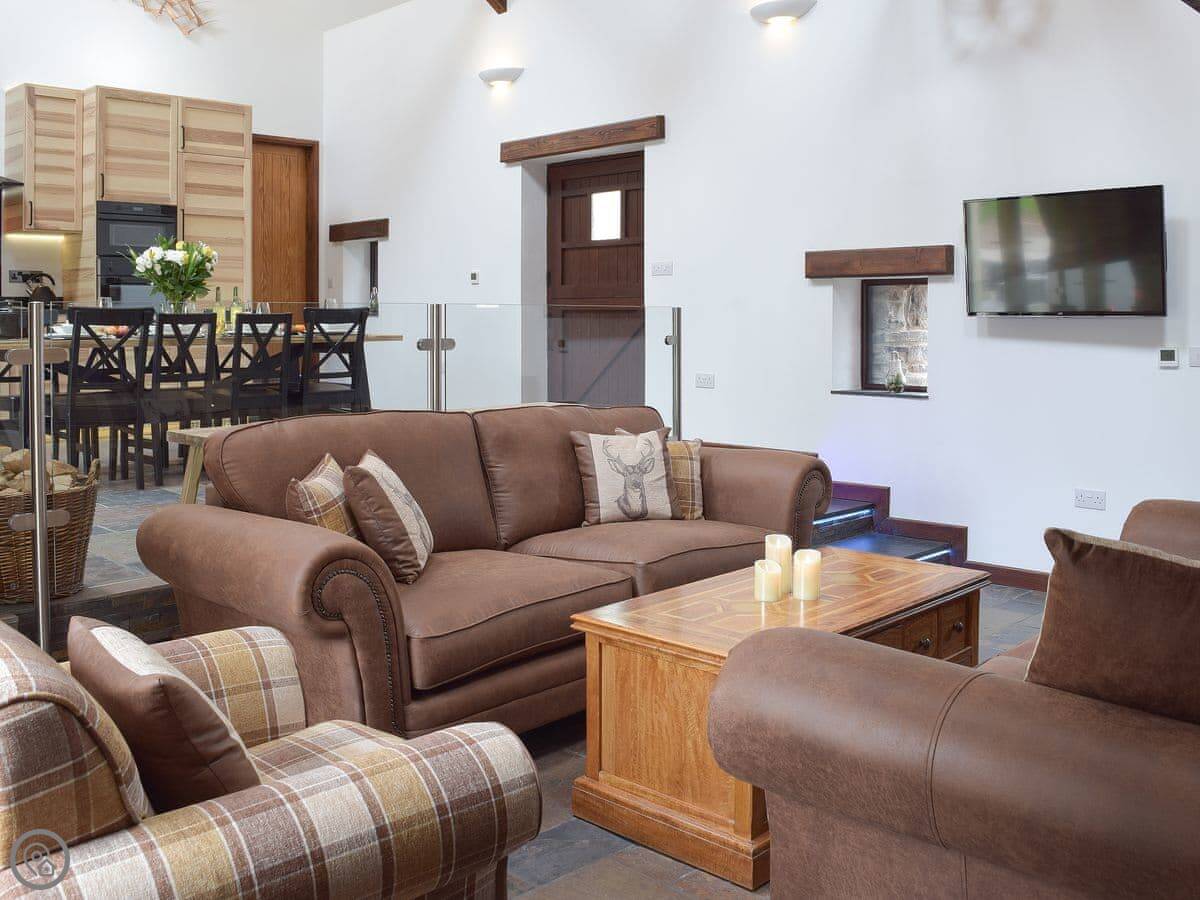 There's a big open plan kitchen and living area on the ground floor. It has a wood burner for cooler evenings. The kitchen floor is slate, and there's an old slate slab built into it. Outside, there's a hot tub on the patio and a private swimming pool in the garden. It's for your use only, not shared.